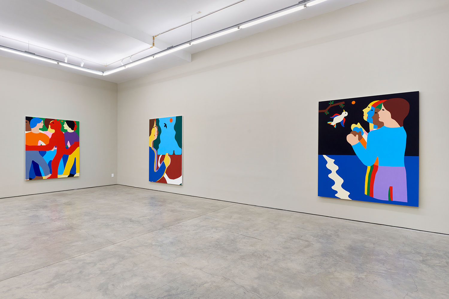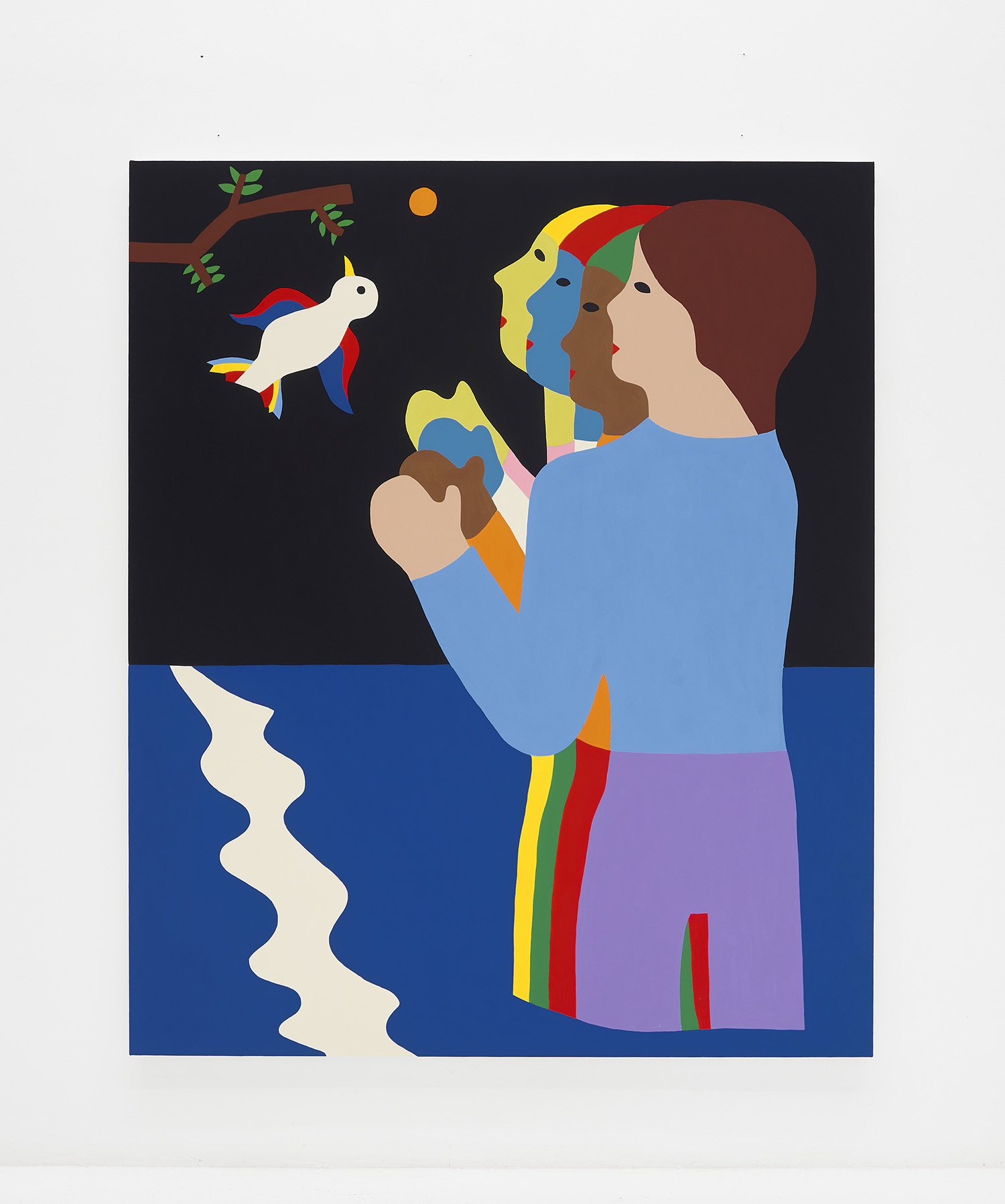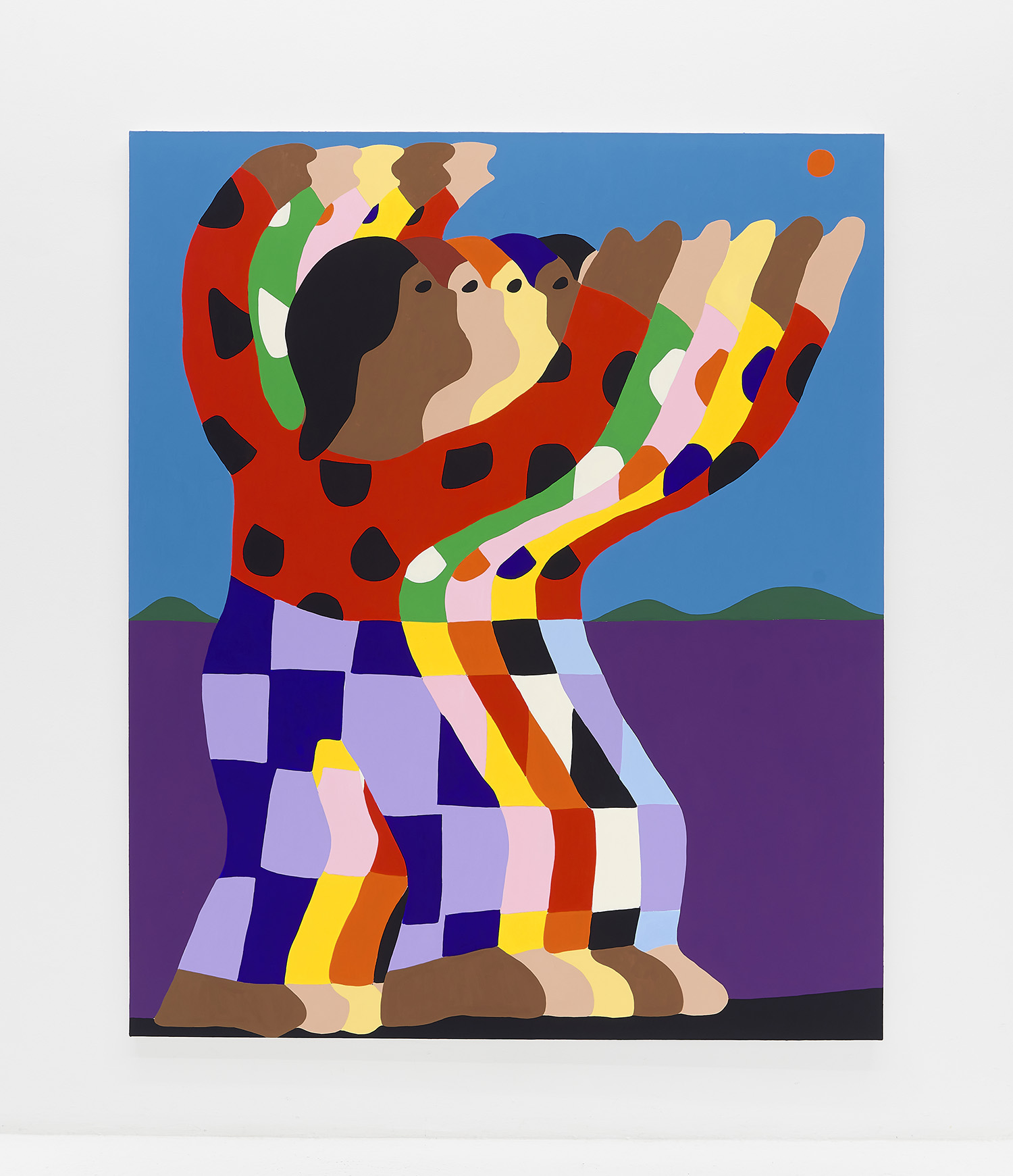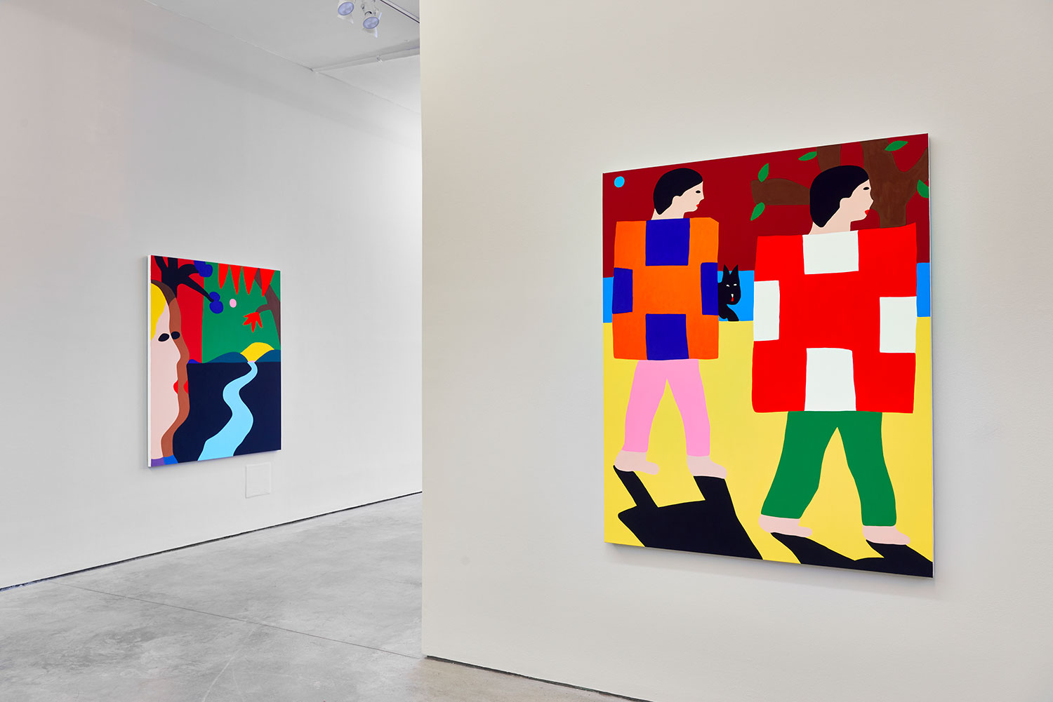 With notes of pop and improvisational energy, Ulmer’s paintings of people, animals, fruit bowls and landscapes are sure to please. They have a rudimentary vocabulary that is simple and universal, and an economy of form that cuts away the excess and exposes the root. They have the detachment of Donald Baechler or Baldessari, the “wrongness” of Japanese punk styles, and a hint of inspiration from John Wesley in the repeated forms and comic orientation. Certainly the boxy figures, like the above, evoke both children’s toys and high fashion. Blending childlike elements and sophisticated, minimalist restraint, the paintings have an interesting resonance and style not easy to place.