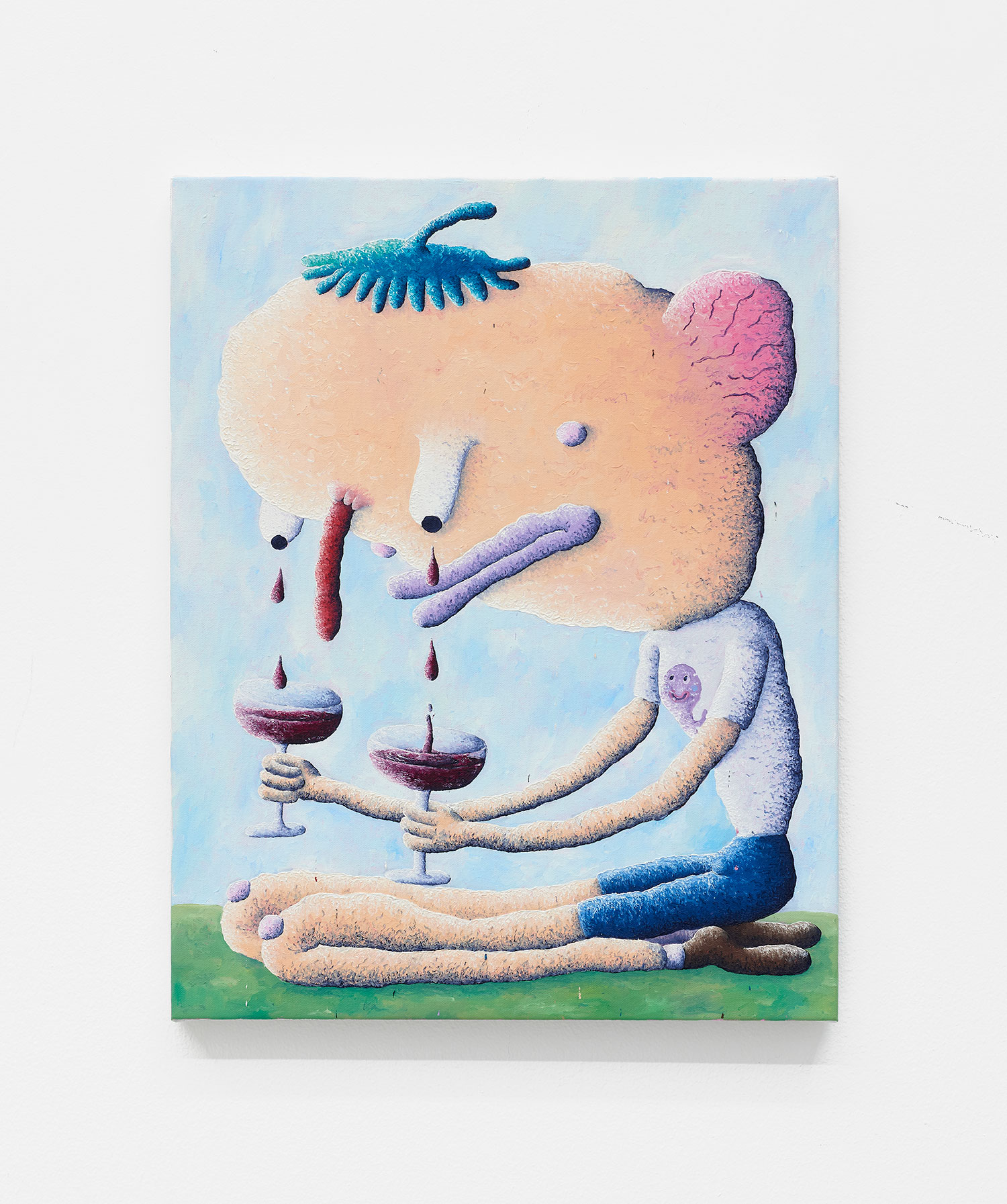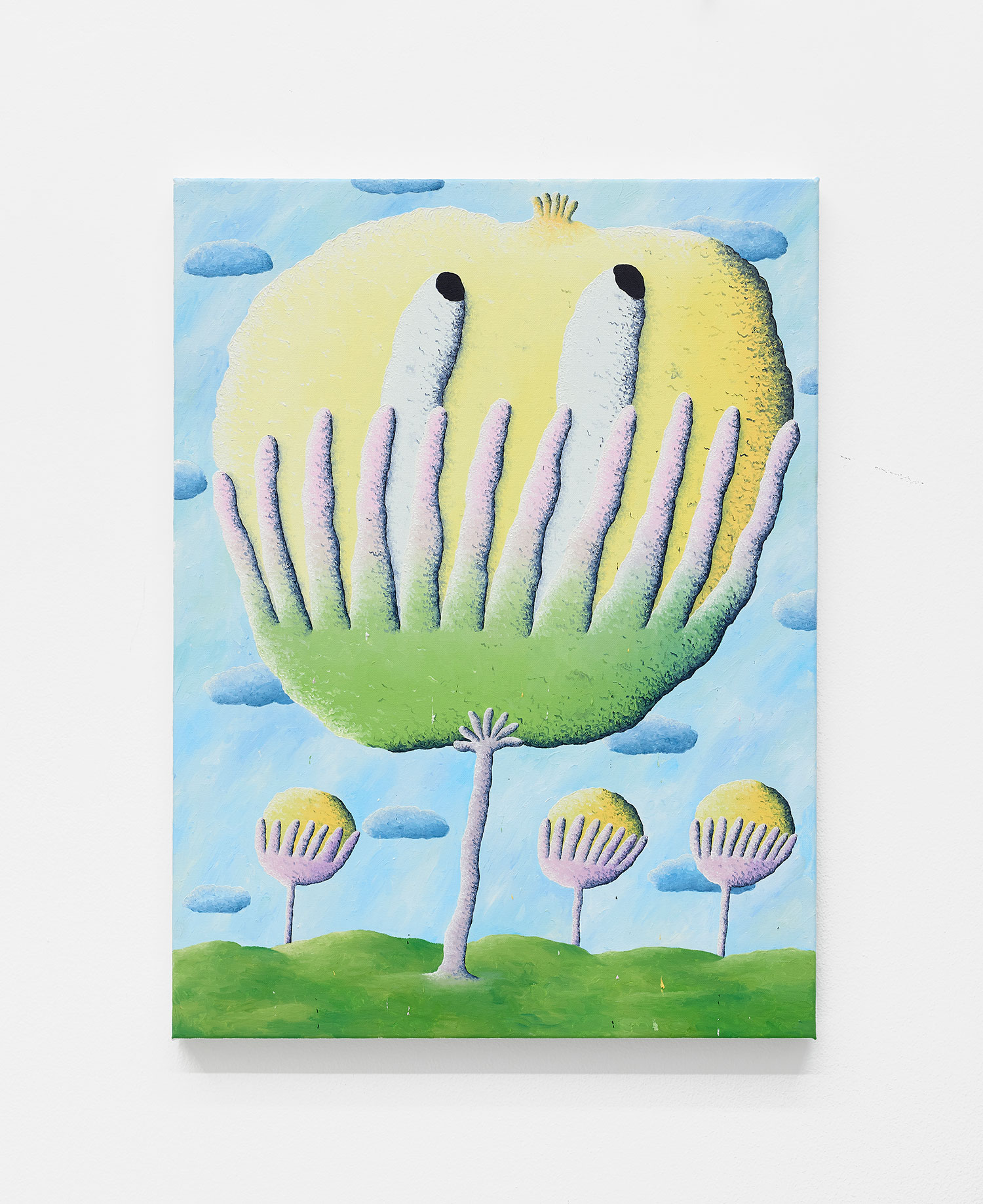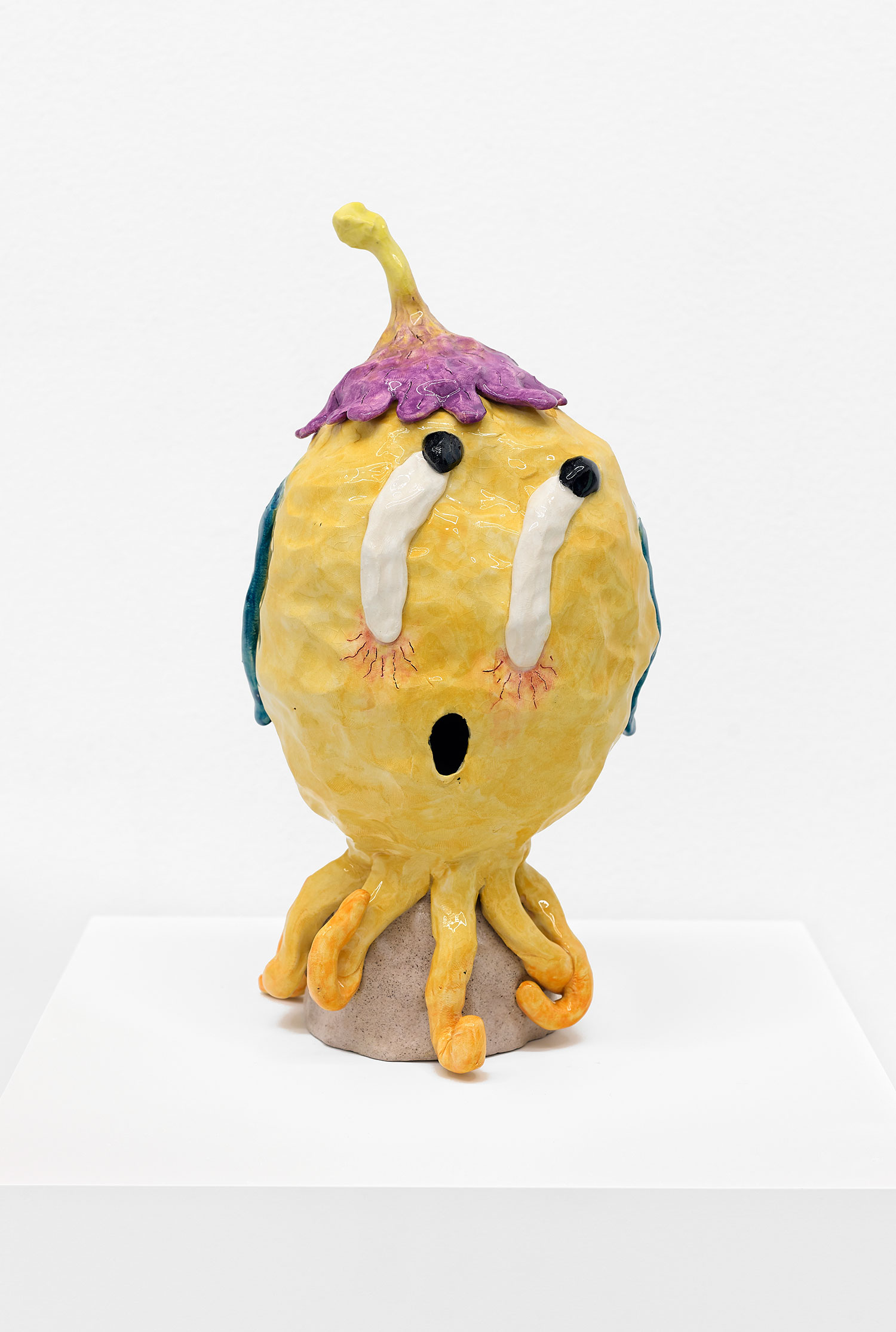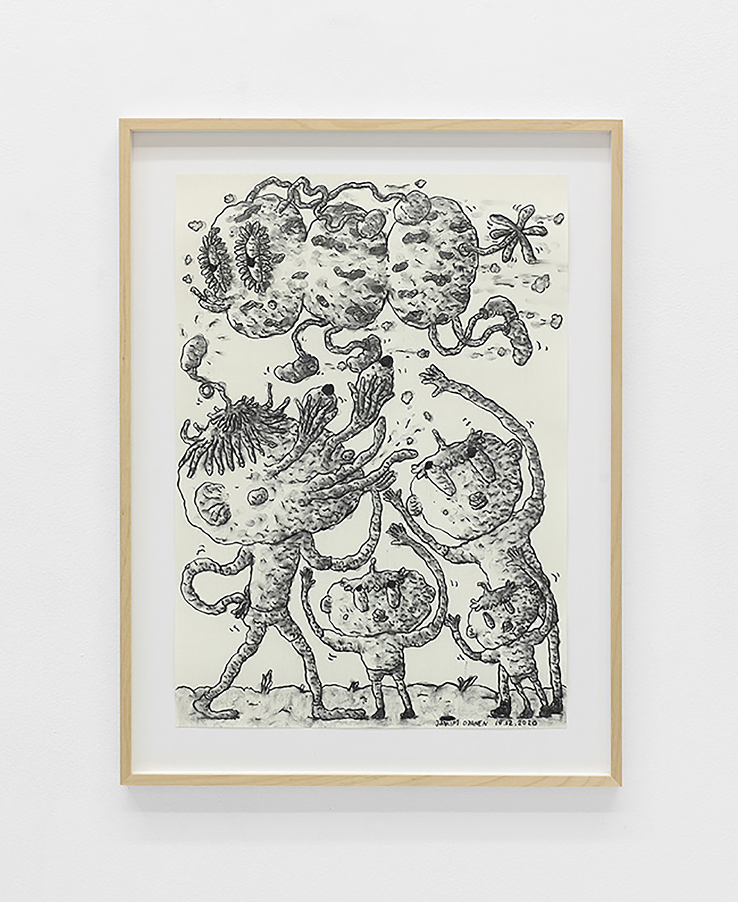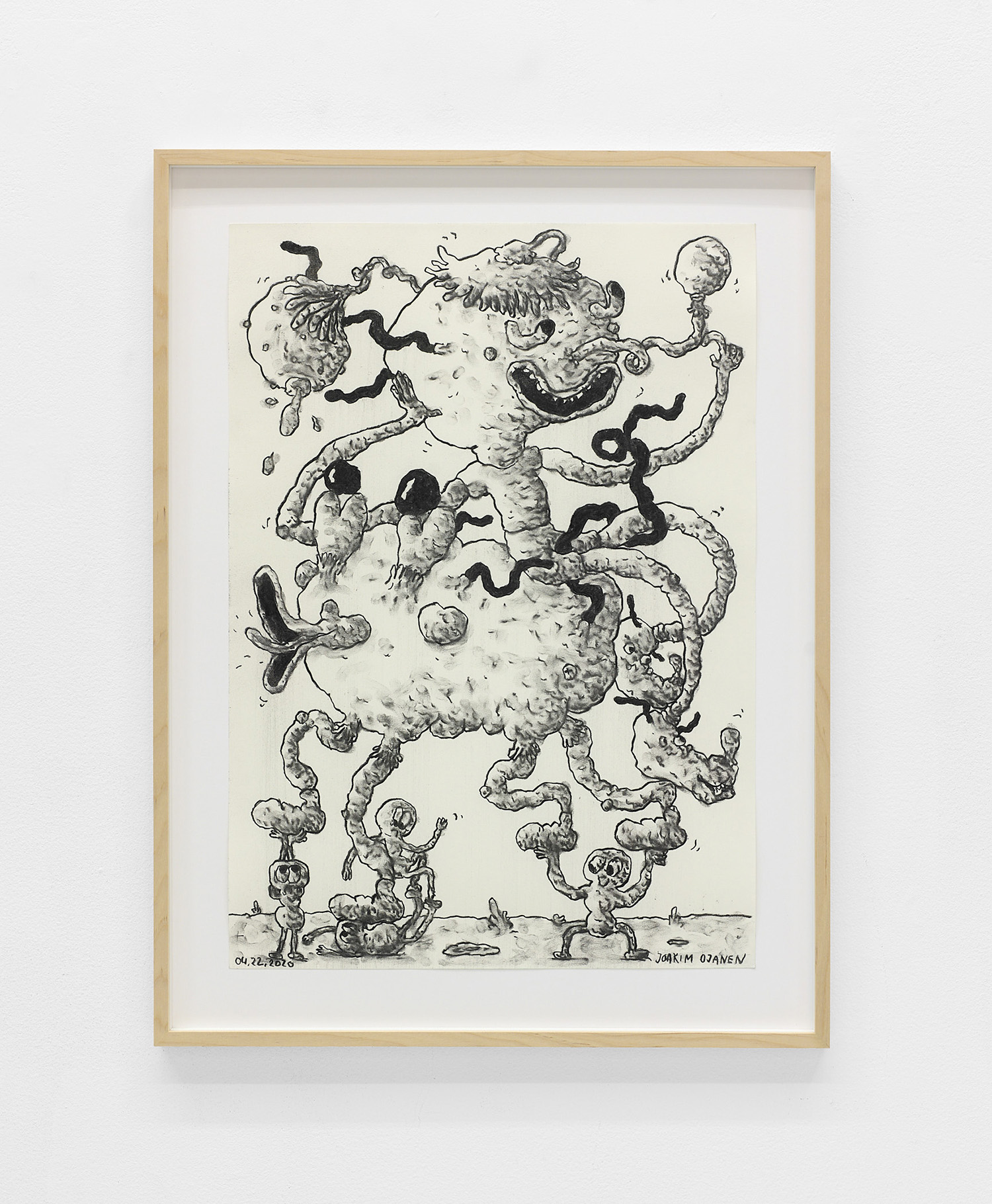 Ojanen’s career-defining style includes a multitude of uncanny adolescents, often boys, octopuses and dogs reading or at play, with surreal combinations of gangly limbs, duckbills, and dog ears that can seemingly allude to the awkwardness of bodies going through change. The artist’s playful imagination retains a childlike quality, which has been singularly effective at mourning, in turn, the loss of youth itself. With this aptly titled show, The Part You Throw Away, Ojanen’s work seems to turn more deeply inward, toward characters that are neither obviously human nor clearly gendered, and retain through their imaginative indeterminacy a direct connection to childlike wonder, which must often be discarded as one enters adult life.