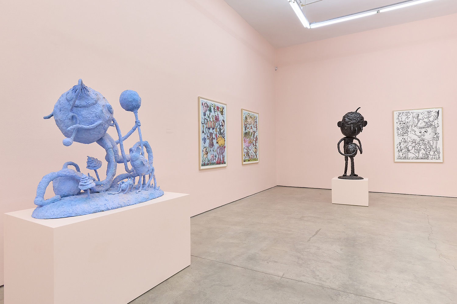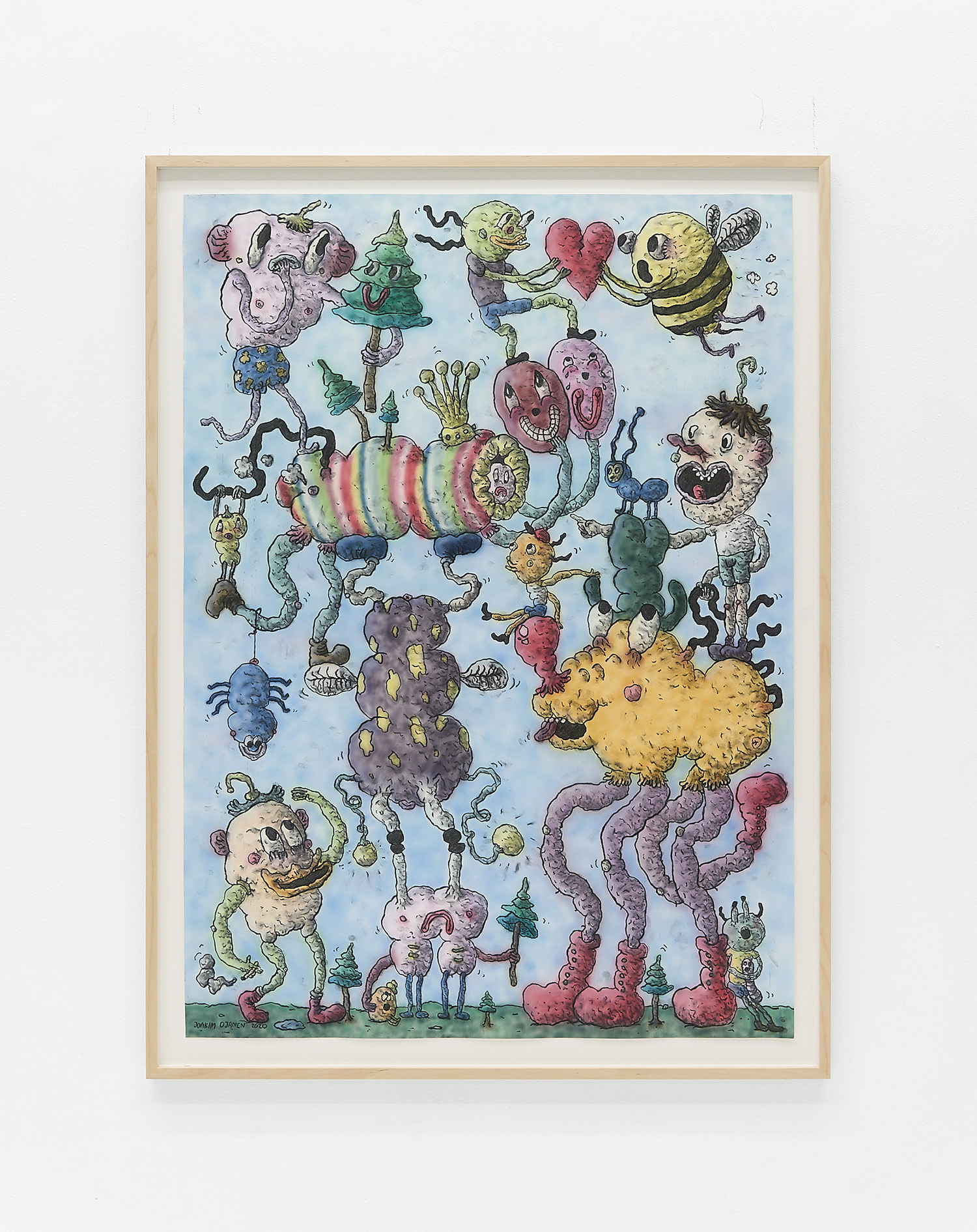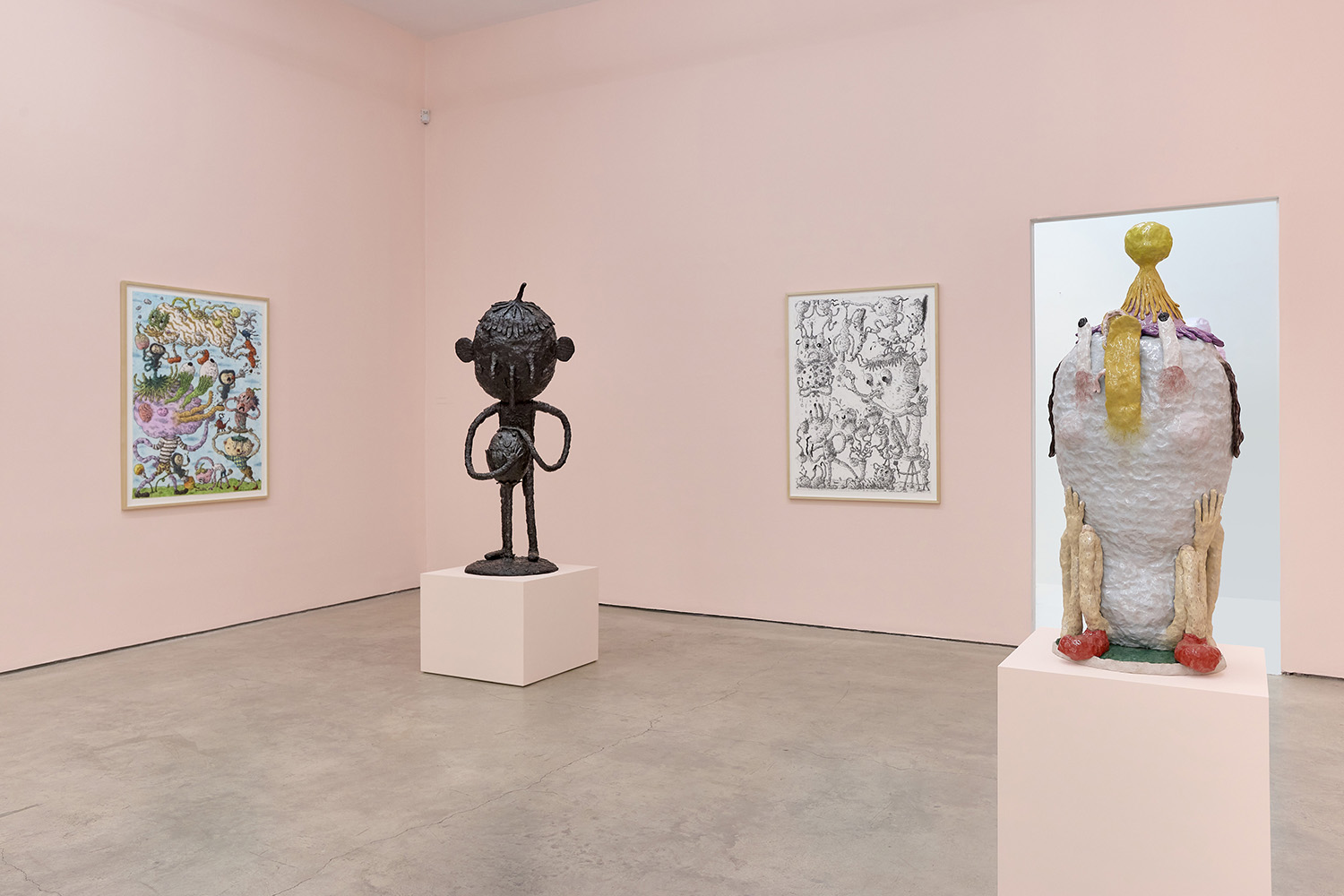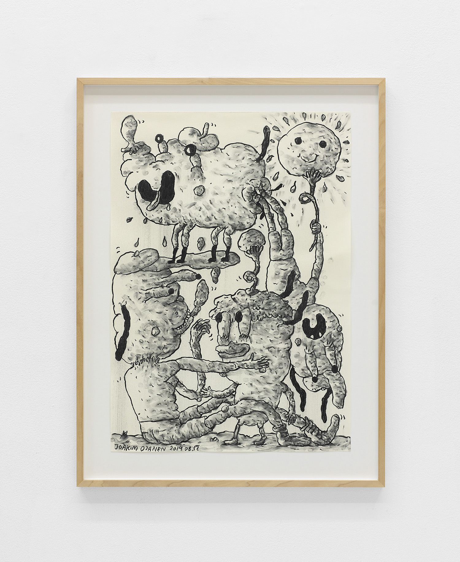 While these new sculptural figures often appear alone—or even lonely, with eyes turned to the sky as if waiting for something—Ojanen’s paintings and drawings are teeming with friends, masterfully intertwined in a Boschian array. His two-dimensional works excellently translate the artist’s figurative style, and seem to almost overflow, brimming, alongside his sculpture, with the joys of freewheeling youth.