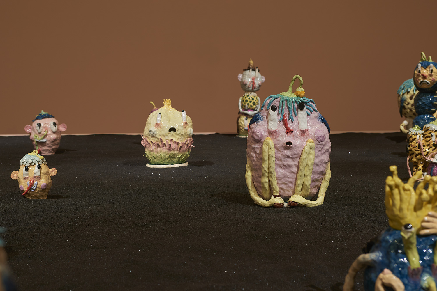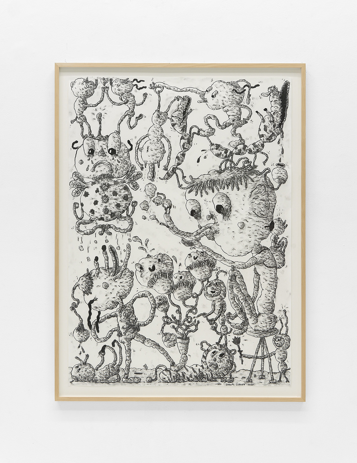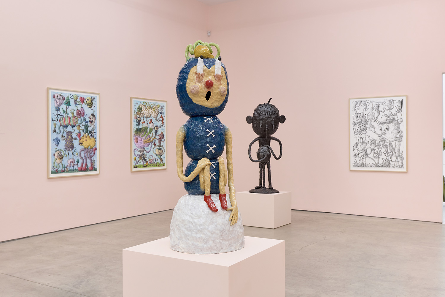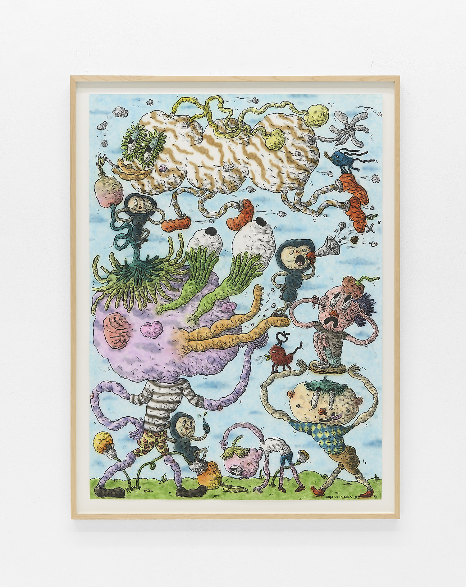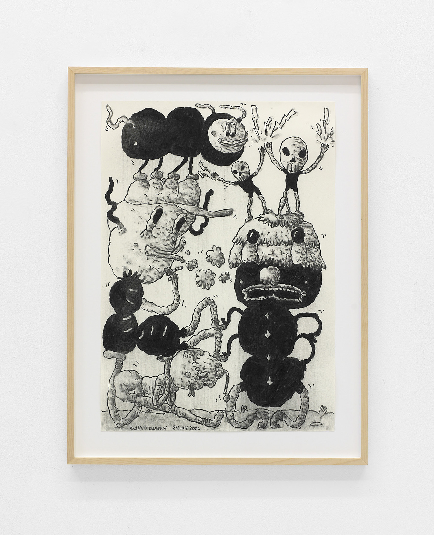 While these new sculptural figures often appear alone—or even lonely, with eyes turned to the sky as if waiting for something—Ojanen’s paintings and drawings are teeming with friends, masterfully intertwined in a Boschian array. His two-dimensional works excellently translate the artist’s figurative style, and seem to almost overflow, brimming, alongside his sculpture, with the joys of freewheeling youth.