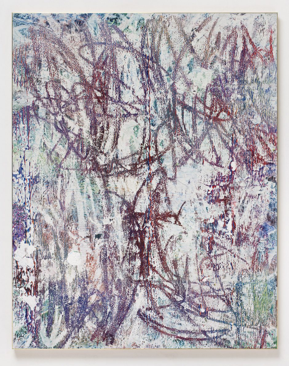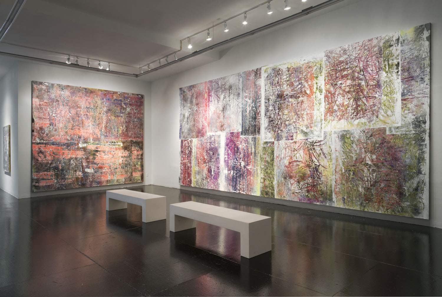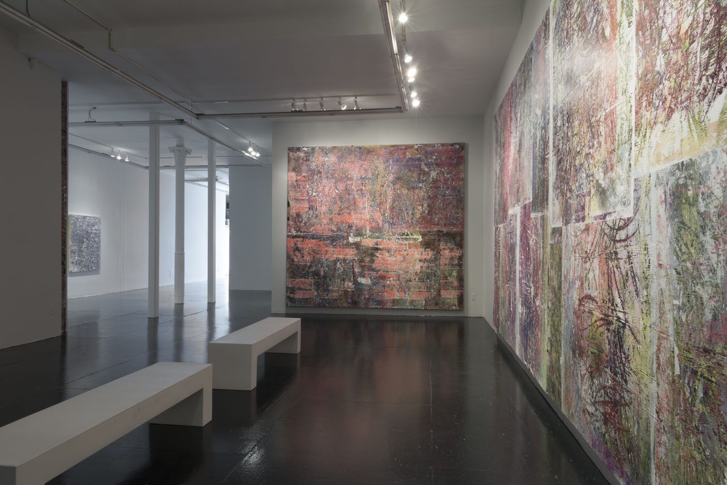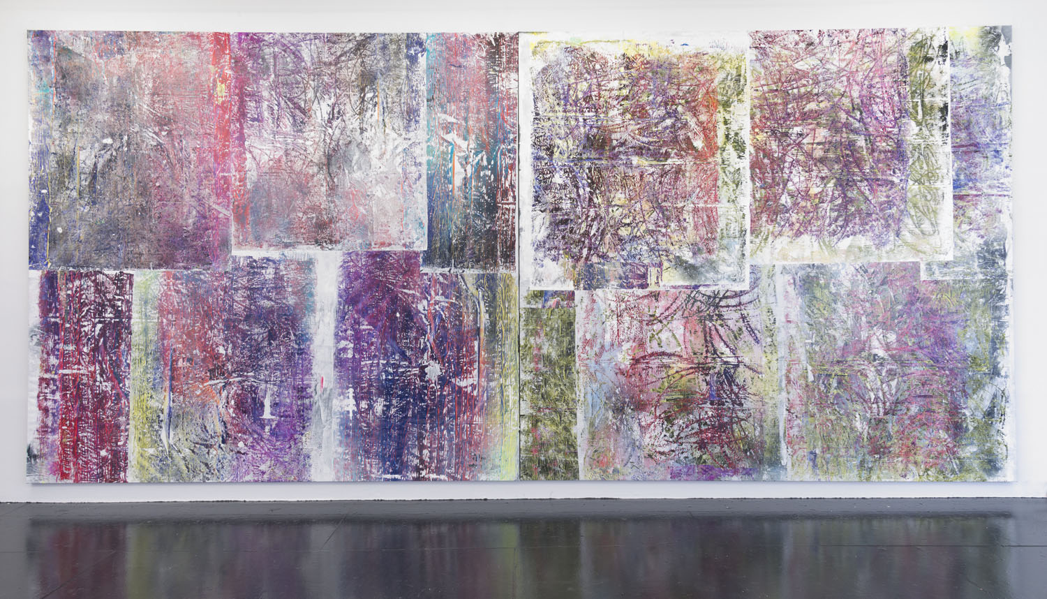 The paintings are composed in multiple “transfers” sometimes with changes in rasterization, some transferred only partially as the artist “scribbles” a wiggly line of paint to transfer onto the canvas. The compositions take on grid structures as a layer of horizontal painting is applied to a vertical layer; two works in the show are print partners, with the same shape of paint transferred back and forth, a “variable edition”. One of the enormous paintings has a six-painting transfer with different “screens” lining up to cover the expansive canvas.