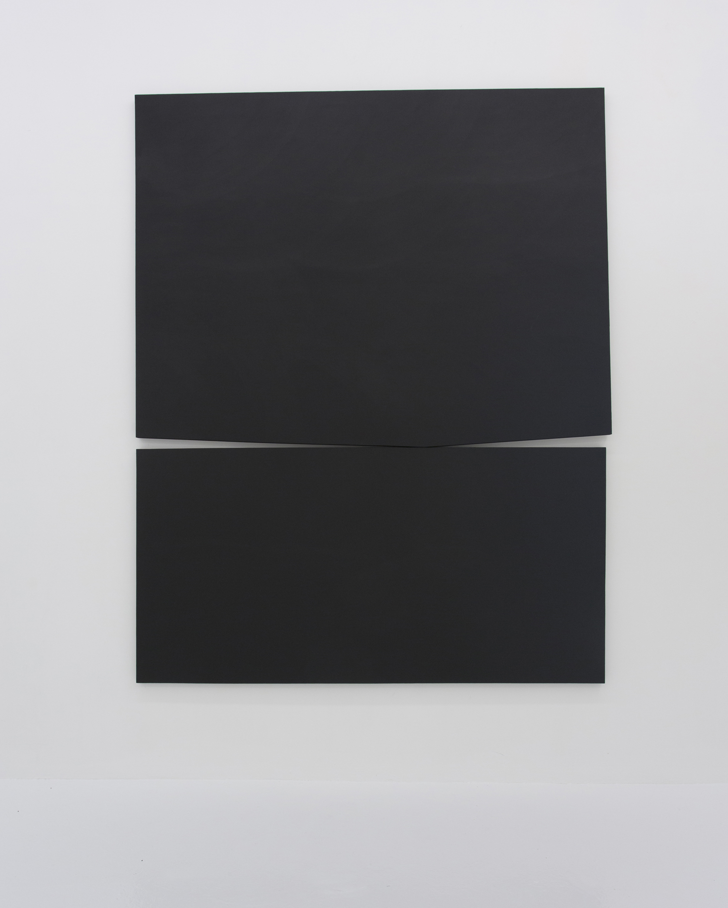 With deep black shapes filling, taking over the canvasses, these works contain their drama in the subtle variation of angles and curves. Like smooth-edged Motherwell paintings, these giant black shapes rub up and jostle for position. They are stacked in a way that seems to obey gravity and limn silhouettes suggestive of industrial design or even household products.