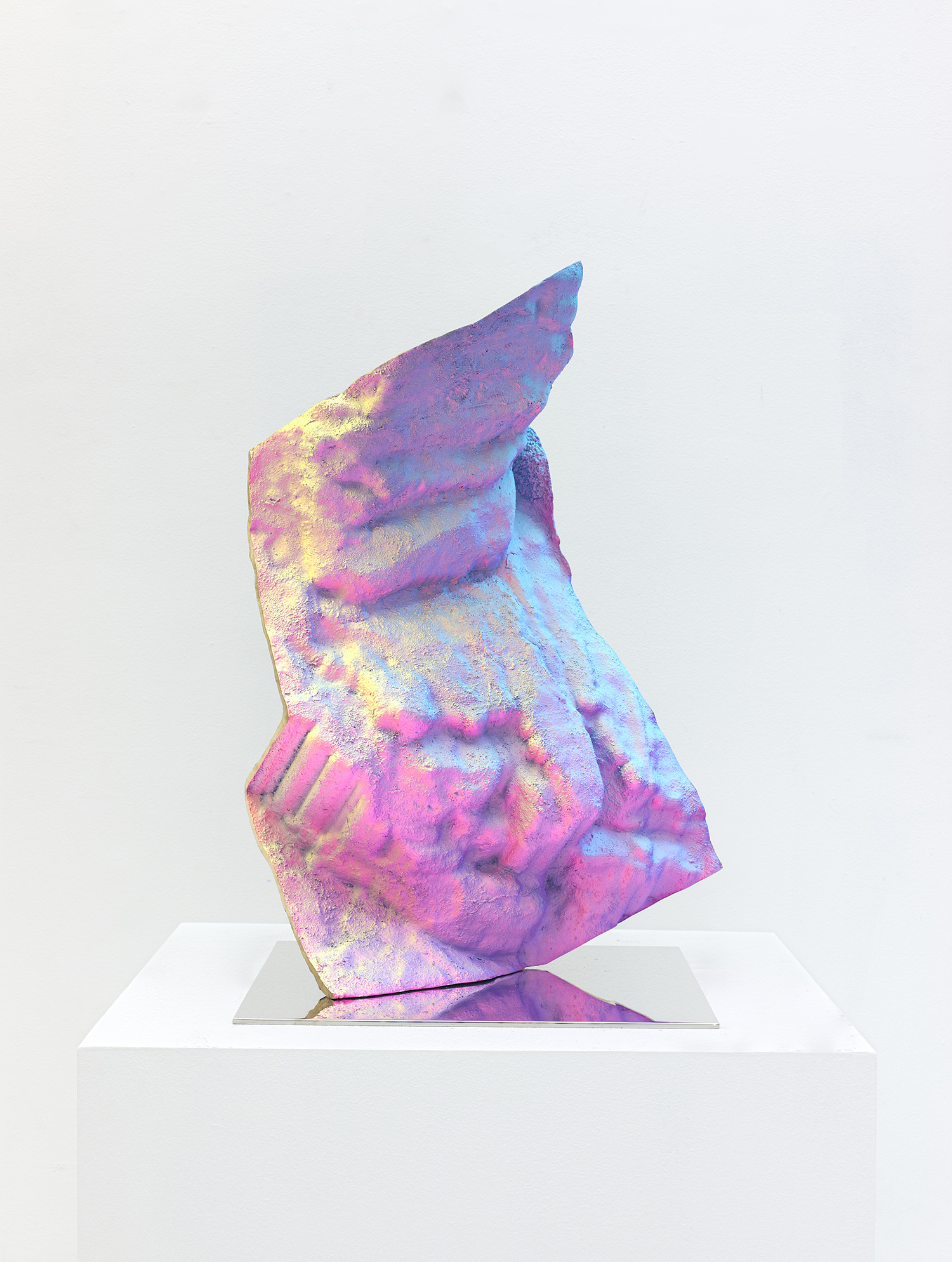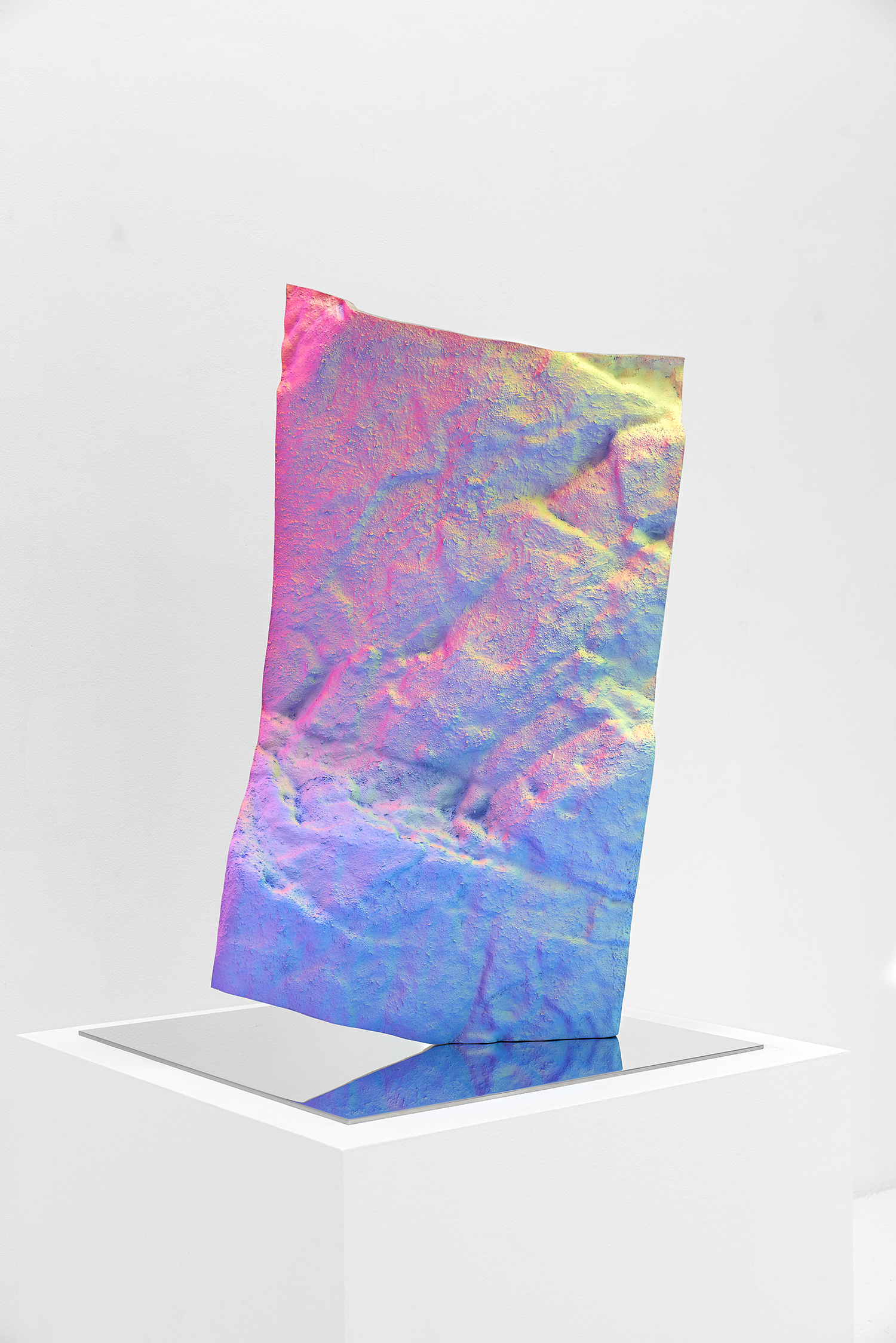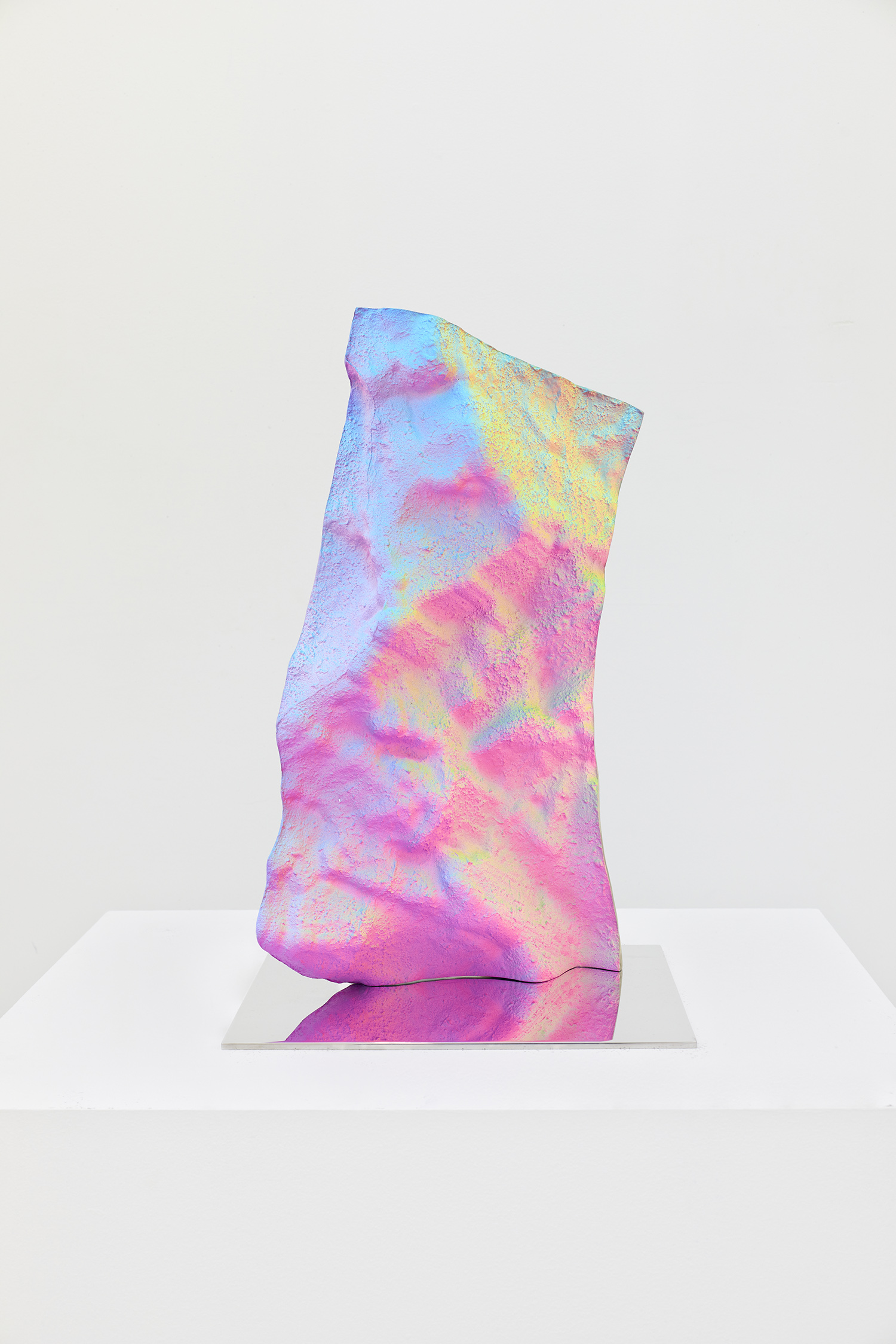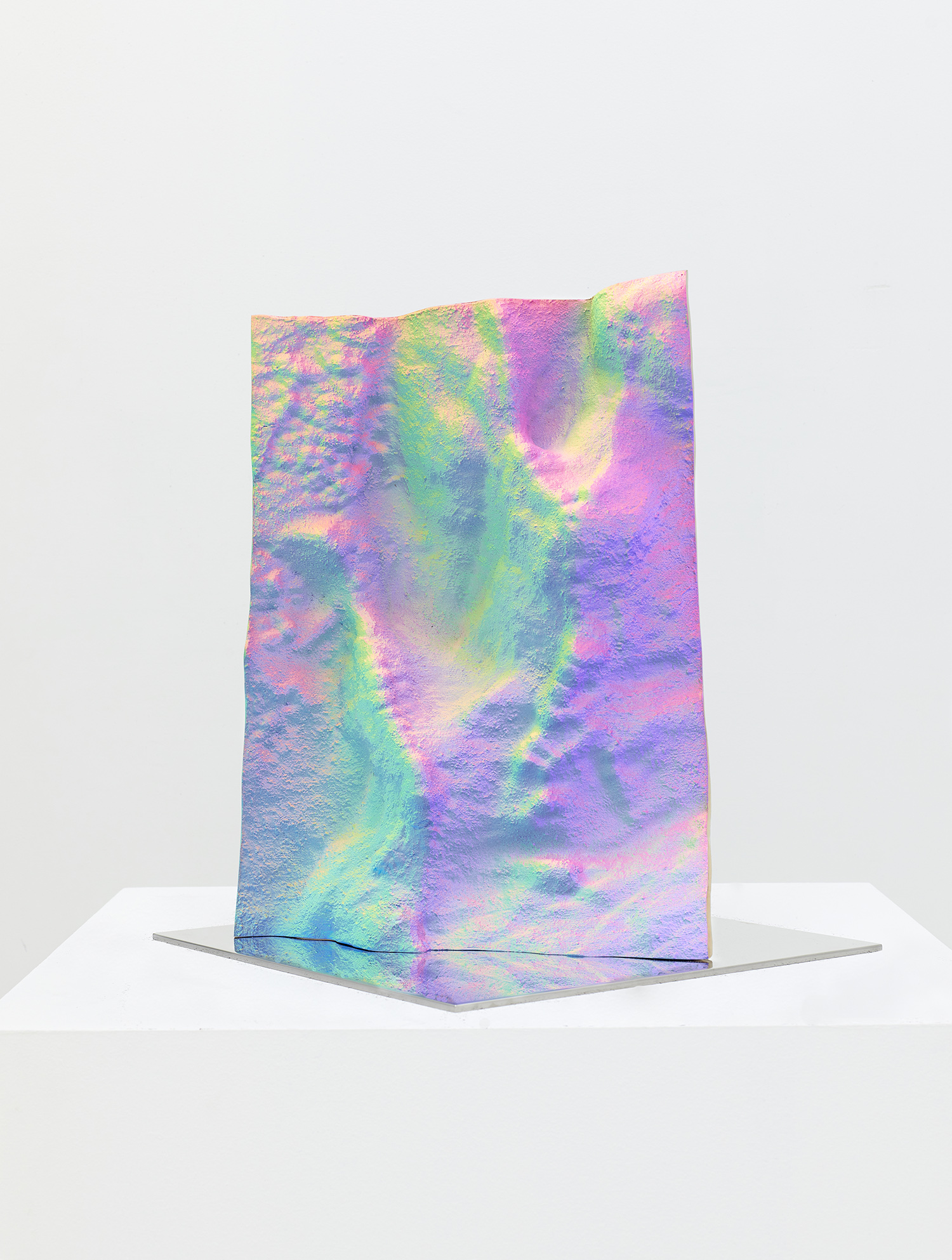 Staniak’s work looks to the origin of painting in the cave, where artistic instinct found its first expression, by replicating the textured surfaces of cave walls from scans available on open-source CAD software. Uneven, rough, and heavily saturated with color, the sculptures generate what the artist has termed as a “hypersurface,” meaning that the object produces a feeling of disorientation where areas of shadow and light are unclear and an objective viewing experience is inhibited. Staniak’s work explores the transfiguration from two-dimensional to three-dimensional, and from digital screen to reality, to expose the seams undergirding digital tools.