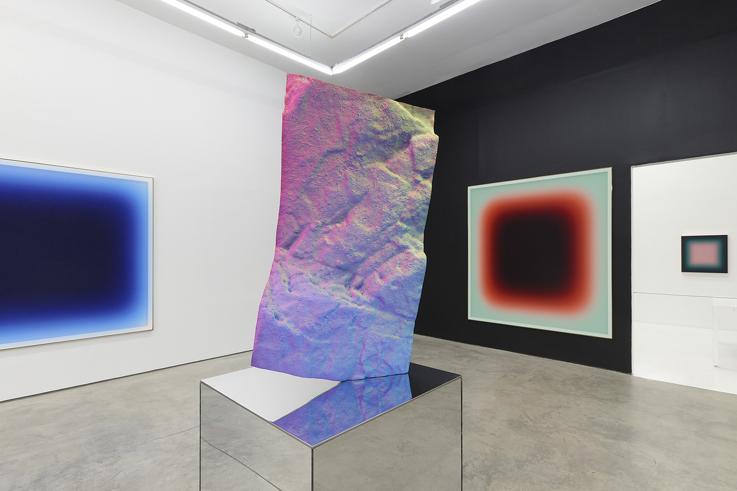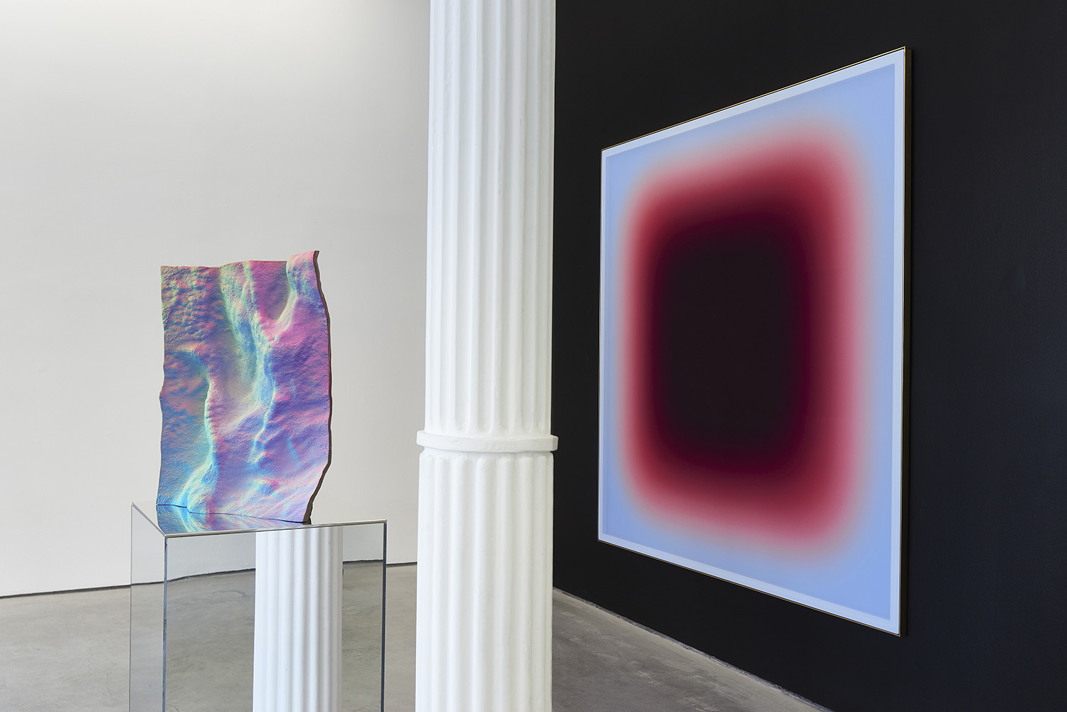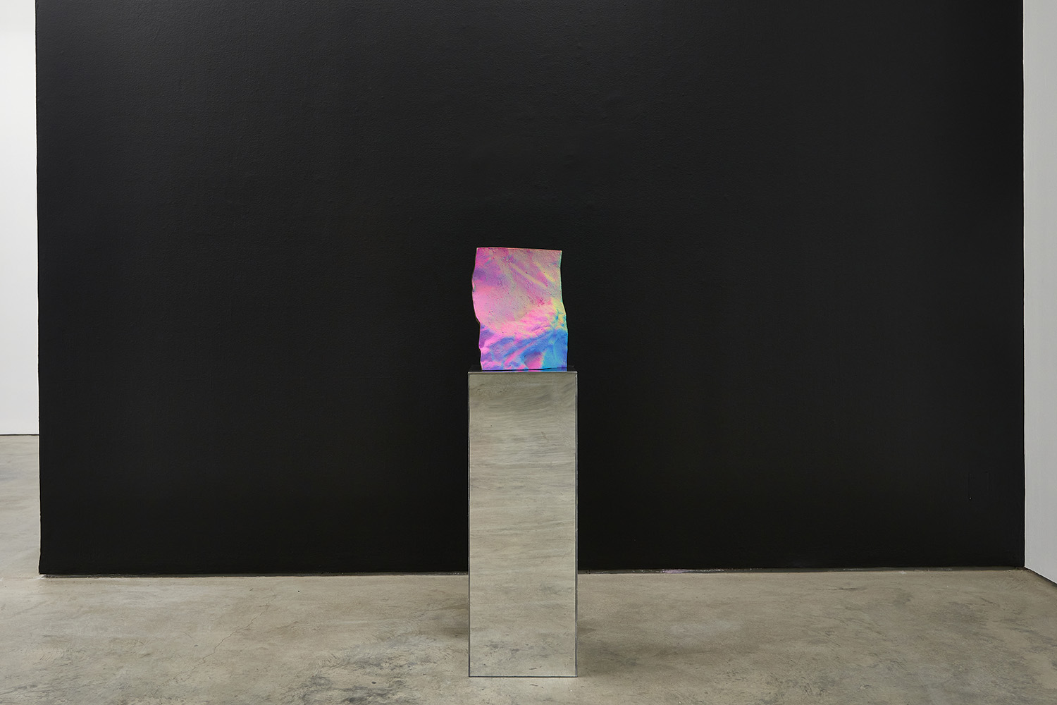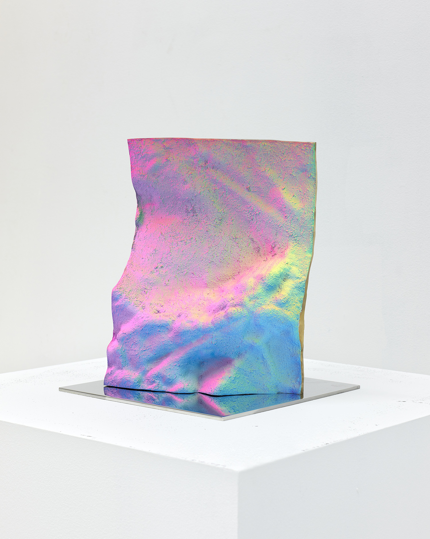 Staniak’s work looks to the origin of painting in the cave, where artistic instinct found its first expression, by replicating the textured surfaces of cave walls from scans available on open-source CAD software. Uneven, rough, and heavily saturated with color, the sculptures generate what the artist has termed as a “hypersurface,” meaning that the object produces a feeling of disorientation where areas of shadow and light are unclear and an objective viewing experience is inhibited. Staniak’s work explores the transfiguration from two-dimensional to three-dimensional, and from digital screen to reality, to expose the seams undergirding digital tools.