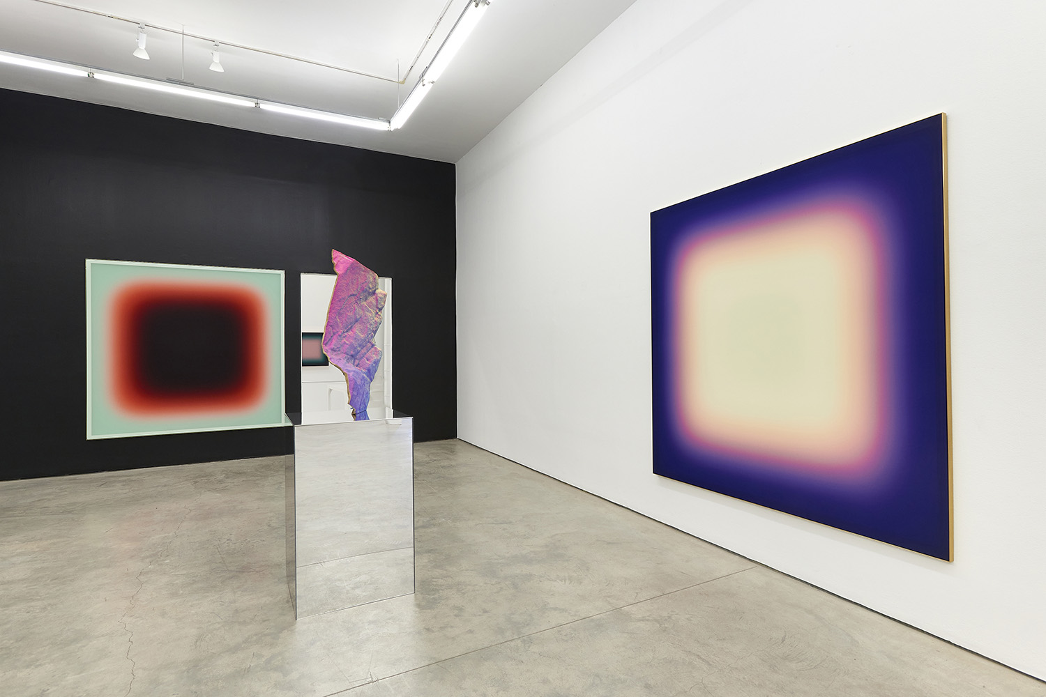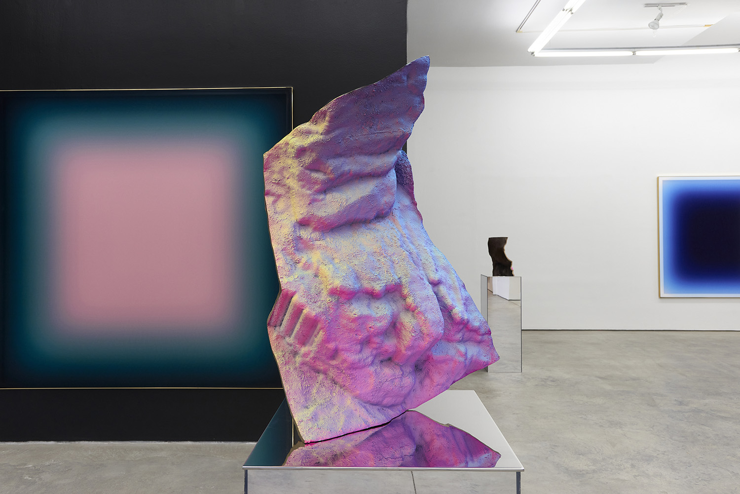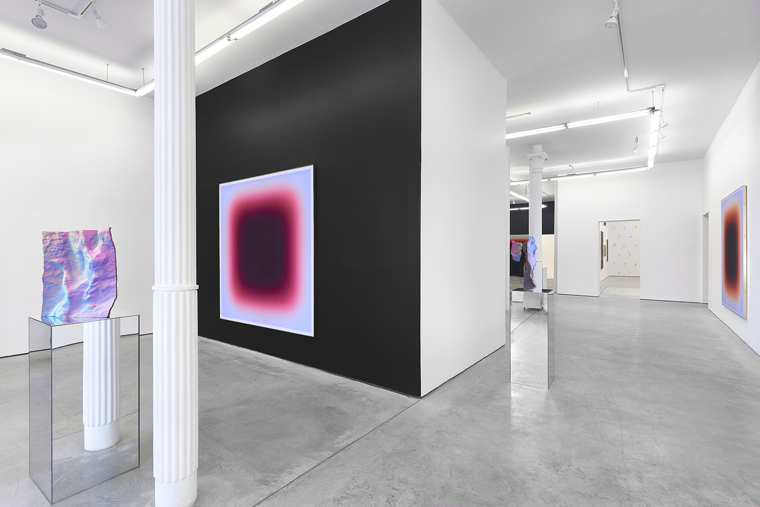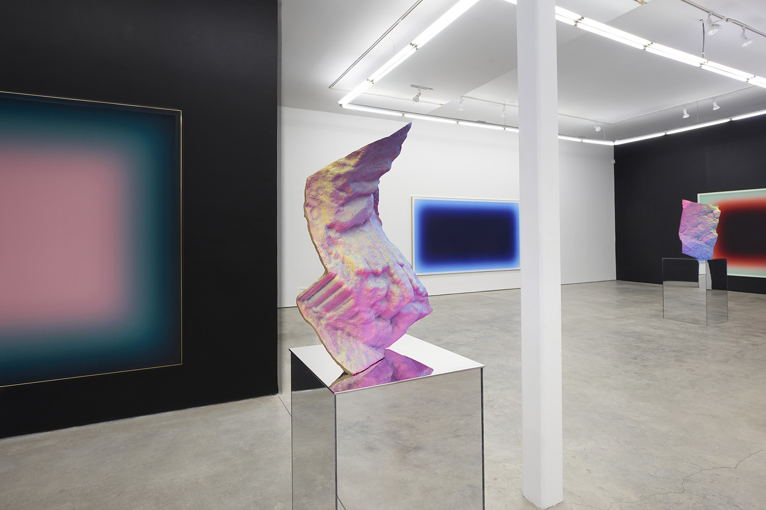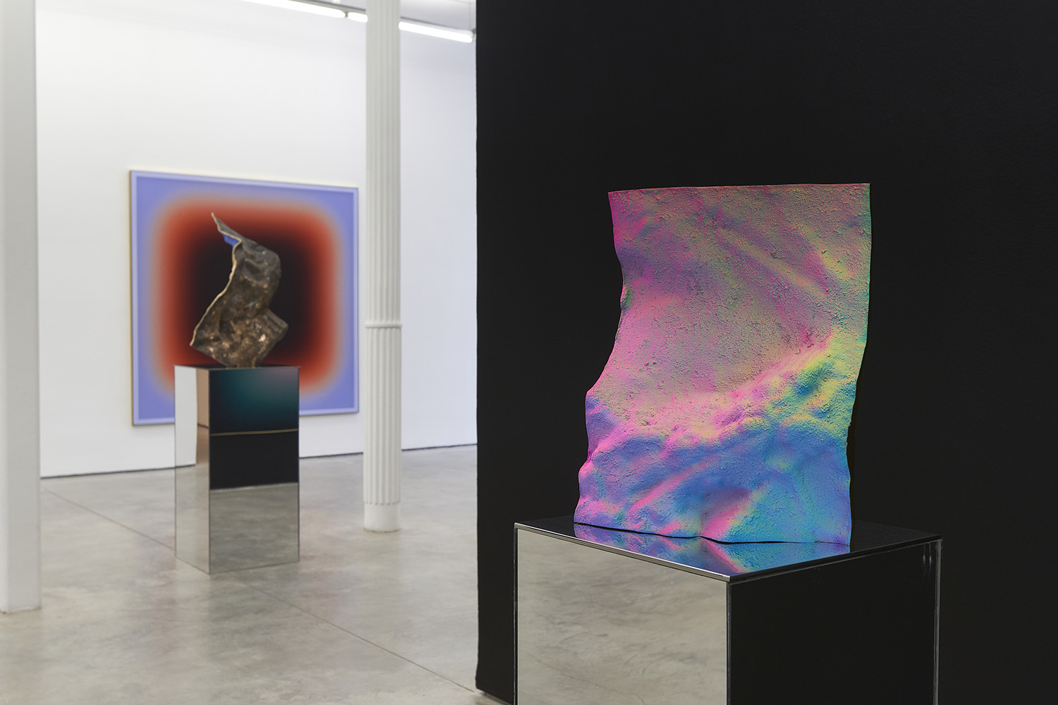 The Hole is proud to present a two-person exhibition with wall pieces by Jonny Niesche and sculpture by Michael Staniak, both artists native to Australia. Niesche’s trompe l’oeil “void” paintings suck you into their black center while Staniak’s painted bronze sculpture look like holographic fragments from a different universe.