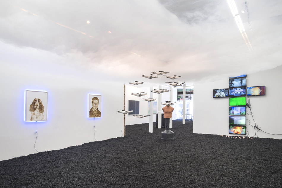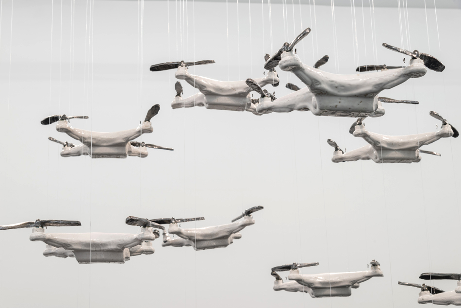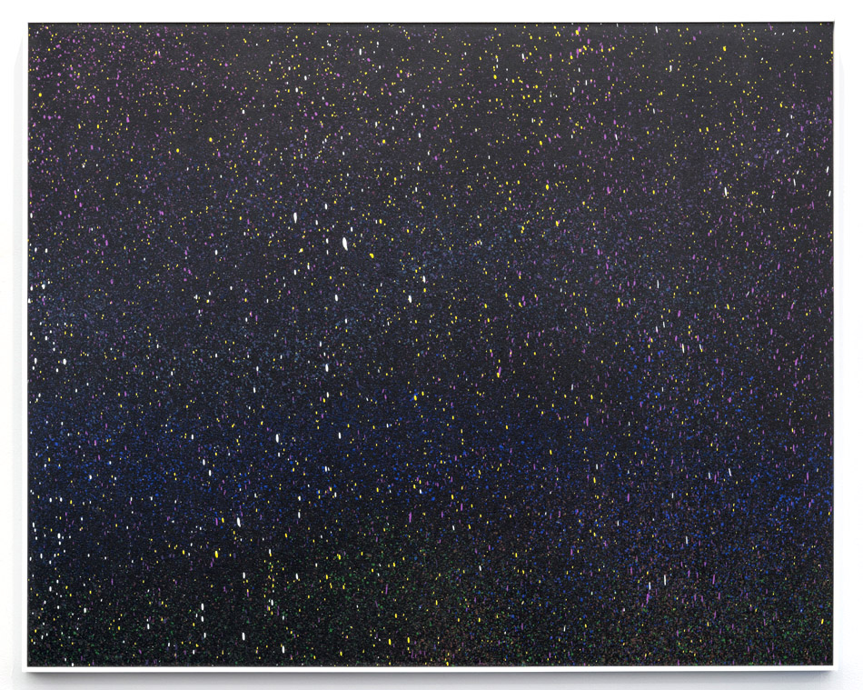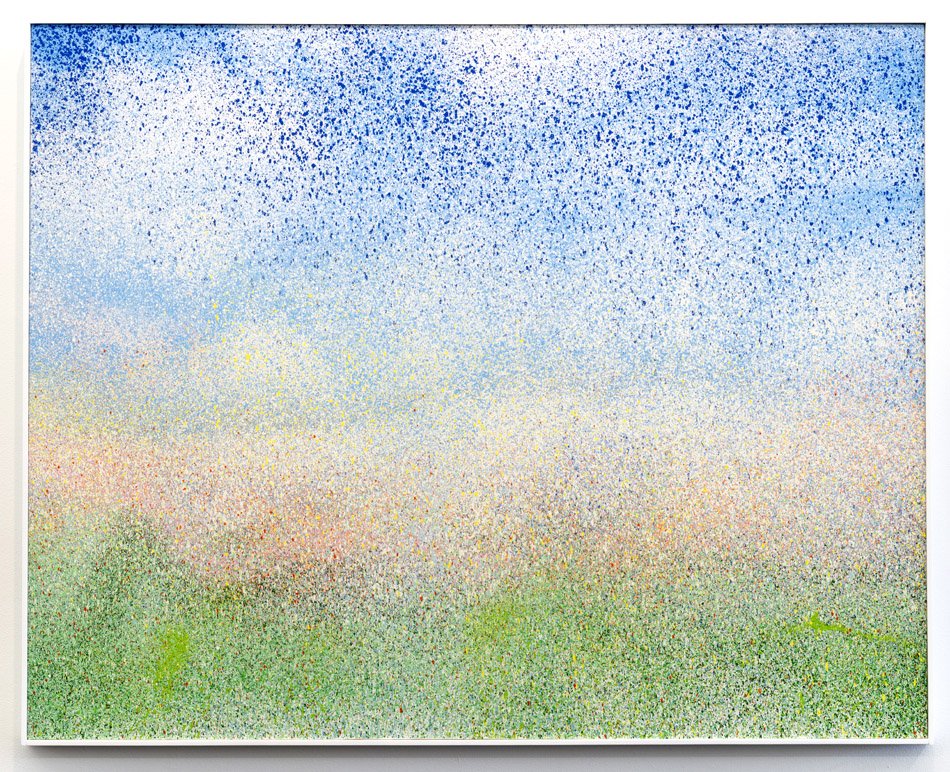 In what are his most well-known type of paintings—enamel spattered canvases painted by drone—KATSU begins his exploration of how artmaking is affected by cultural shifts in the digital age. With the analog world disappearing and digital imaging stamping out most other ways of making something to look at, the artist takes traditional subjects in oil painting, landscape and portrait, to weird new places with the intermediation of a drone. The “artist’s hand” is now fingers on a remote control and “gesture” is now the weight-sensitive motion of the airplane correcting itself as its paint payload is deployed. One wall of the exhibition is covered with drone-painted “Marilyns”, the artist’s interpretation of the iconic blonde and equally iconic Warhol portrait of her. The slippages of the silkscreen’s raster are updated here to be the errors of remote control or fluctuations in the Quadracopter’s stabilization systems.