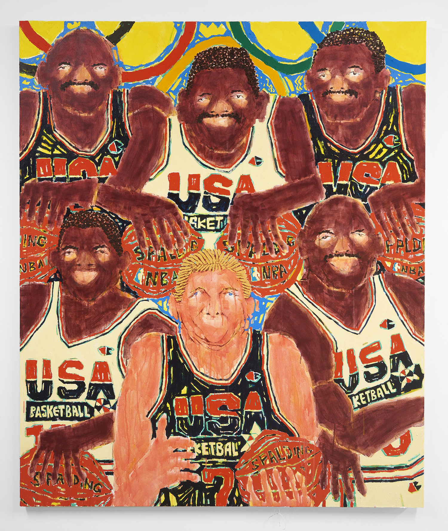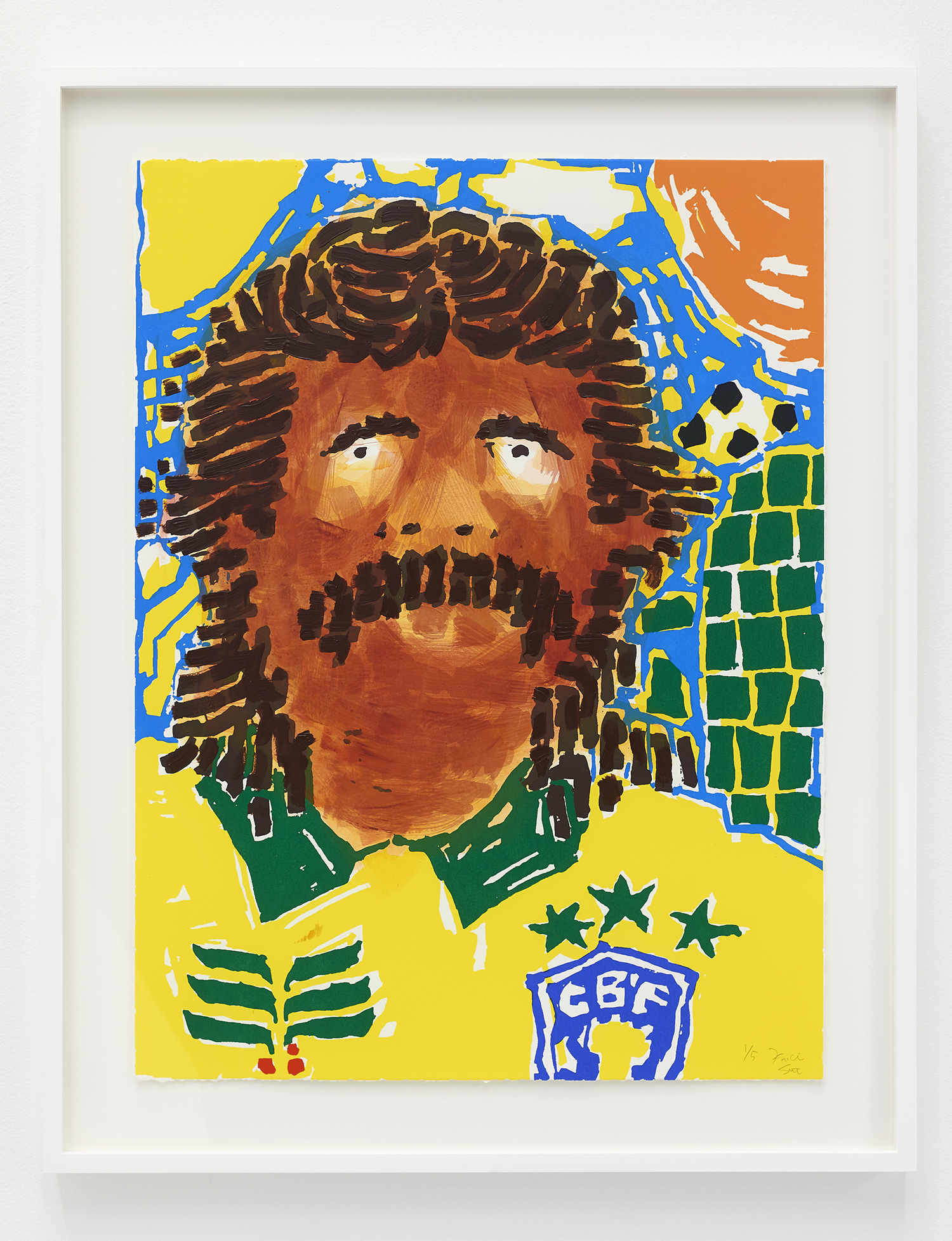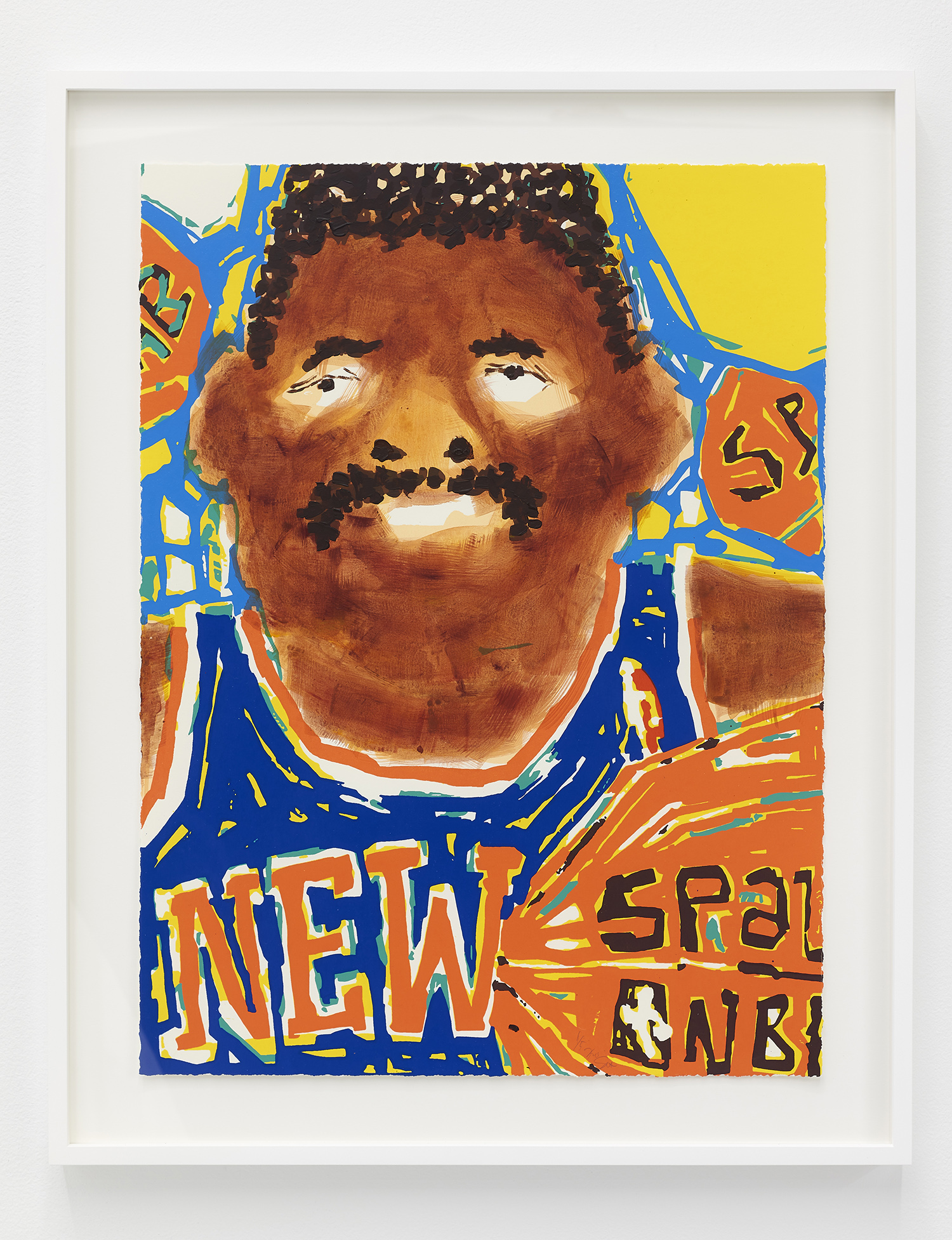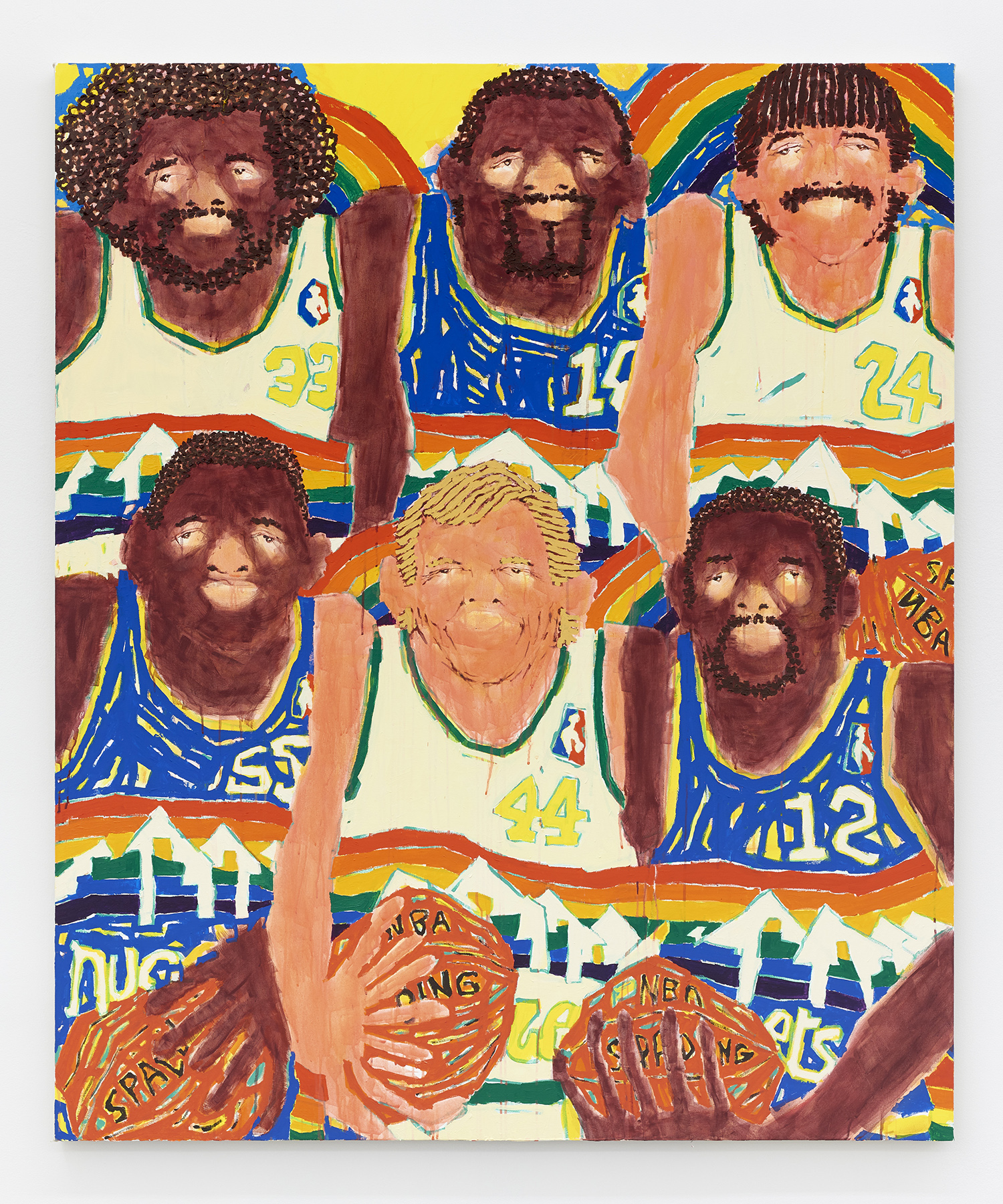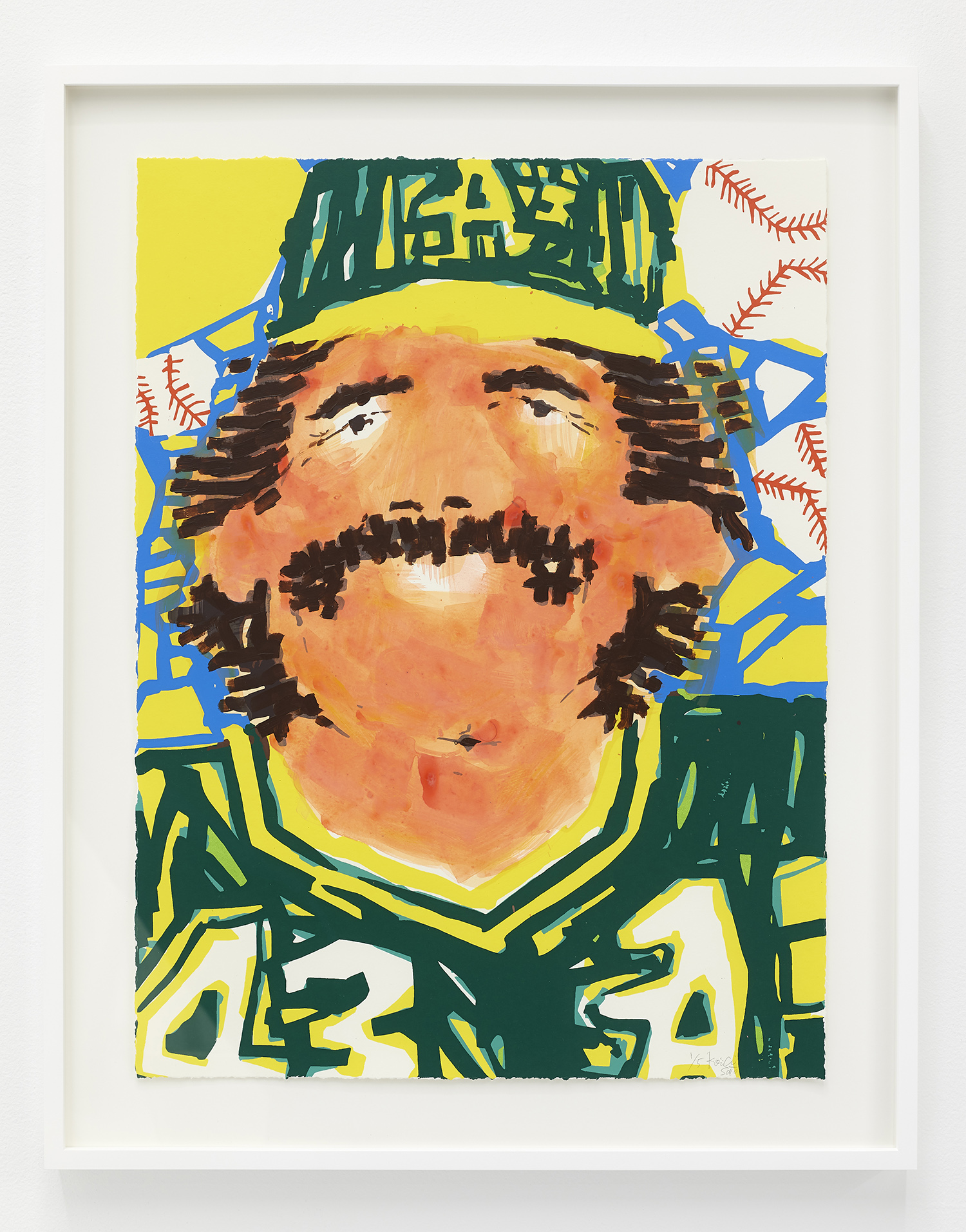 Keigo Takahashi, master printer at Keigo Prints, helped Sato to adapt his method of painting to a 13-color screenprint series for the show. “Soccer”, “Basketball” and “Baseball” each capture his unique painting style with silkscreens, while each piece has a hand-painted face. These mustachioed men resemble vintage trading cards, as many of Sato’s solo portraits do.