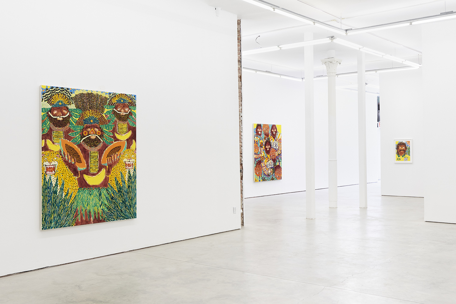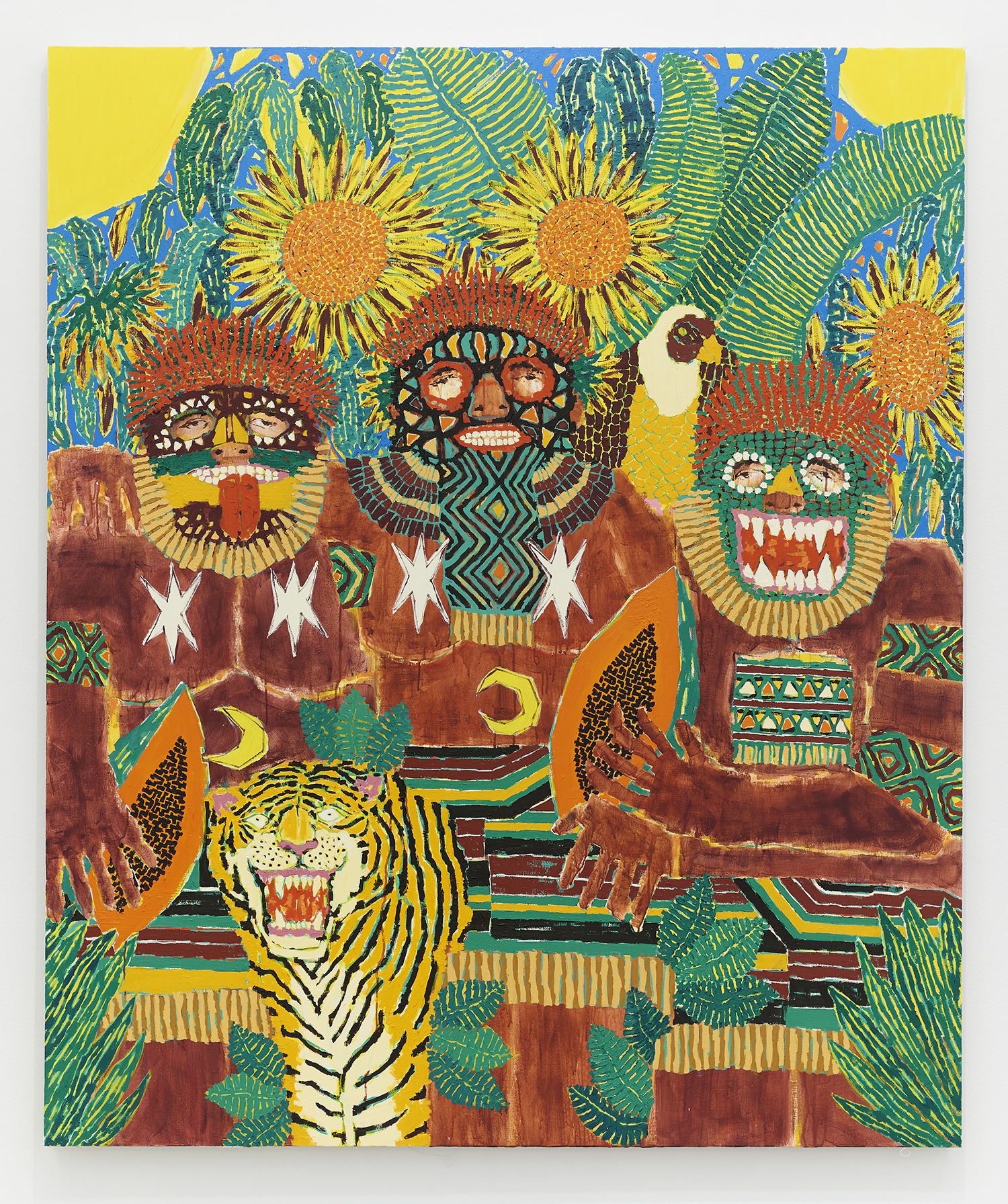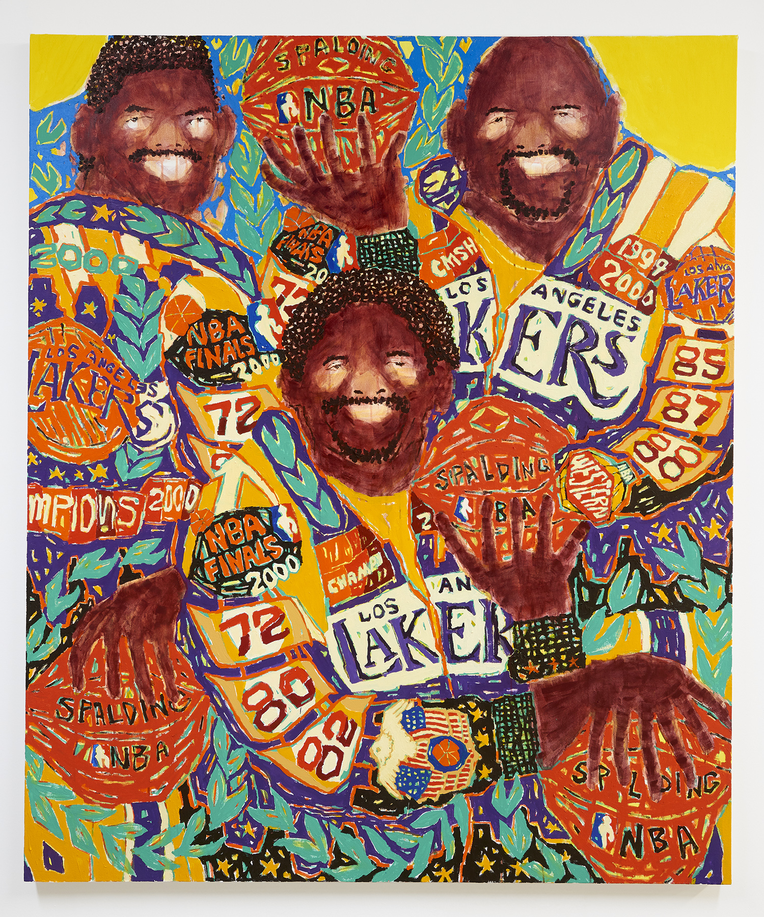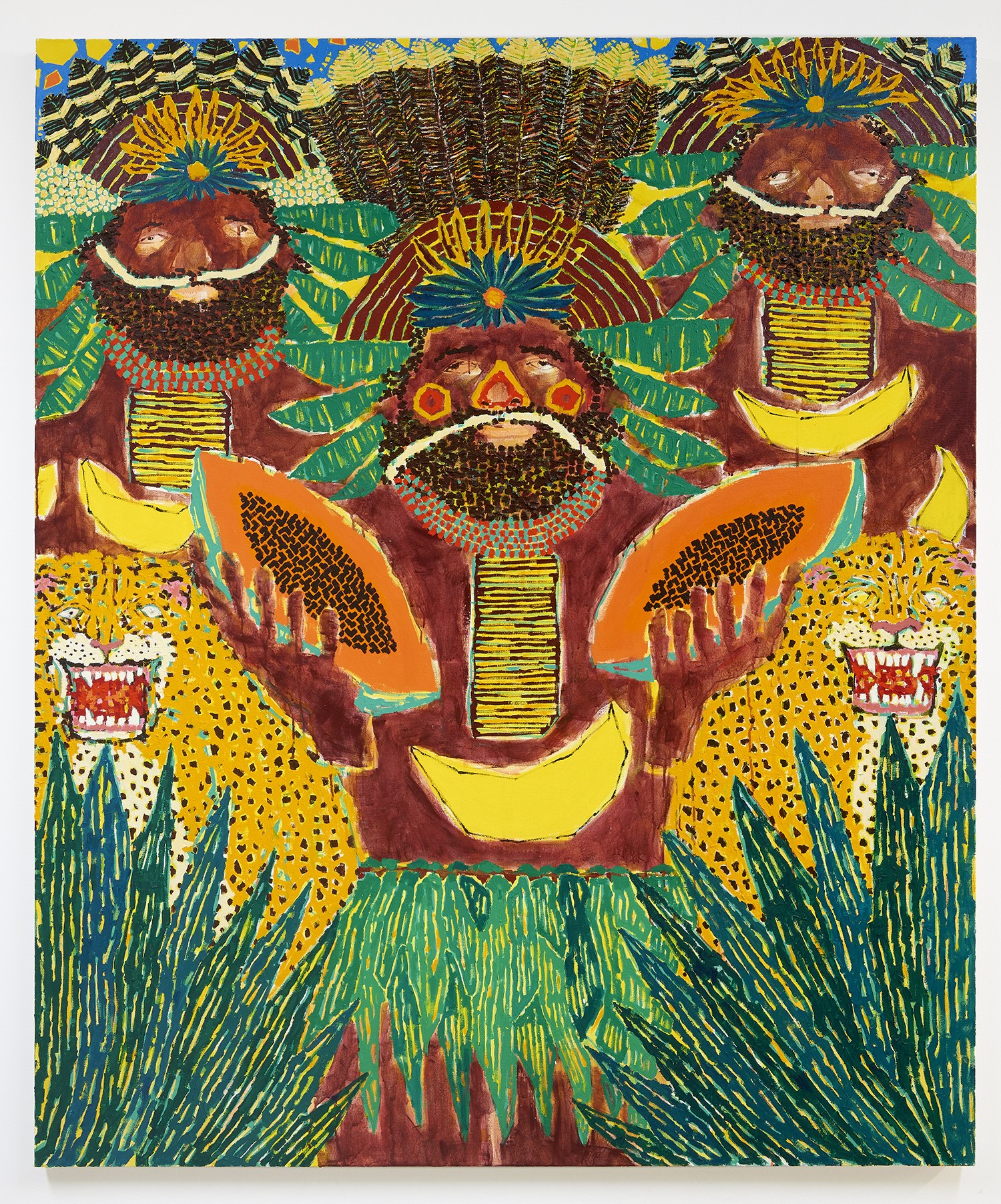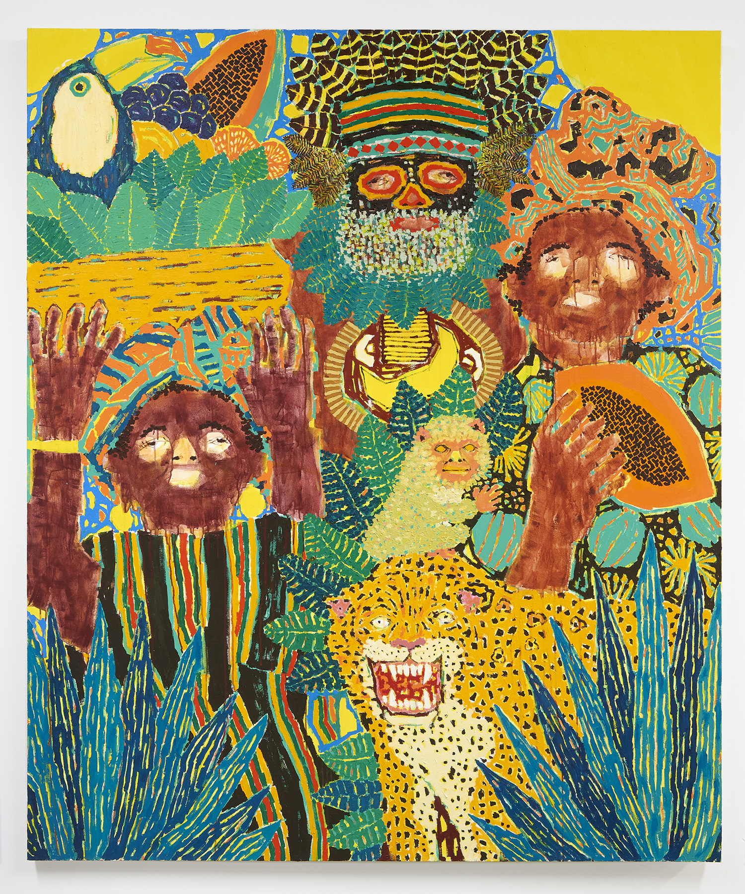 The surfaces of the works range from a barely-there wash around the eyes to the chunked-up opaque tread on a basketball. Inventive layering exposes negative spaces and outlines: the fronds of a fern both hide and reveal the leopard behind it. The artist has had no formal painting training; however, he has honed over the years a way of handling paint that is both expressive and technically innovative.