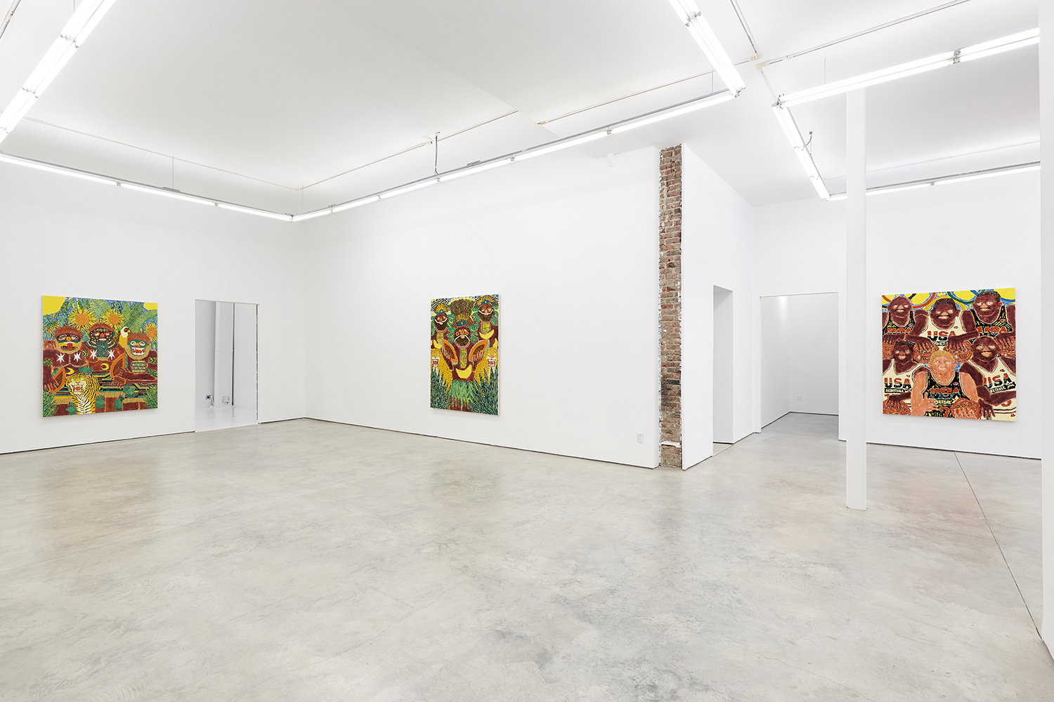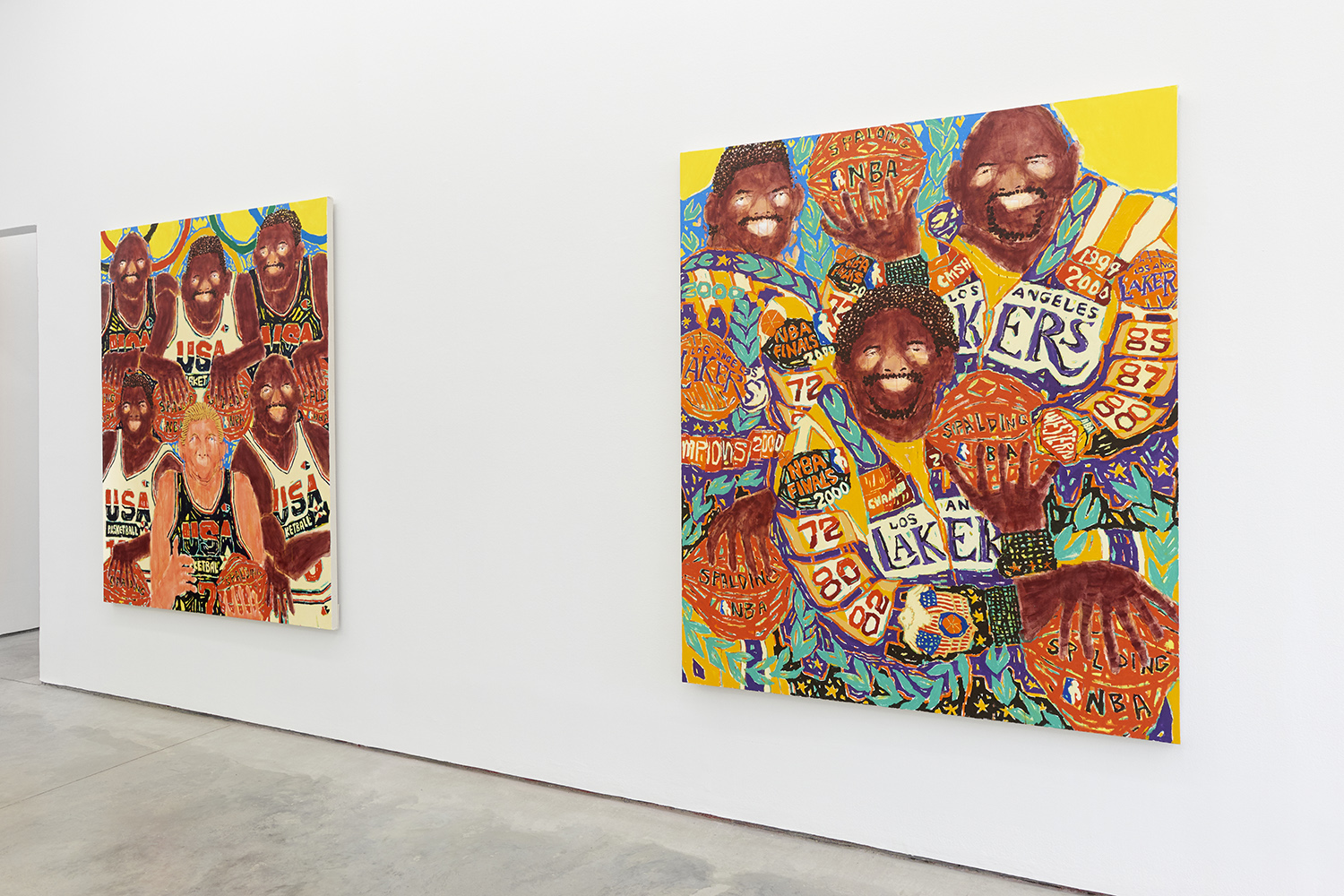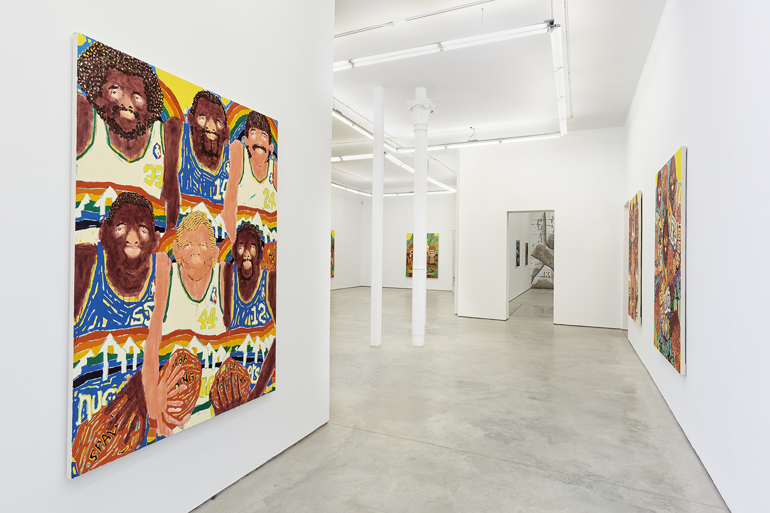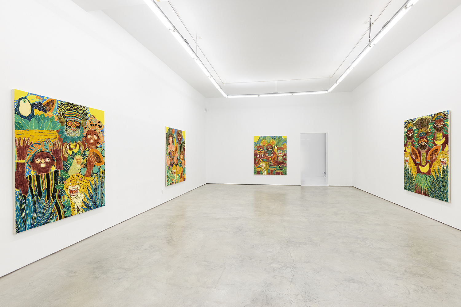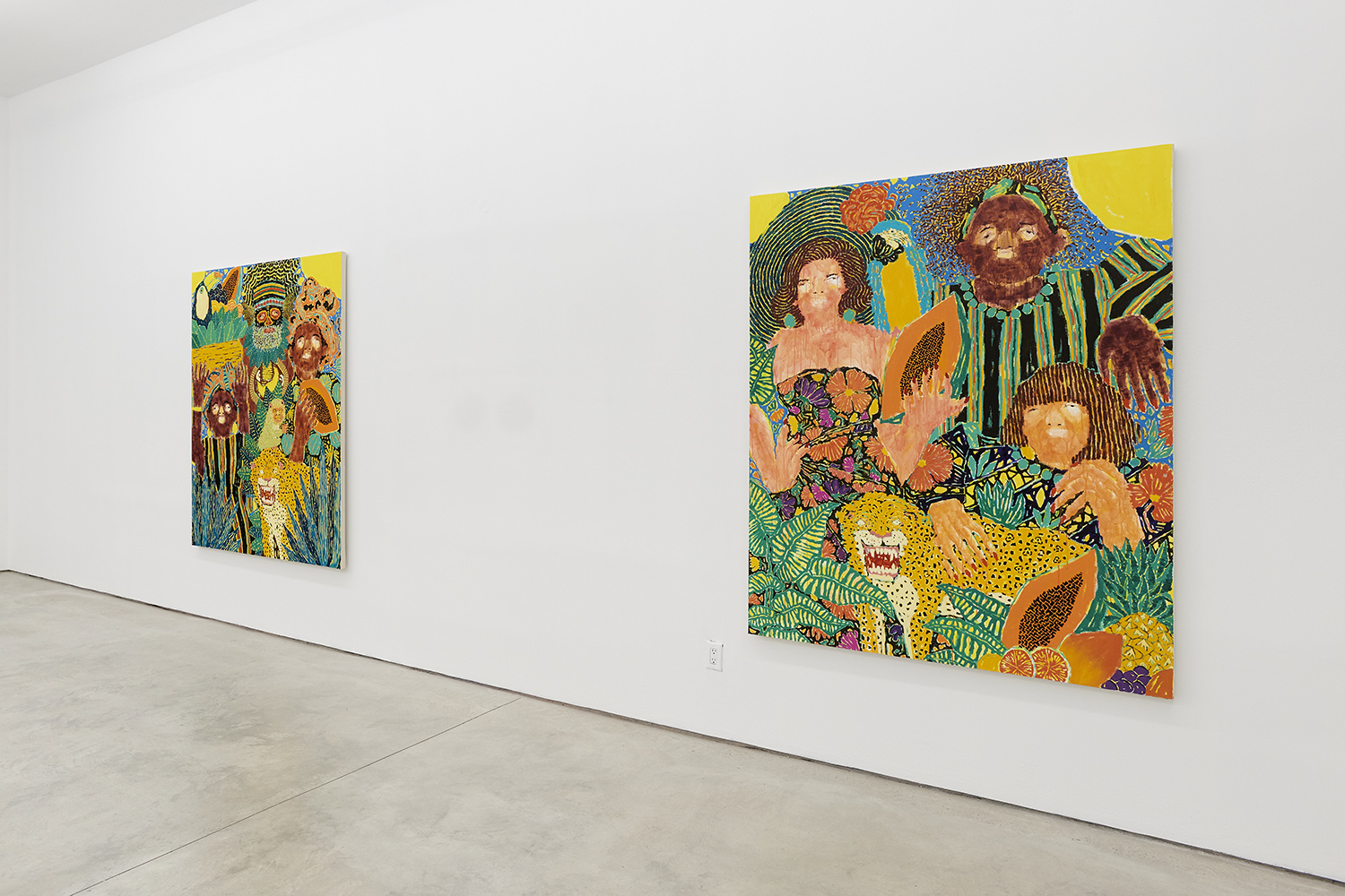 The surfaces of the works range from a barely-there wash around the eyes to the chunked-up opaque tread on a basketball. Inventive layering exposes negative spaces and outlines: the fronds of a fern both hide and reveal the leopard behind it. The artist has had no formal painting training; however, he has honed over the years a way of handling paint that is both expressive and technically innovative.