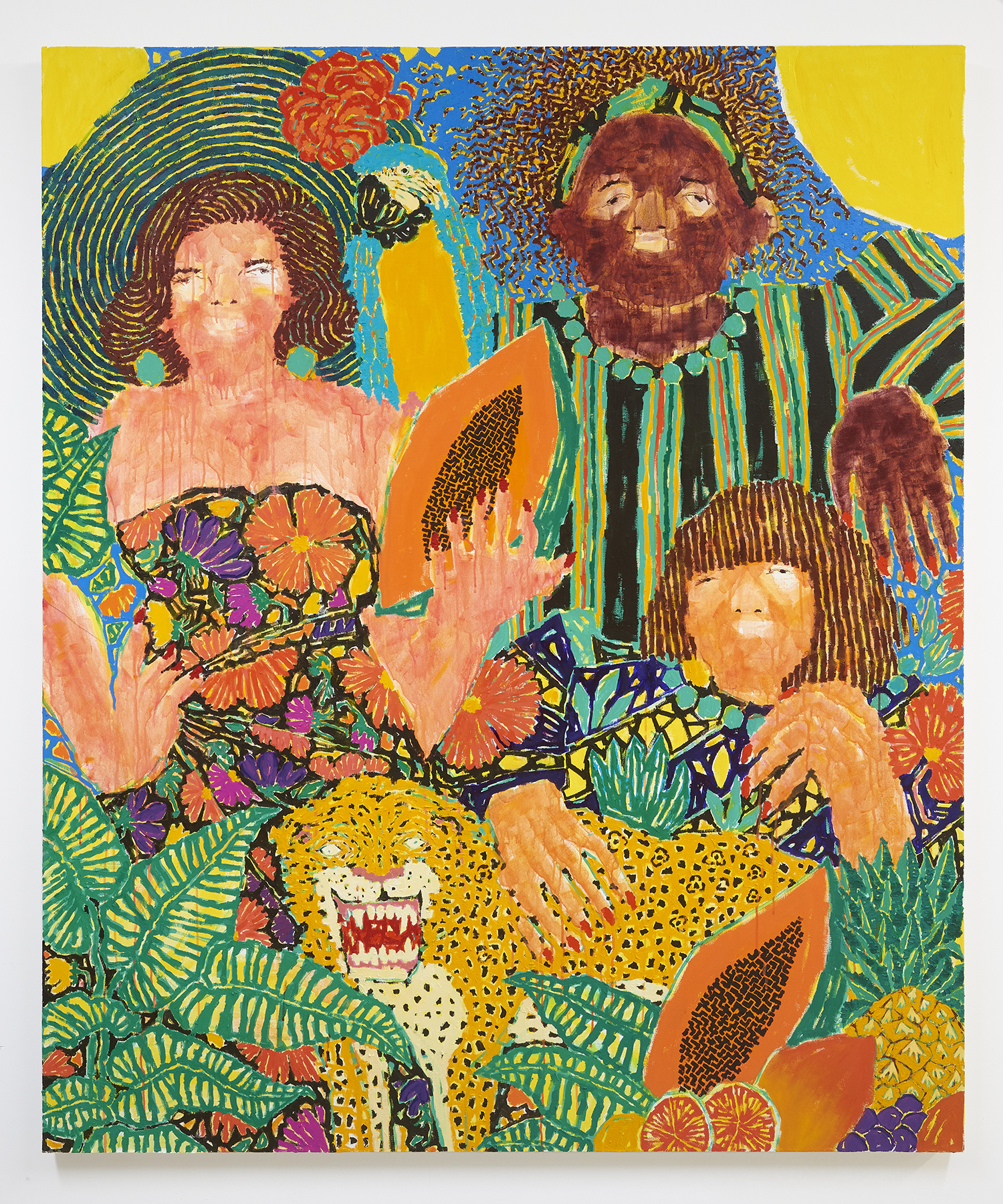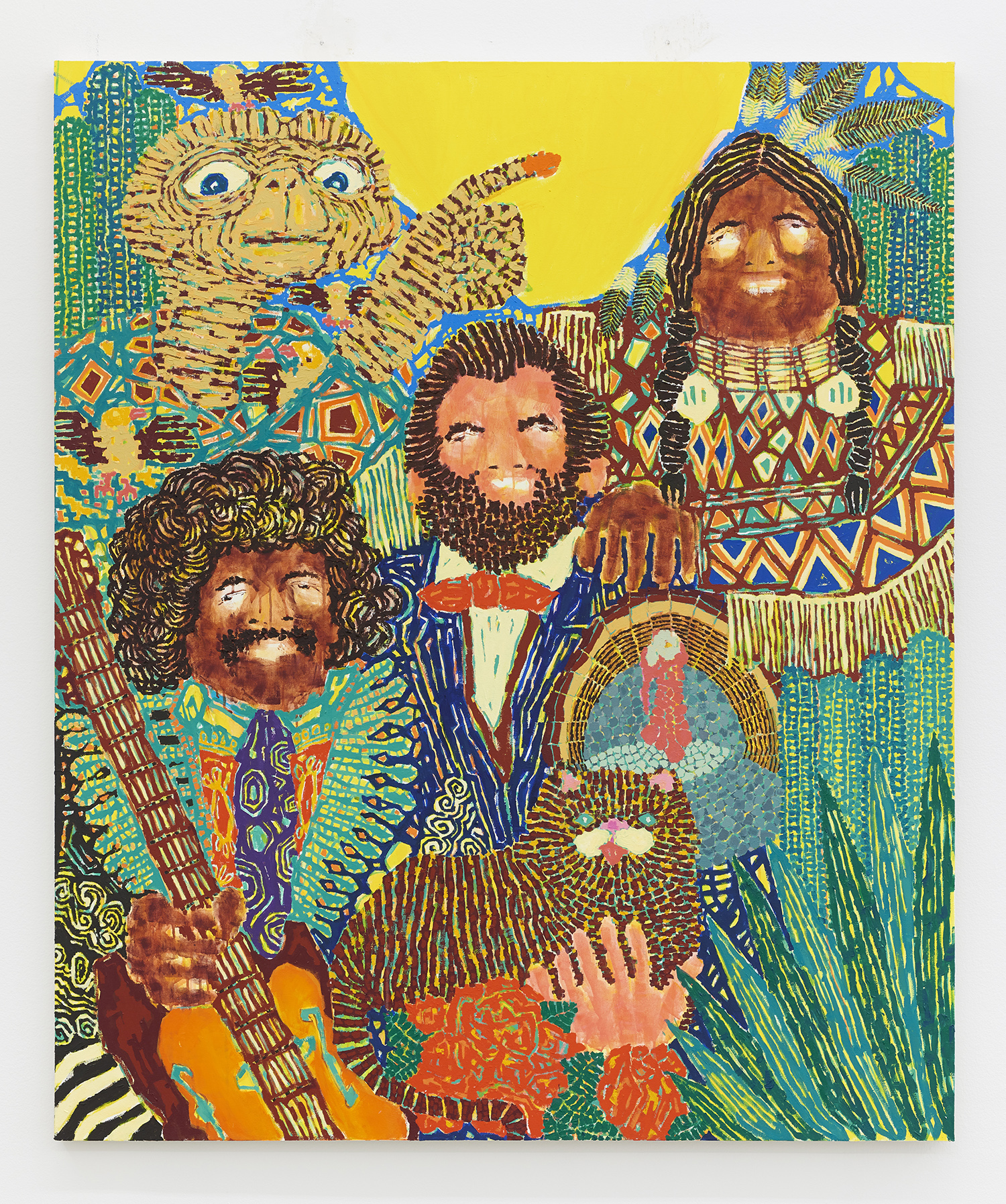 Not just the choices of imagery but the way he renders things is inventive and fresh: the technological-looking seeds of a papaya, the tiny looped Cherio’s of hair, the feathers of a turkey or the striations of a plant. Patterning covers everything except the skin of the figures and a recurring bright yellow sun. From the understandably ornate ceremonial garb to the crazily articulated wrinkles on E.T., everything gets activated. Fruits and animals from different continents coexist with figures of different skin color wearing indigenous garb synthesized from very disparate cultures and time periods: there is a lot going on in each work!
