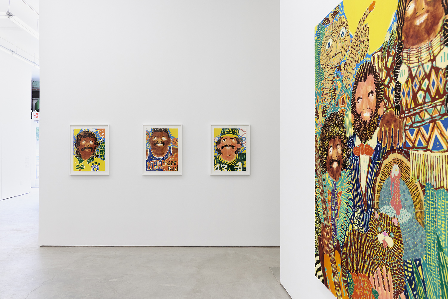 Sato’s paintings are instantly recognizable by their joyful imagery and scintillating patterns. Born in Tokyo, Sato moved to New York City in the late 90s and works out of a studio down on Canal Street. Fascinated by old American magazines while growing up, Sato makes paintings that have a vintage feel to them, and not just from the huge mustache choices of the sports players he depicts. The subjects of his paintings are always group portraits; he has painted cheerleaders, bodybuilders, bands, astronauts, cops, or 80s sitcom casts—tho often he just depicts imaginary people. He says he likes to let his imagination run free while making a piece; you will notice the prominent polydactyly in this show, which he explained by saying he just starts painting fingers and stops when he thinks there are enough.