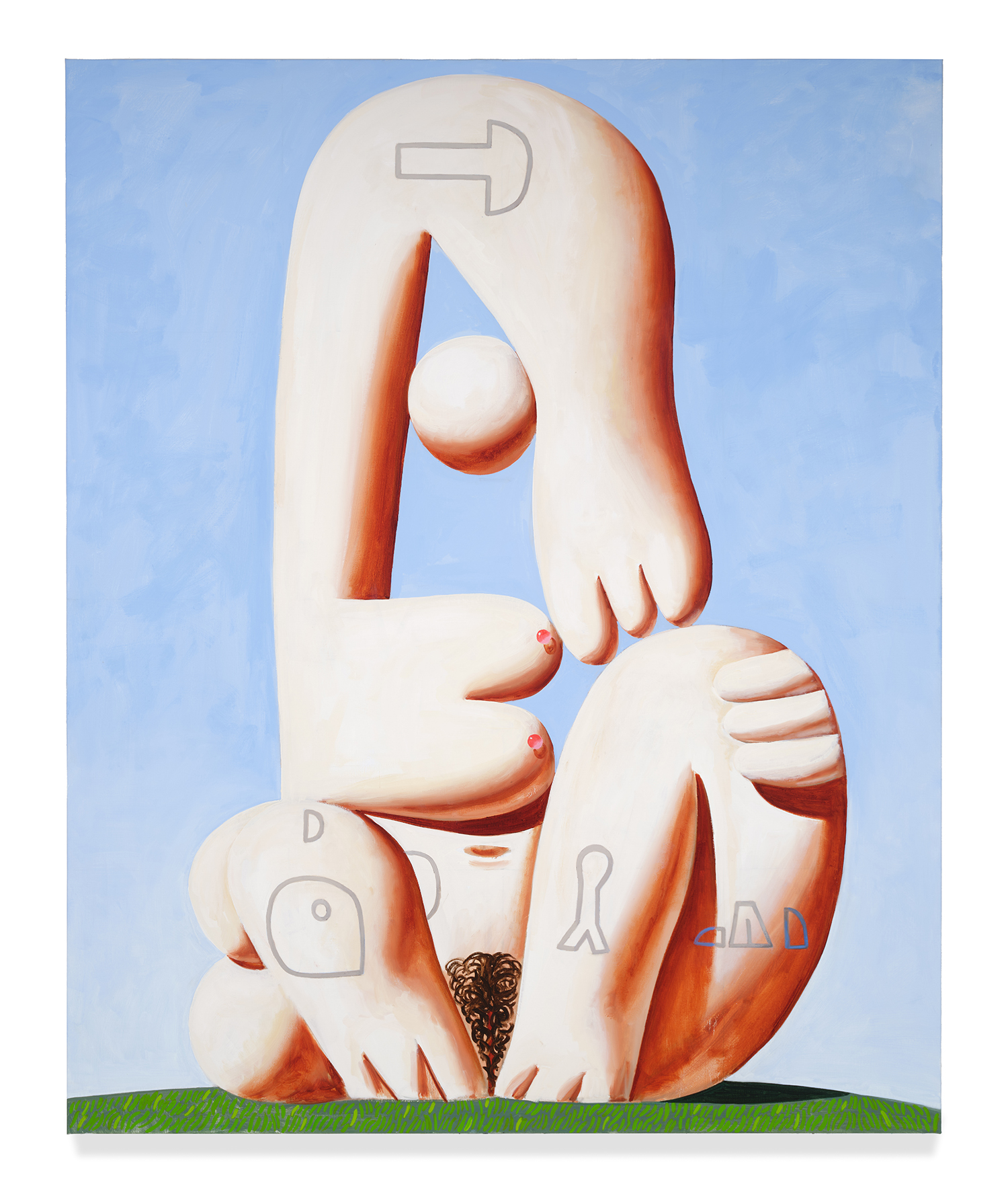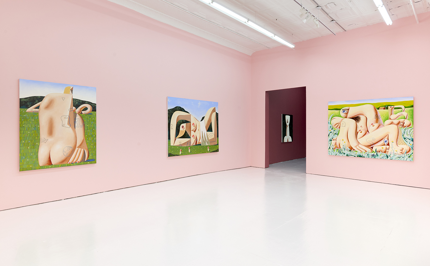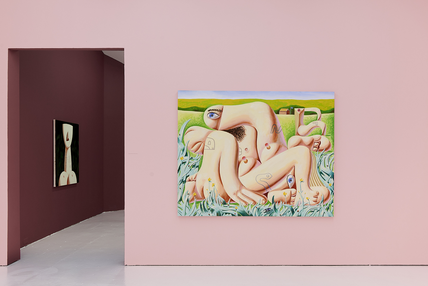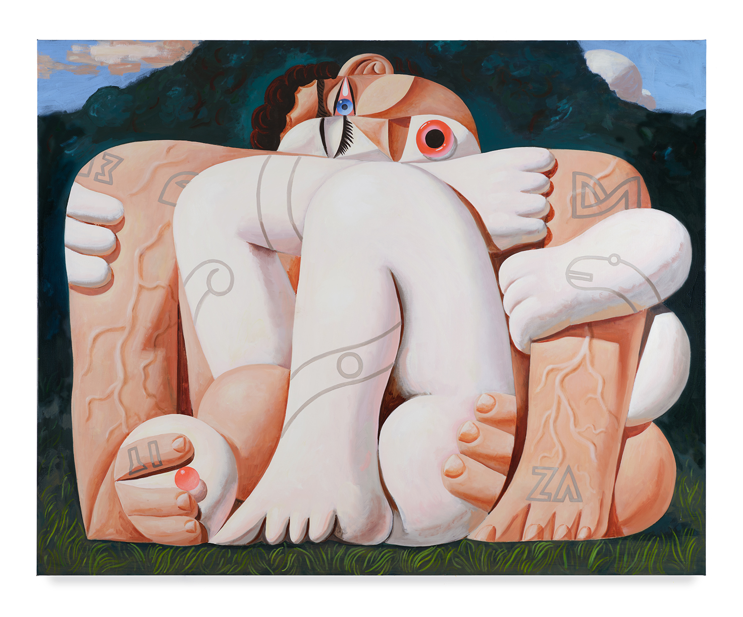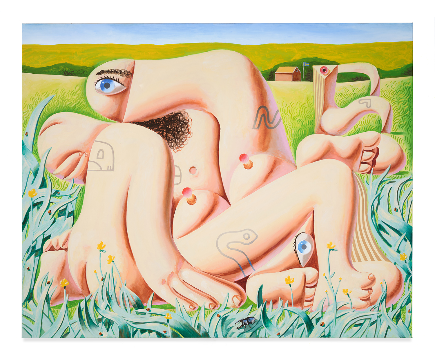 Park begins each canvas according to the rules of classical composition before abandoning logic, letting figures take form from intuition. The contortion of Park’s figures and the placement of their tattoos offer pathways into and out of his compositions: he describes the intended effect as a kind of visual möbius strip. The jumbled limbs of Park’s entangled forms feel liberated, free from clothing, gravity and reality. Where a hand grasps a forearm or a toe touches a tit, the atmosphere is full of tenderness. Biological sex is articulated through an assortment of parts, though not often predictably: fingers and breasts might come in threes, a nipple is indistinguishable from a maraschino cherry, arms go boneless to encircle a lover.