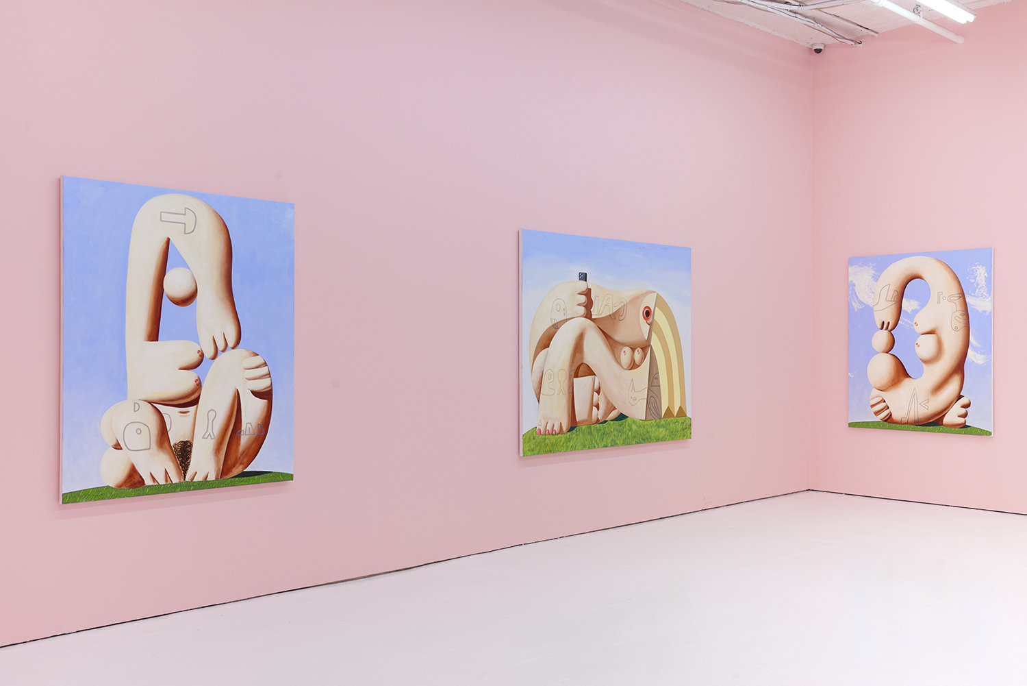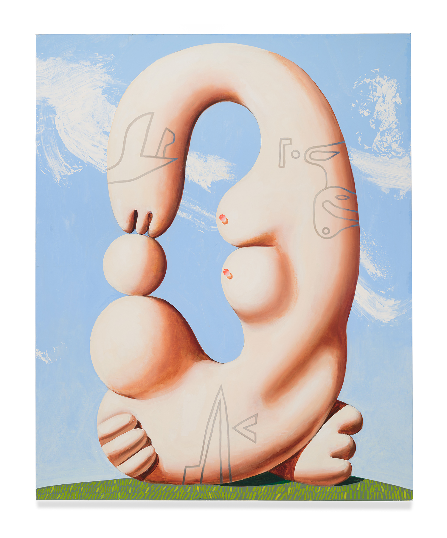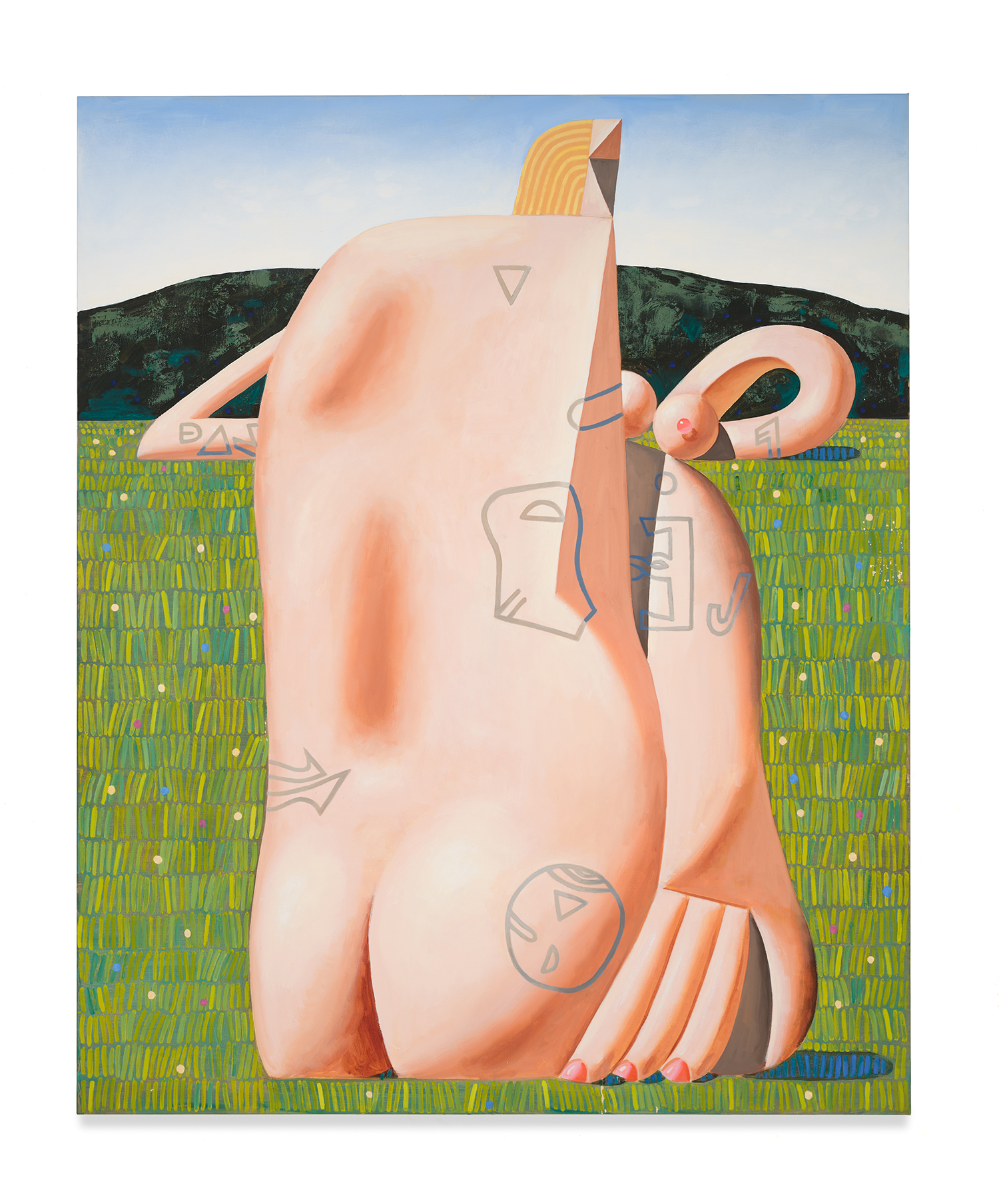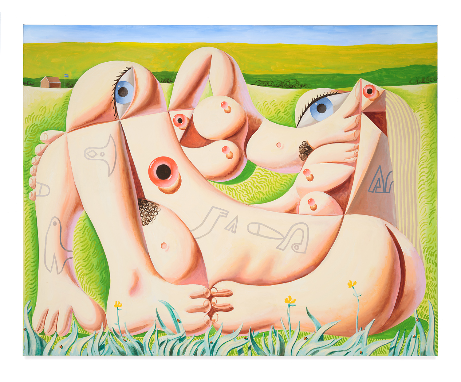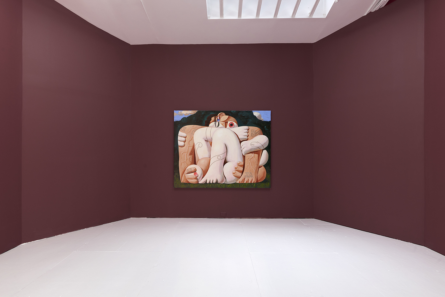 Park begins each canvas according to the rules of classical composition before abandoning logic, letting figures take form from intuition. The contortion of Park’s figures and the placement of their tattoos offer pathways into and out of his compositions: he describes the intended effect as a kind of visual möbius strip. The jumbled limbs of Park’s entangled forms feel liberated, free from clothing, gravity and reality. Where a hand grasps a forearm or a toe touches a tit, the atmosphere is full of tenderness. Biological sex is articulated through an assortment of parts, though not often predictably: fingers and breasts might come in threes, a nipple is indistinguishable from a maraschino cherry, arms go boneless to encircle a lover.