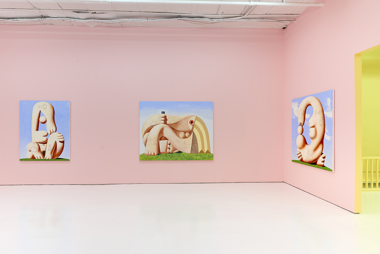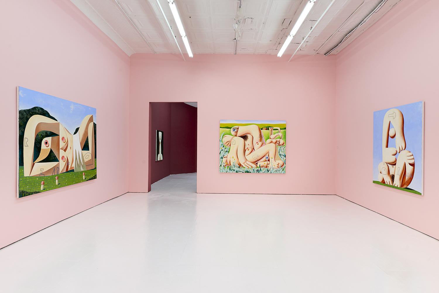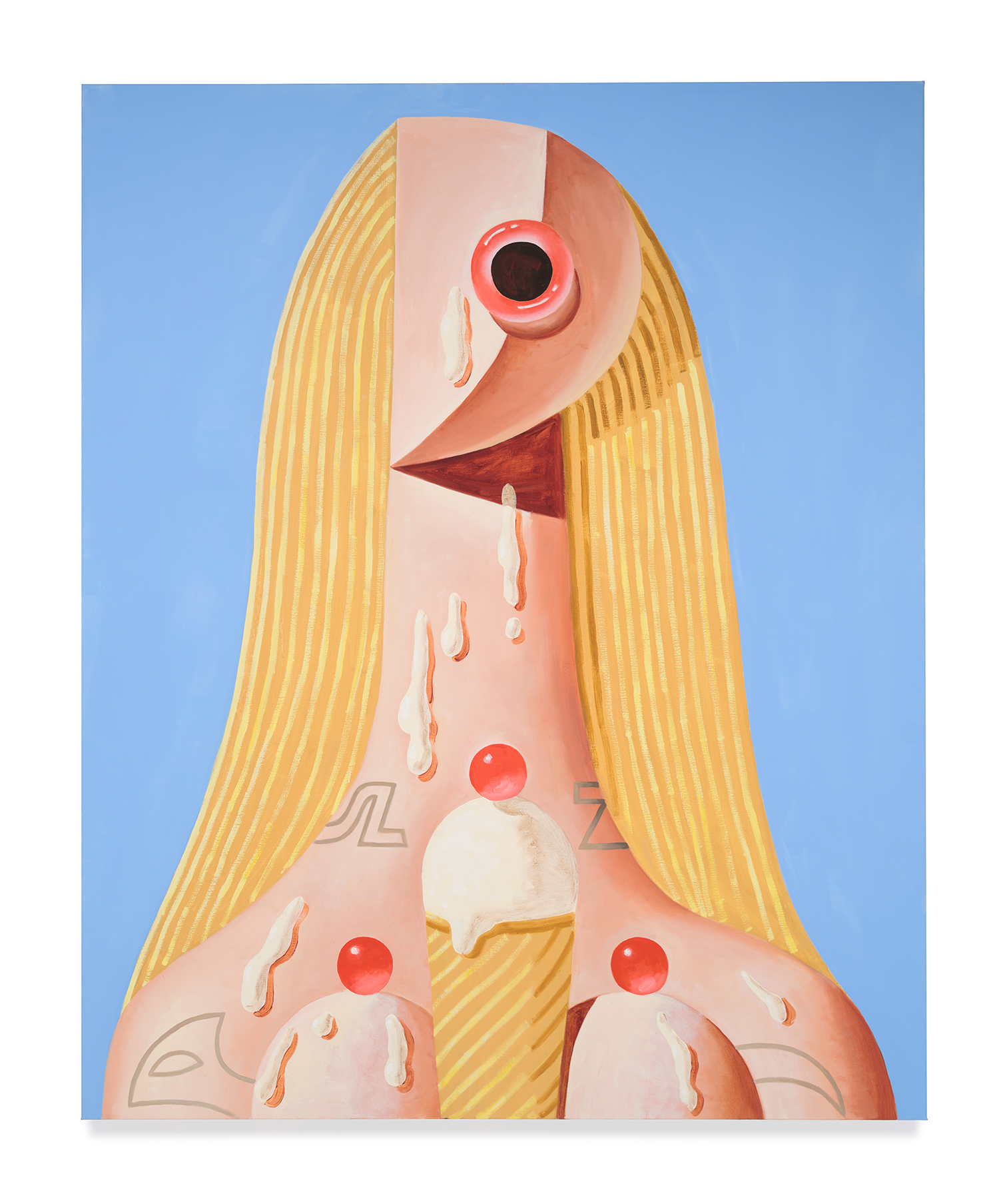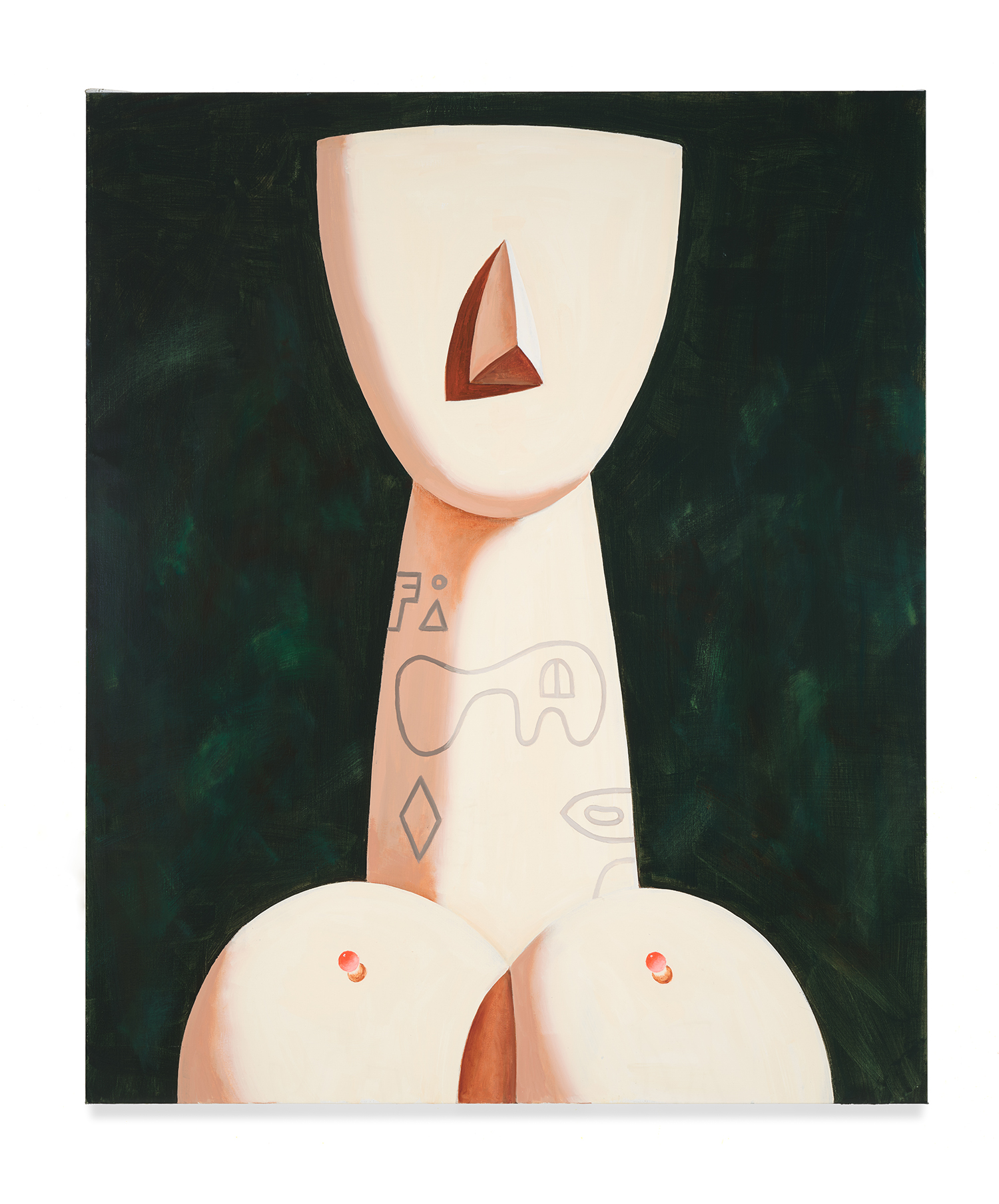 Park begins each canvas according to the rules of classical composition before abandoning logic, letting figures take form from intuition. The contortion of Park’s figures and the placement of their tattoos offer pathways into and out of his compositions: he describes the intended effect as a kind of visual möbius strip. The jumbled limbs of Park’s entangled forms feel liberated, free from clothing, gravity and reality. Where a hand grasps a forearm or a toe touches a tit, the atmosphere is full of tenderness. Biological sex is articulated through an assortment of parts, though not often predictably: fingers and breasts might come in threes, a nipple is indistinguishable from a maraschino cherry, arms go boneless to encircle a lover.