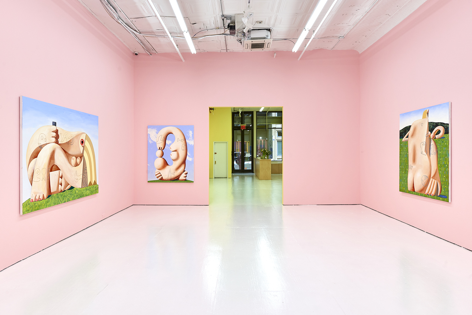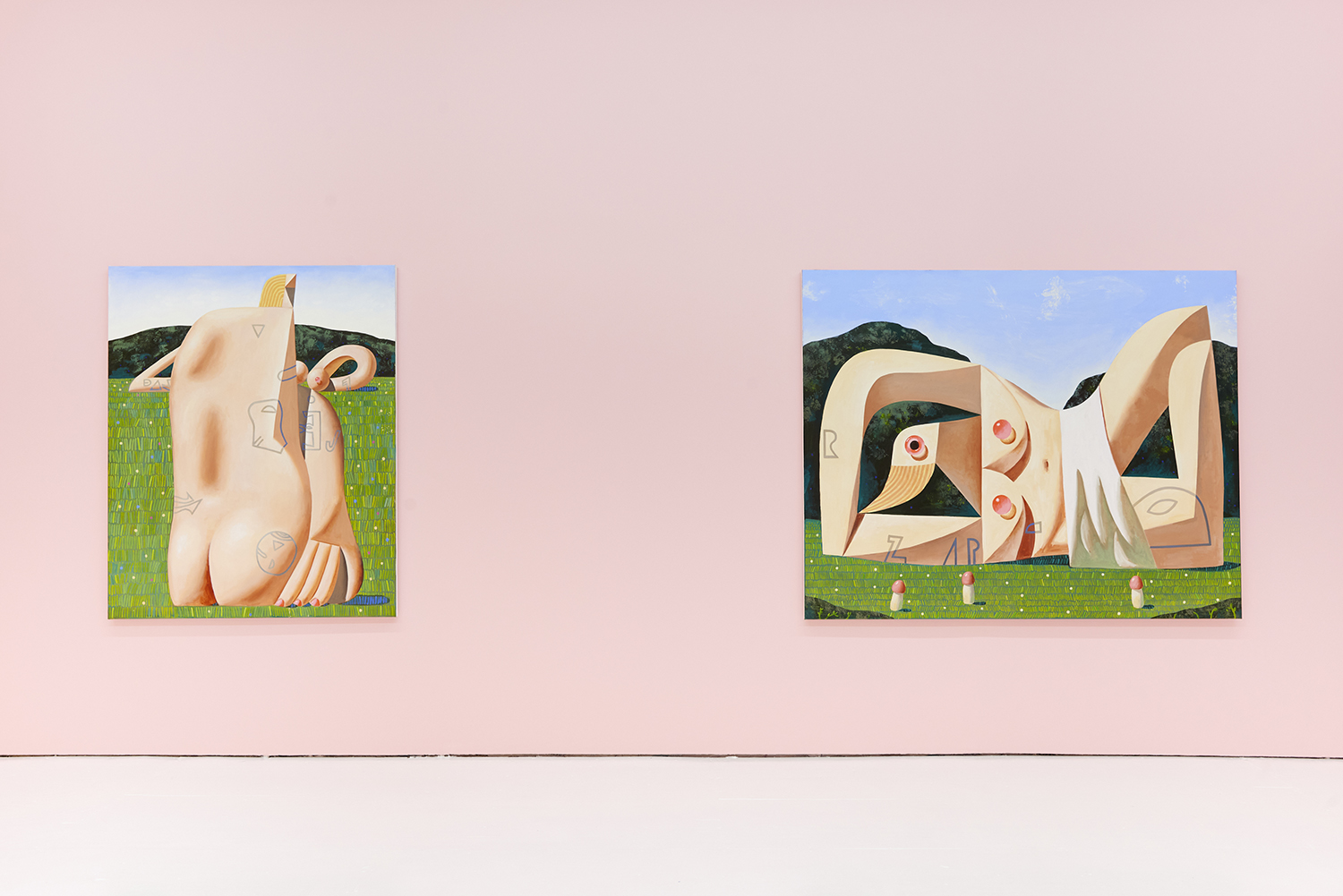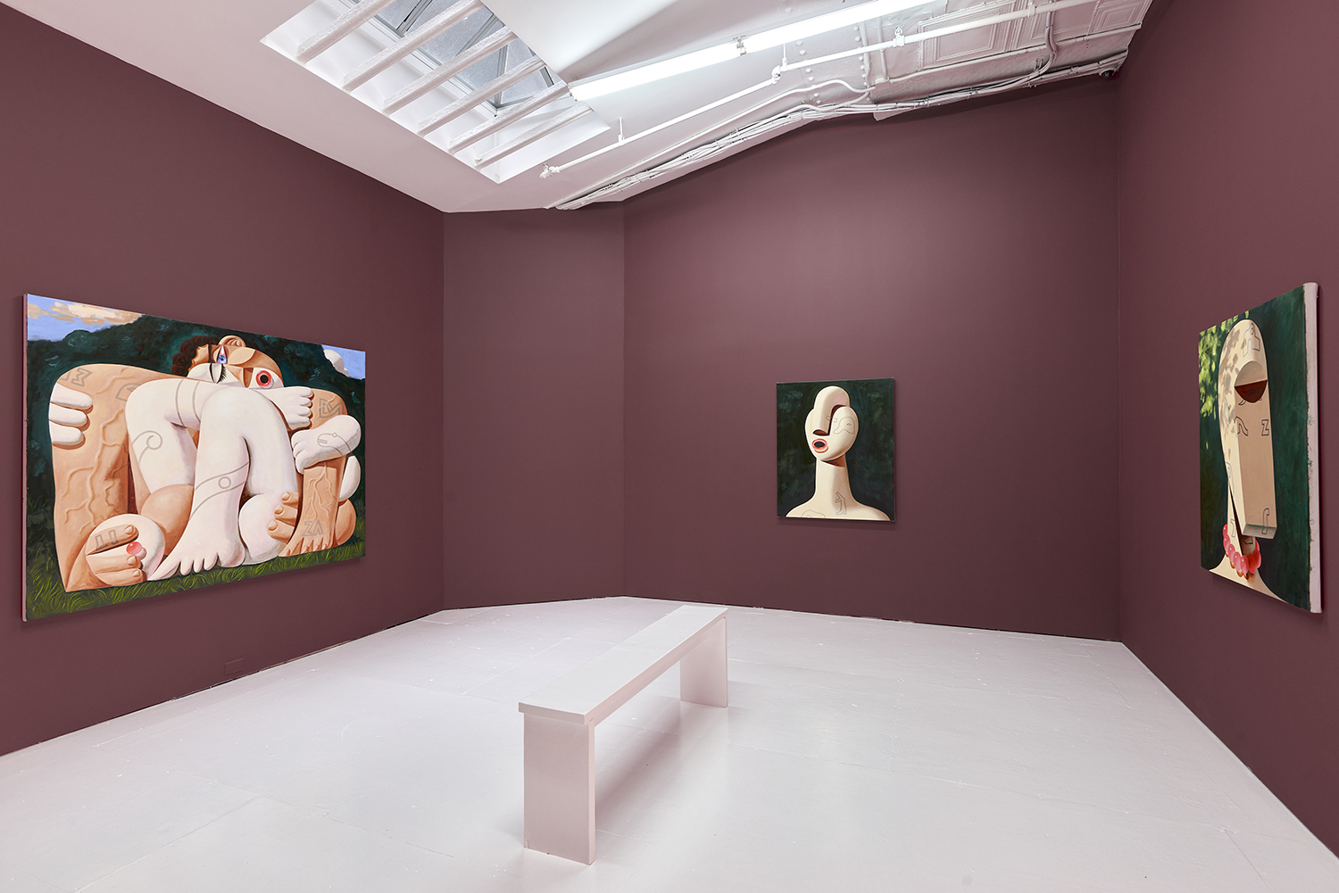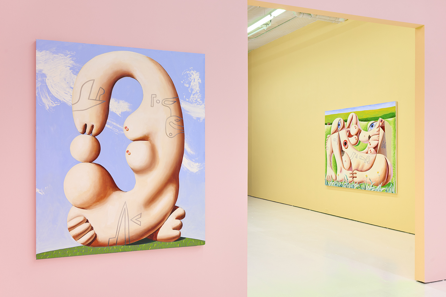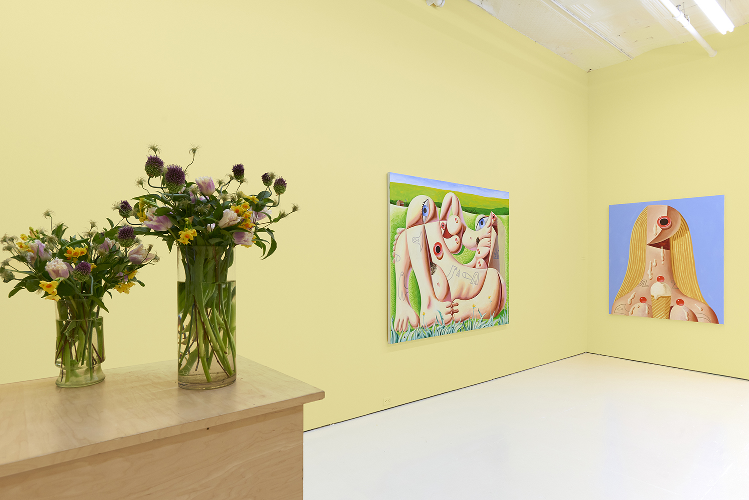 Park begins each canvas according to the rules of classical composition before abandoning logic, letting figures take form from intuition. The contortion of Park’s figures and the placement of their tattoos offer pathways into and out of his compositions: he describes the intended effect as a kind of visual möbius strip. The jumbled limbs of Park’s entangled forms feel liberated, free from clothing, gravity and reality. Where a hand grasps a forearm or a toe touches a tit, the atmosphere is full of tenderness. Biological sex is articulated through an assortment of parts, though not often predictably: fingers and breasts might come in threes, a nipple is indistinguishable from a maraschino cherry, arms go boneless to encircle a lover.