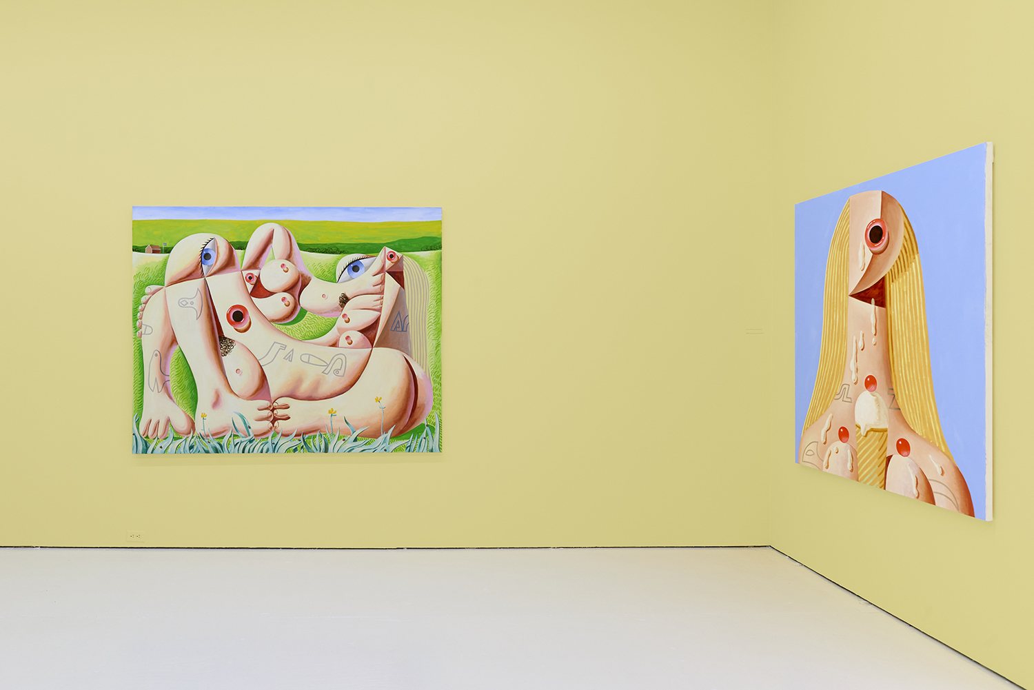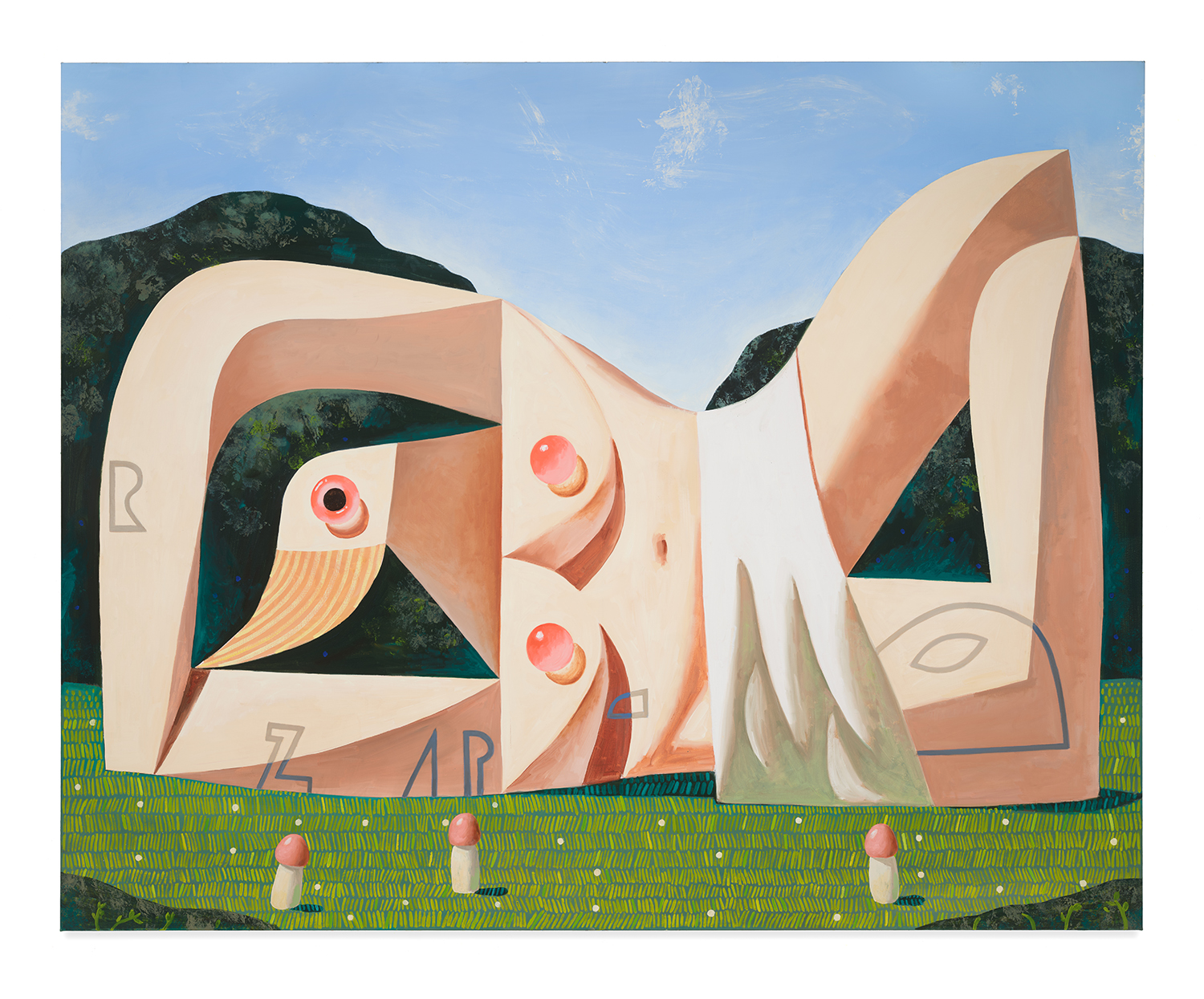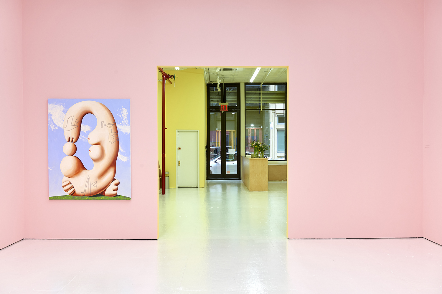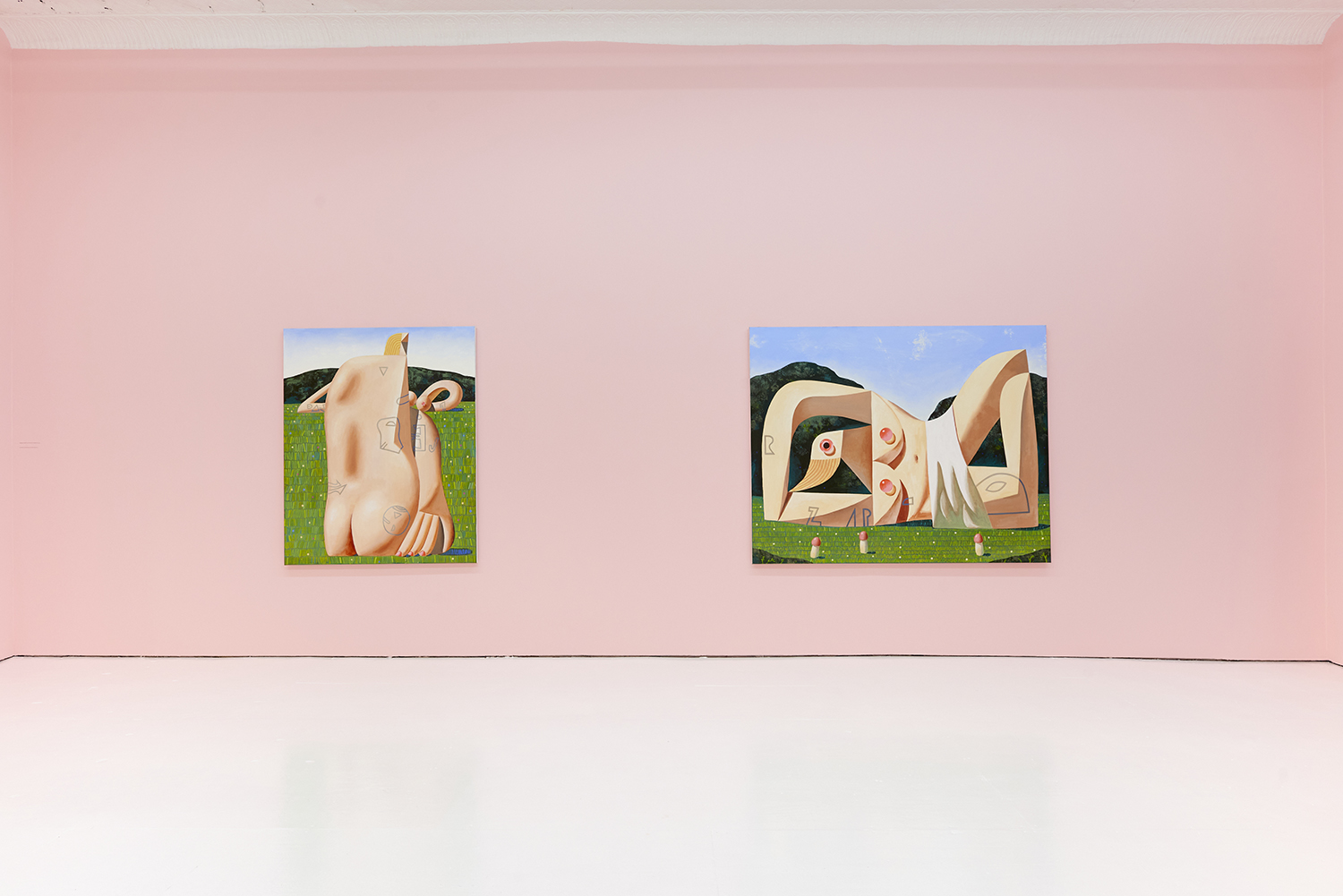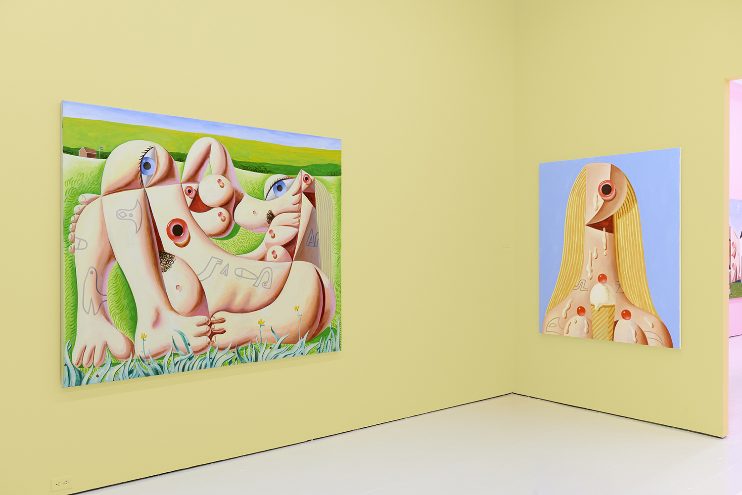 Park begins each canvas according to the rules of classical composition before abandoning logic, letting figures take form from intuition. The contortion of Park’s figures and the placement of their tattoos offer pathways into and out of his compositions: he describes the intended effect as a kind of visual möbius strip. The jumbled limbs of Park’s entangled forms feel liberated, free from clothing, gravity and reality. Where a hand grasps a forearm or a toe touches a tit, the atmosphere is full of tenderness. Biological sex is articulated through an assortment of parts, though not often predictably: fingers and breasts might come in threes, a nipple is indistinguishable from a maraschino cherry, arms go boneless to encircle a lover.