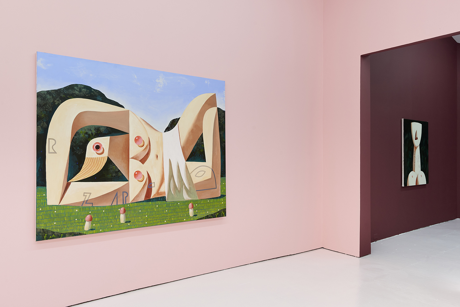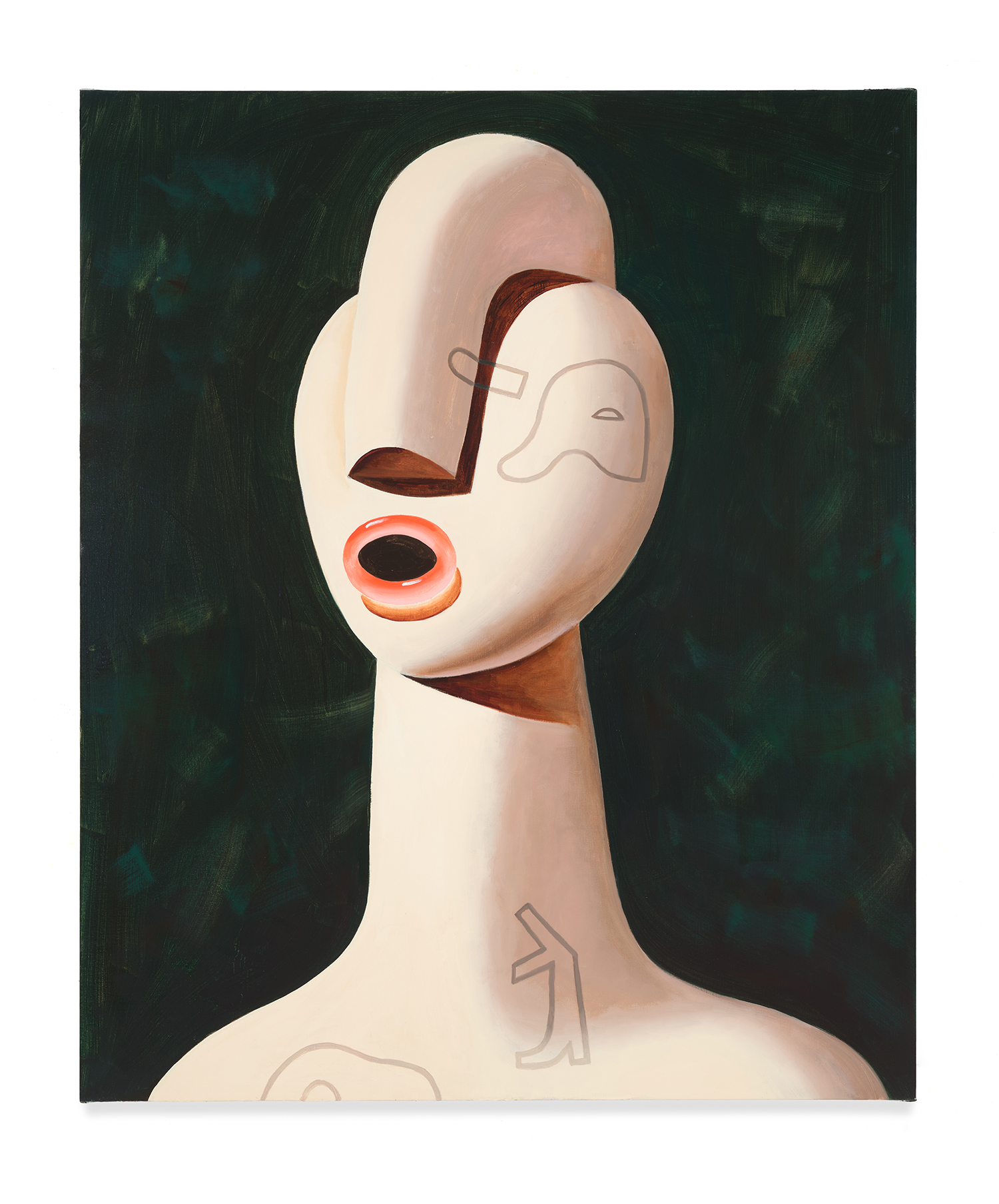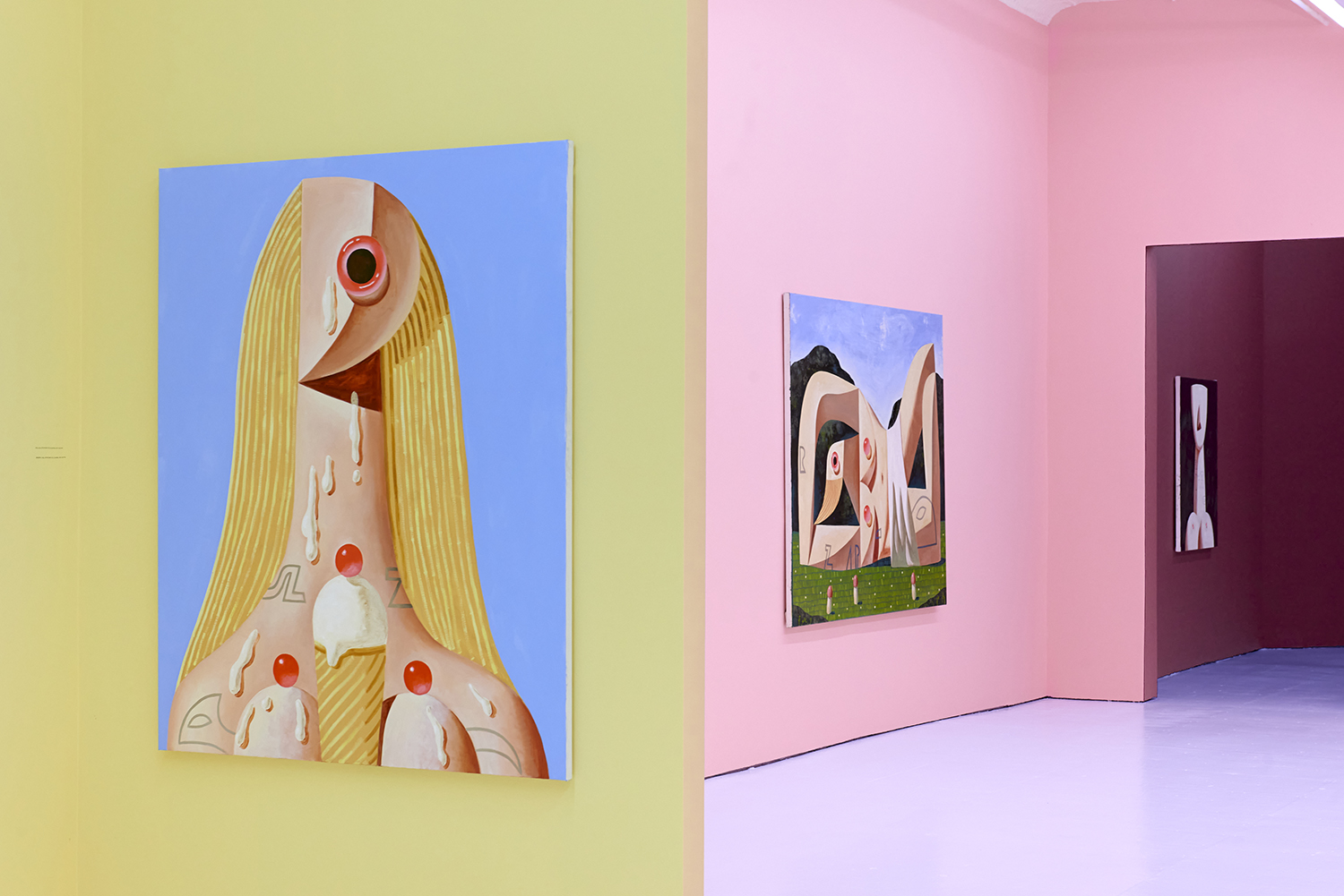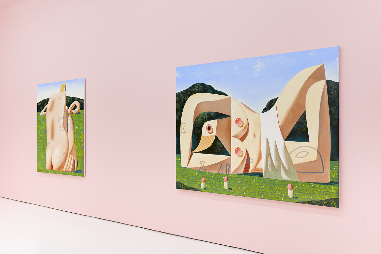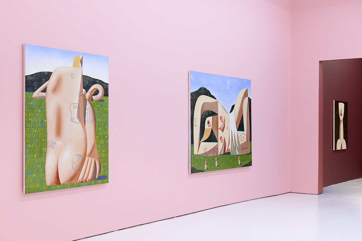 Park begins each canvas according to the rules of classical composition before abandoning logic, letting figures take form from intuition. The contortion of Park’s figures and the placement of their tattoos offer pathways into and out of his compositions: he describes the intended effect as a kind of visual möbius strip. The jumbled limbs of Park’s entangled forms feel liberated, free from clothing, gravity and reality. Where a hand grasps a forearm or a toe touches a tit, the atmosphere is full of tenderness. Biological sex is articulated through an assortment of parts, though not often predictably: fingers and breasts might come in threes, a nipple is indistinguishable from a maraschino cherry, arms go boneless to encircle a lover.