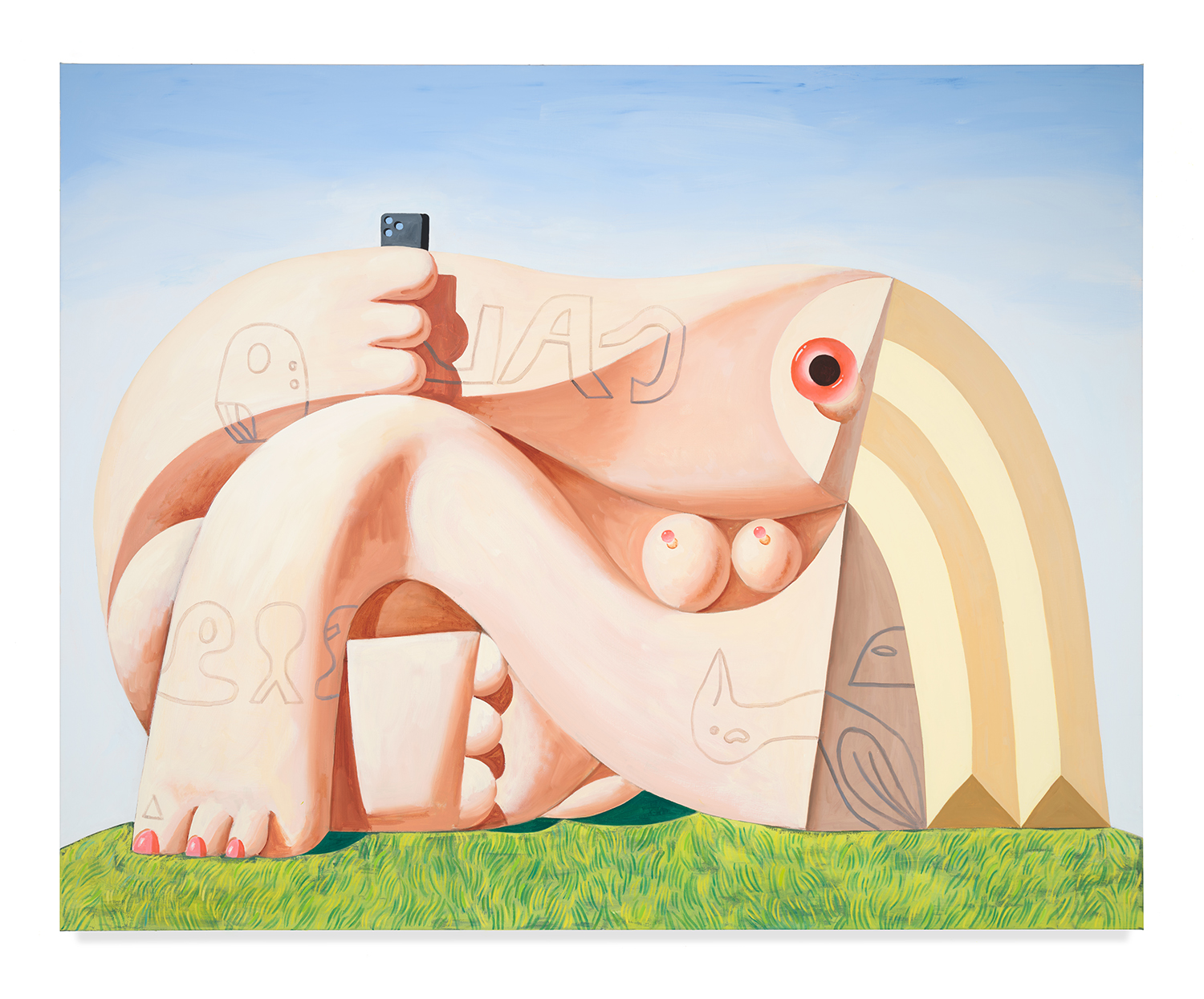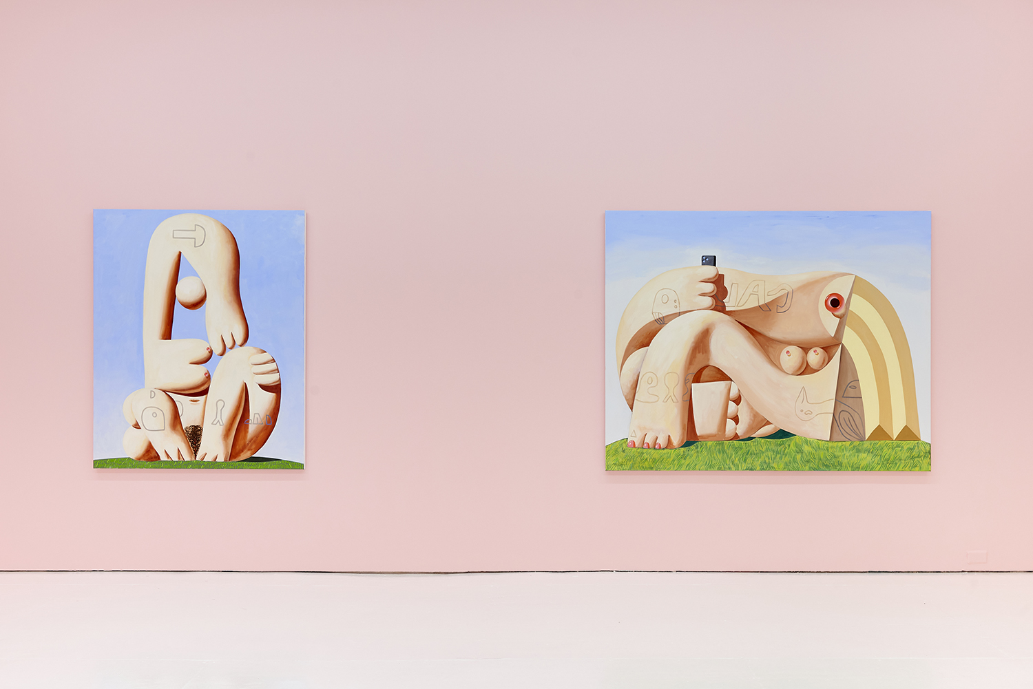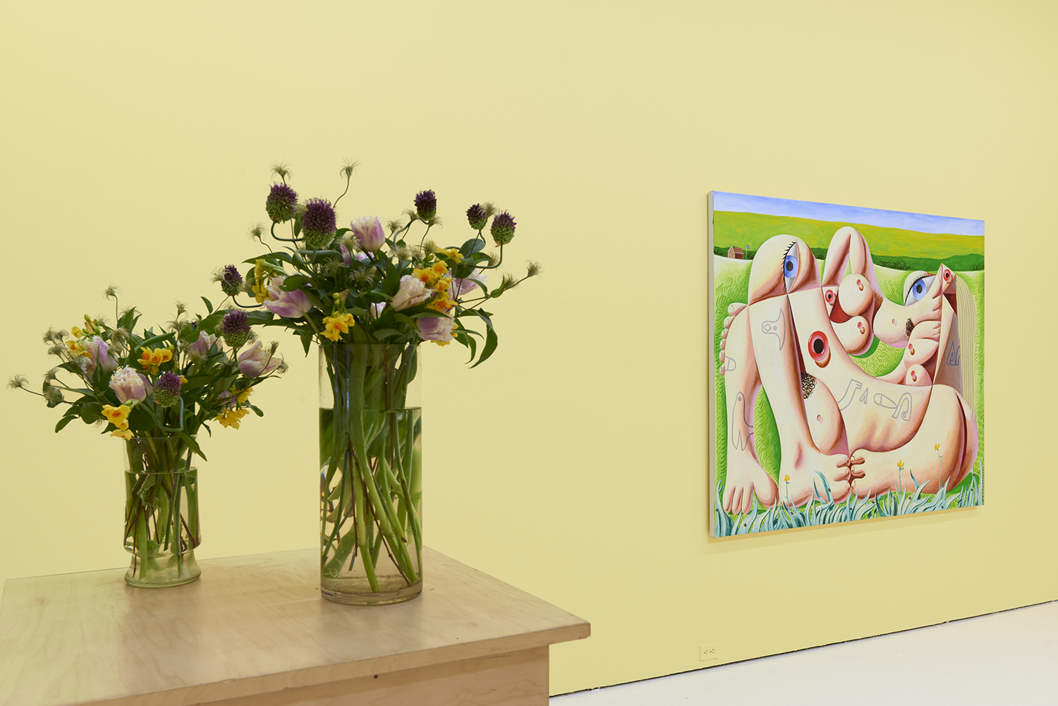 A saturated palette places the paintings firmly in the bright sunshine of a hot summer day. The sun is directly overhead beaming tight shadows of mid afternoon onto rosy figures, almost certainly not wearing enough sunscreen, reminding us of the joys of June. In Madeleine ice cream melts, in Woman On The Grass a contemporary odalisque lounges on her phone and in The Lovers two bodies tangle nude in the grass. Each canvas is filled nearly edge-to-edge with fleshy bits and a maximalist joy that is reflected in the show’s title inviting the viewer to also indulge, to picnic in the park, to snooze in the sun, topless tan or have a summer fling.