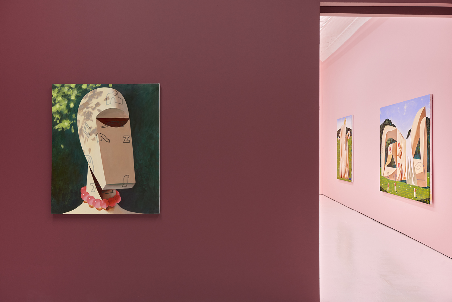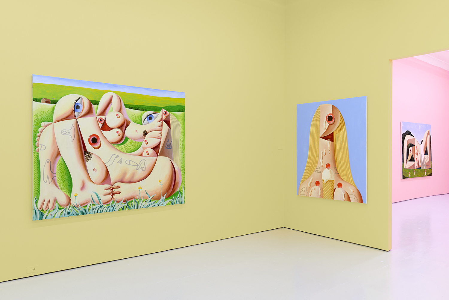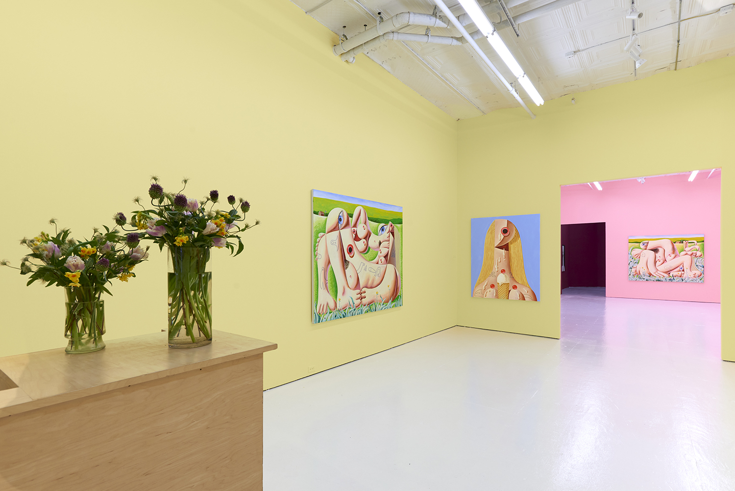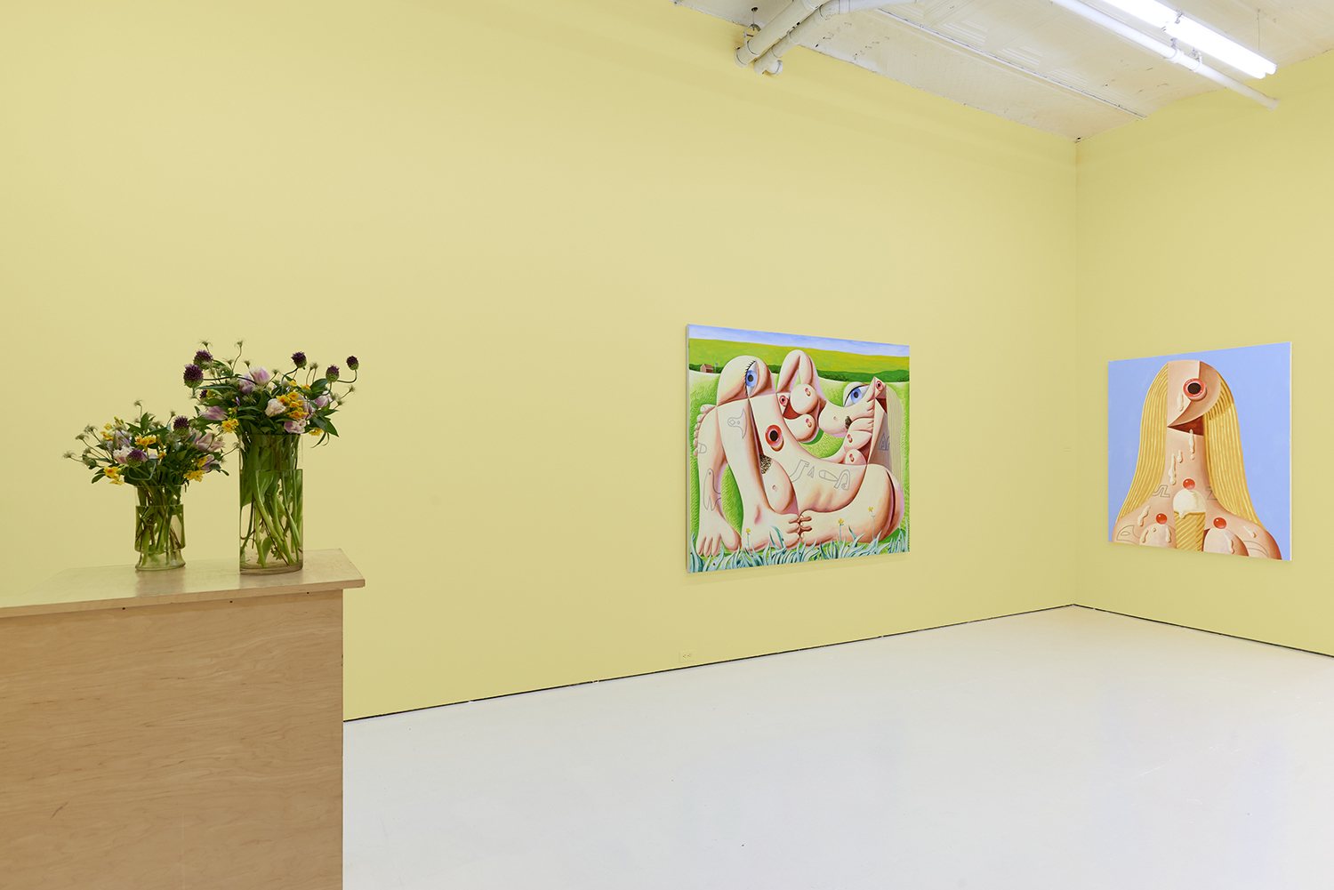 A saturated palette places the paintings firmly in the bright sunshine of a hot summer day. The sun is directly overhead beaming tight shadows of mid afternoon onto rosy figures, almost certainly not wearing enough sunscreen, reminding us of the joys of June. In Madeleine ice cream melts, in Woman On The Grass a contemporary odalisque lounges on her phone and in The Lovers two bodies tangle nude in the grass. Each canvas is filled nearly edge-to-edge with fleshy bits and a maximalist joy that is reflected in the show’s title inviting the viewer to also indulge, to picnic in the park, to snooze in the sun, topless tan or have a summer fling.