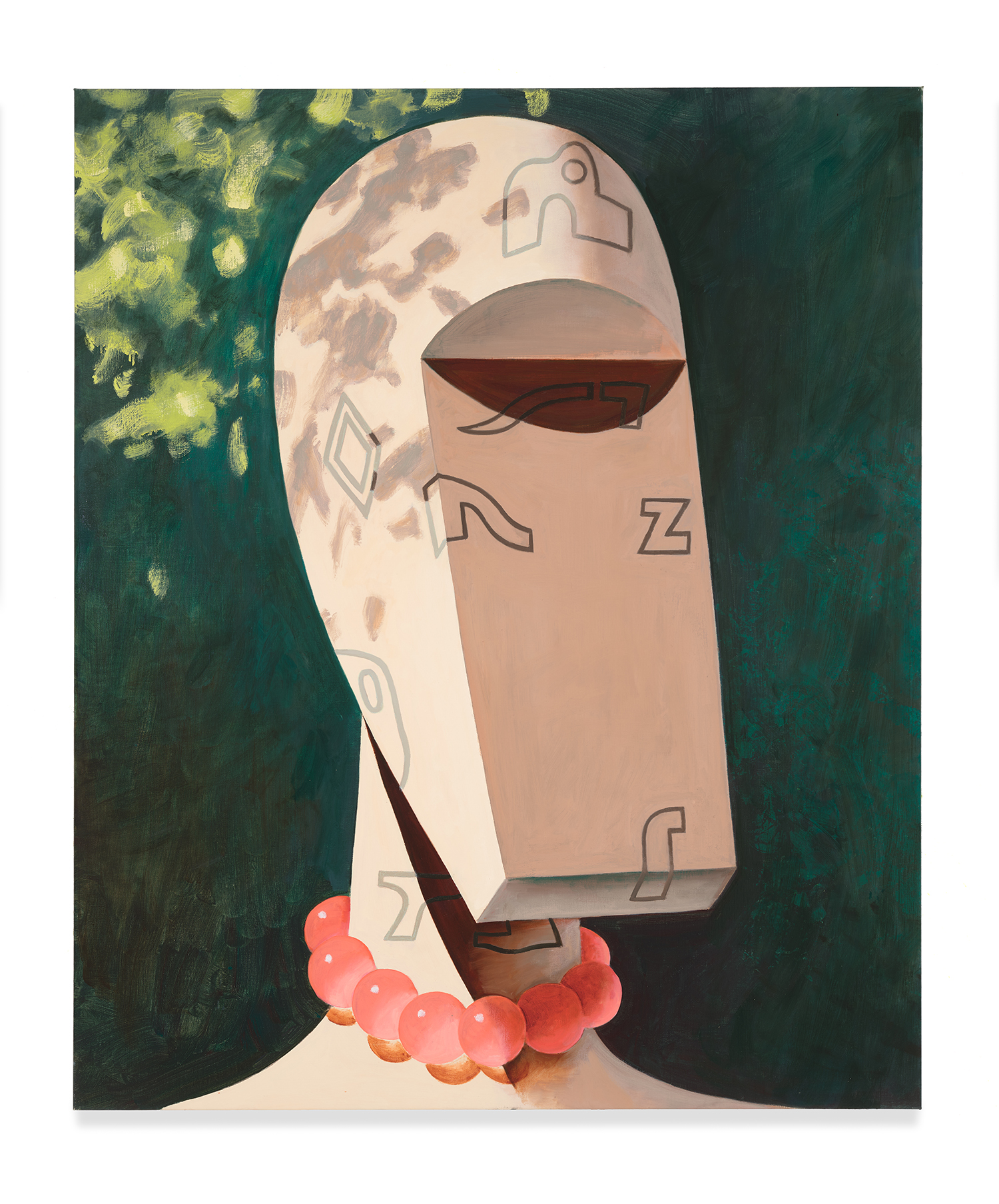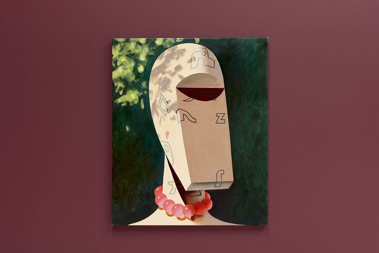 Across the twelve paintings all the figures sport tattoos. Interested in the way a tattoo’s flatness can compress history, Park depicts the human body as a canvas capable of carrying a plethora of context: A forearm as a plane that can feature hieroglyphs, runes and cartoons with a unique proximity. He cites Jean Miró, Hilma af Klint, and the Swedish artist Öyvind Fahlström as pioneers of this kind of multilayered, icon-infused painting.