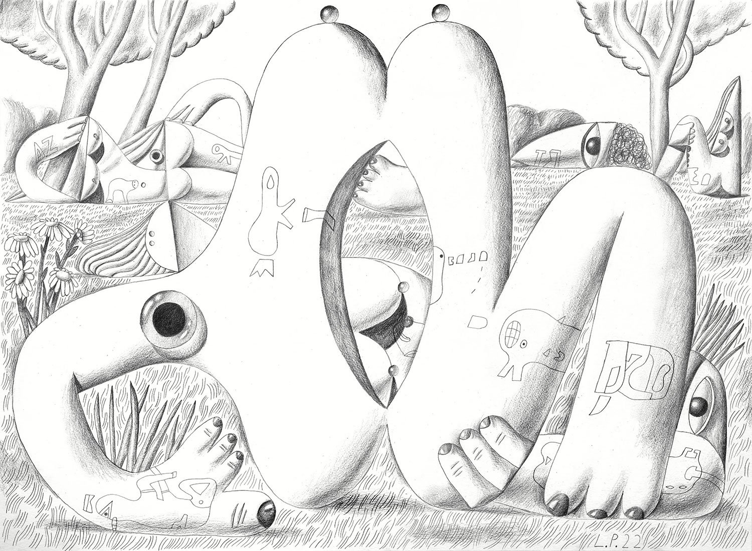 In this show we include female body as landscape but also male body as landscape and also no-body as landscape, as well as some humorous gender chiché-upending and an actual hairy man-scape from Magda Kirk.