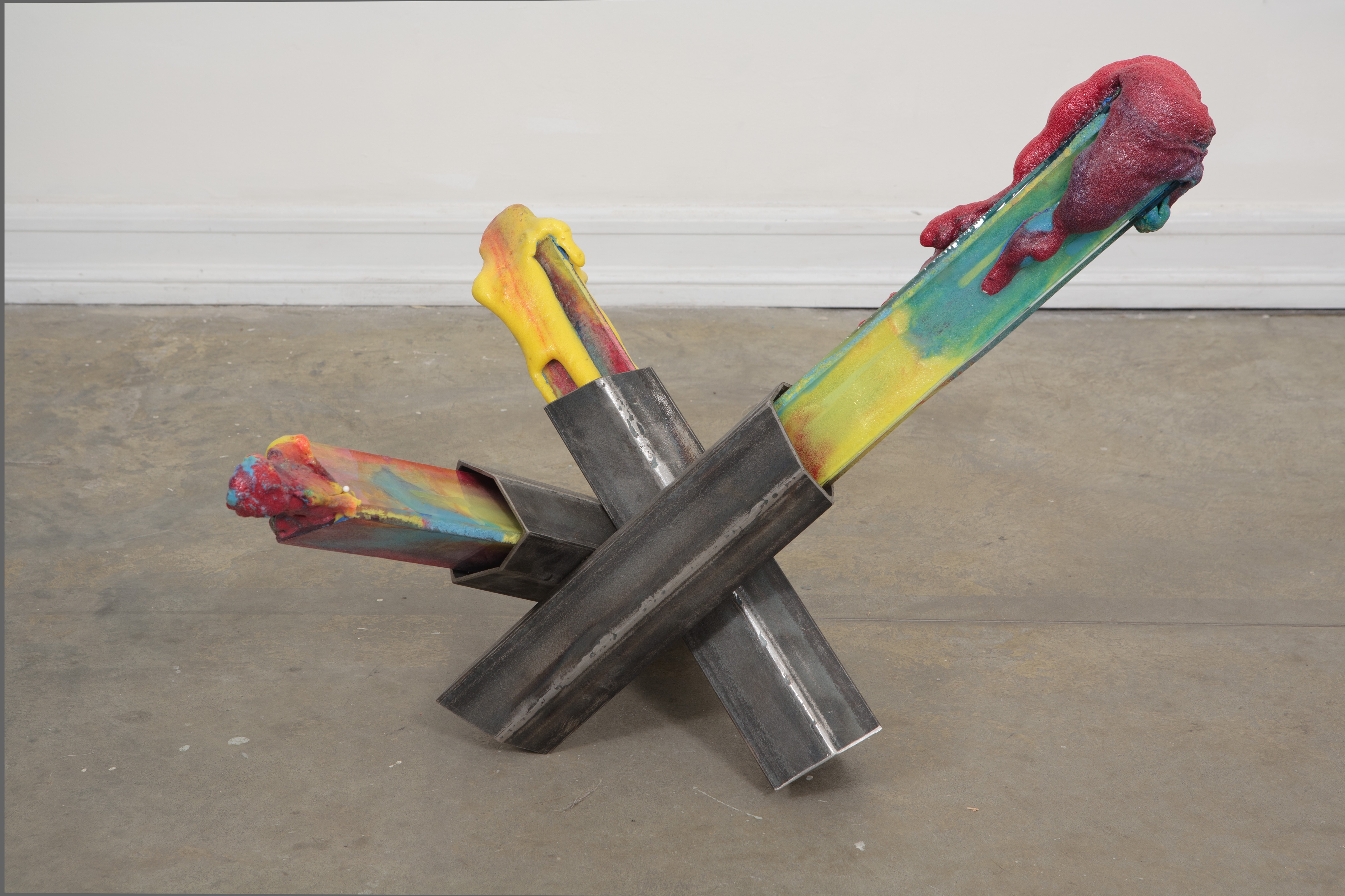 The large group of leaning, elongated triangular tubes in the rear of the gallery is a nod to spiritual minimalist John McCracken and is titled Prism. The multi-material filled tubes contain frozen gestures, spills and drips; and, like an ant farm, embody contained chaotic activity and emergent order.