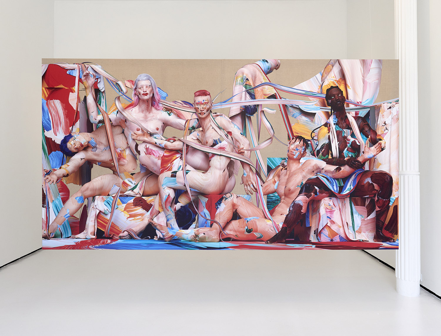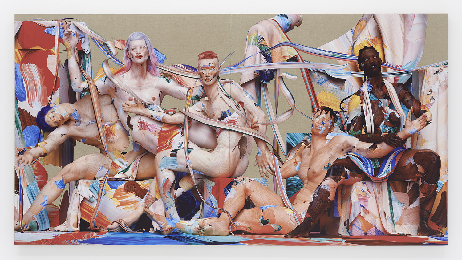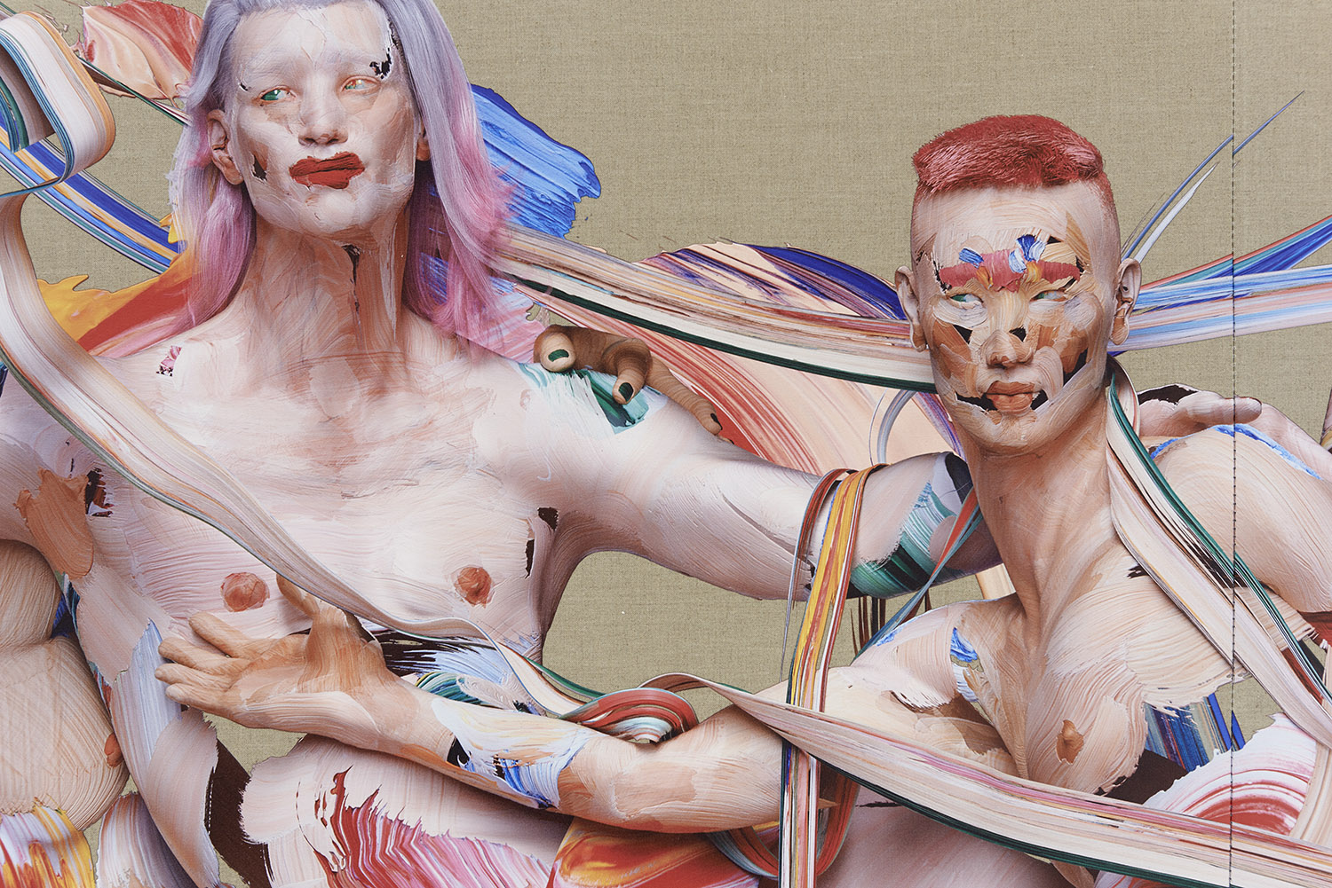 This large-scale figurative work is made through an innovative technique for painting the figure developed by the artist over the past few years. Paint marks are created on glass and scanned on top and underneath to create a 3D paint gesture. Hundreds of these marks are compiled in 3D programs to create the composition. Stretched and shaped, wrapping around a muscle or transparently layered to light up a volume, these digitized brush strokes are used like an oil painter would to form not just figures but draperies, environments and pure painterly exuberance.