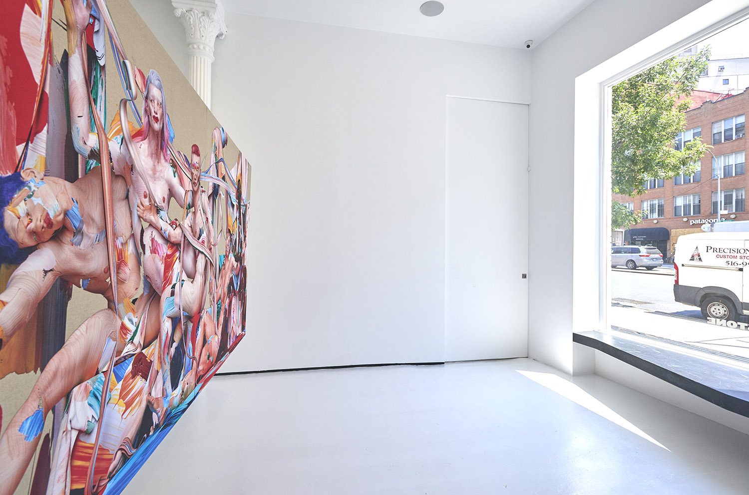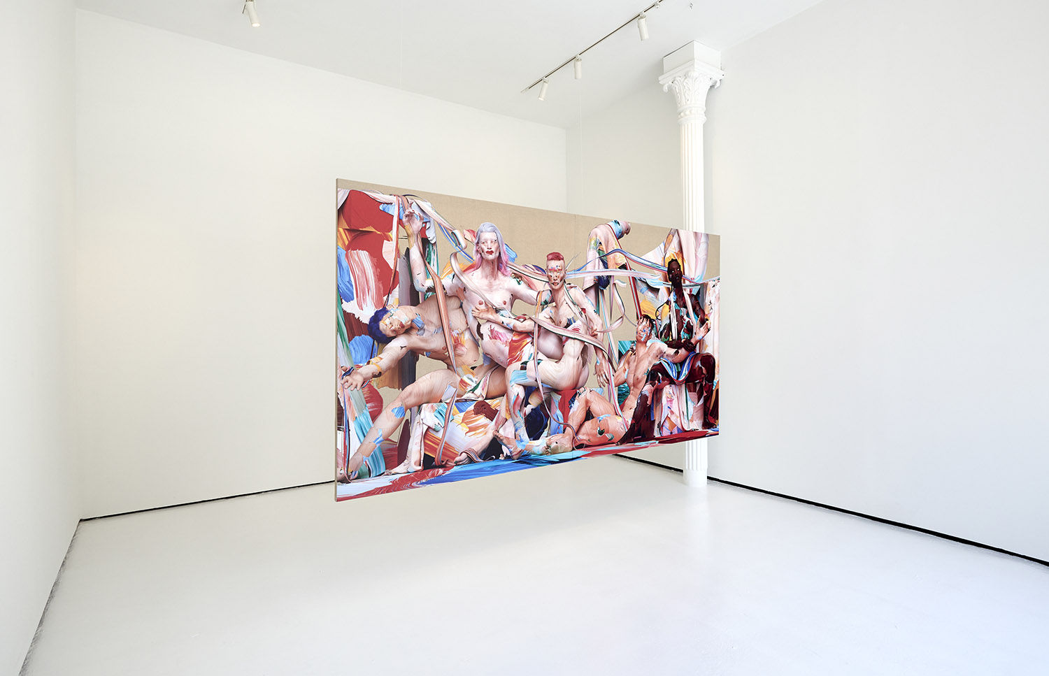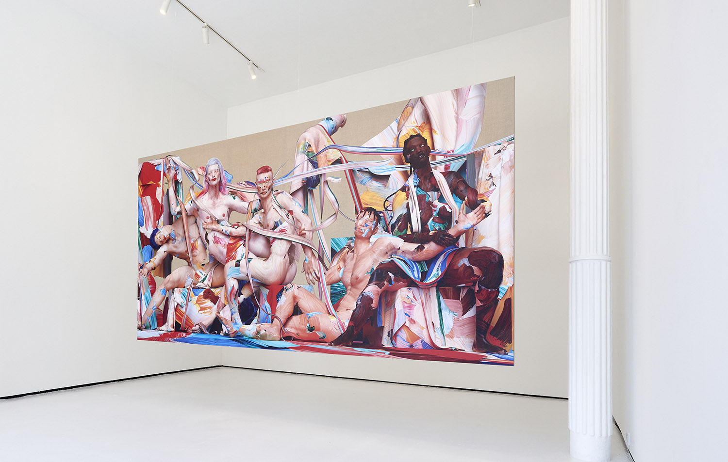 This large-scale figurative work is made through an innovative technique for painting the figure developed by the artist over the past few years. Paint marks are created on glass and scanned on top and underneath to create a 3D paint gesture. Hundreds of these marks are compiled in 3D programs to create the composition. Stretched and shaped, wrapping around a muscle or transparently layered to light up a volume, these digitized brush strokes are used like an oil painter would to form not just figures but draperies, environments and pure painterly exuberance.