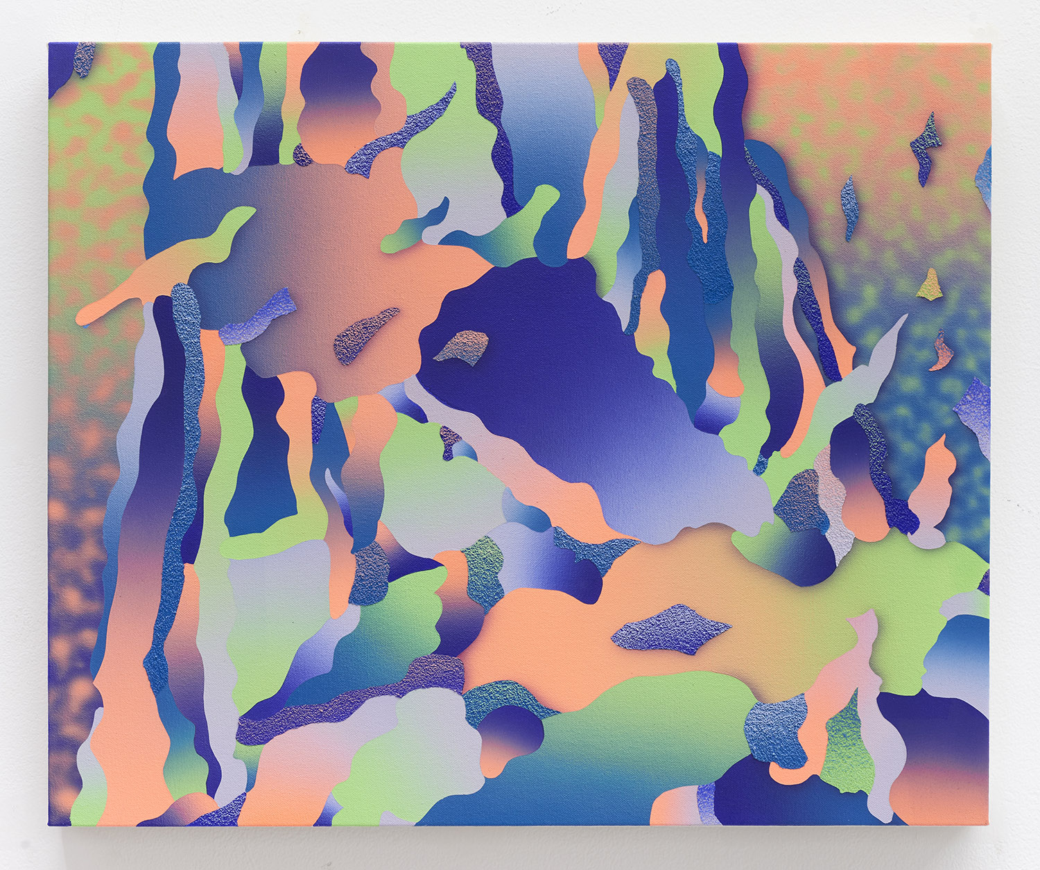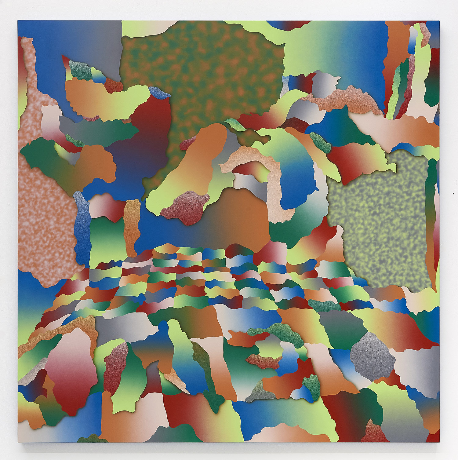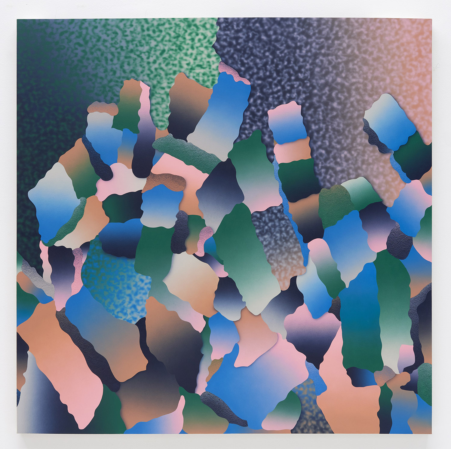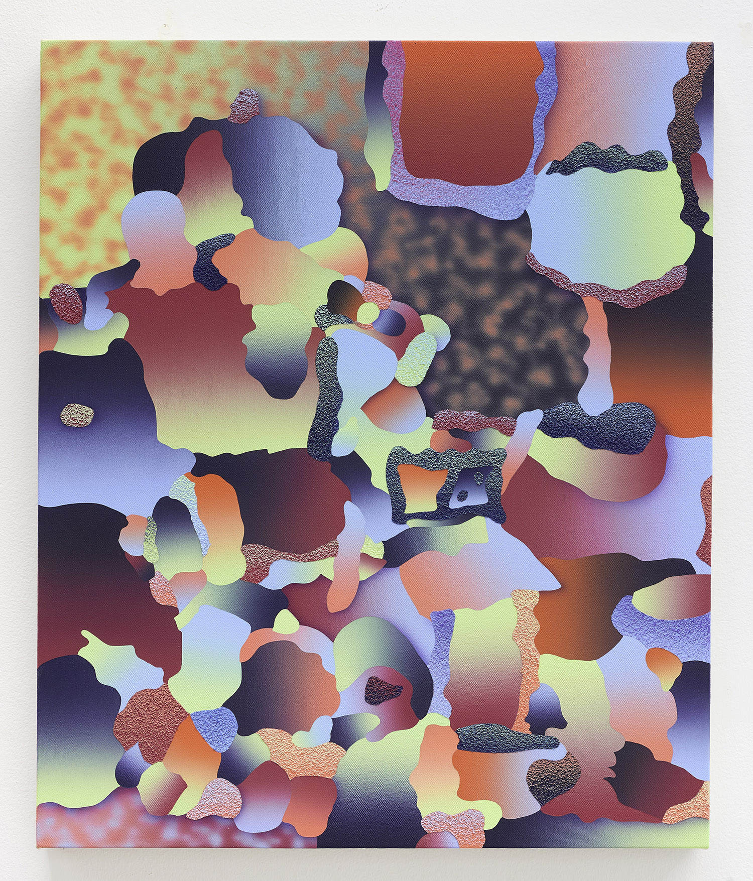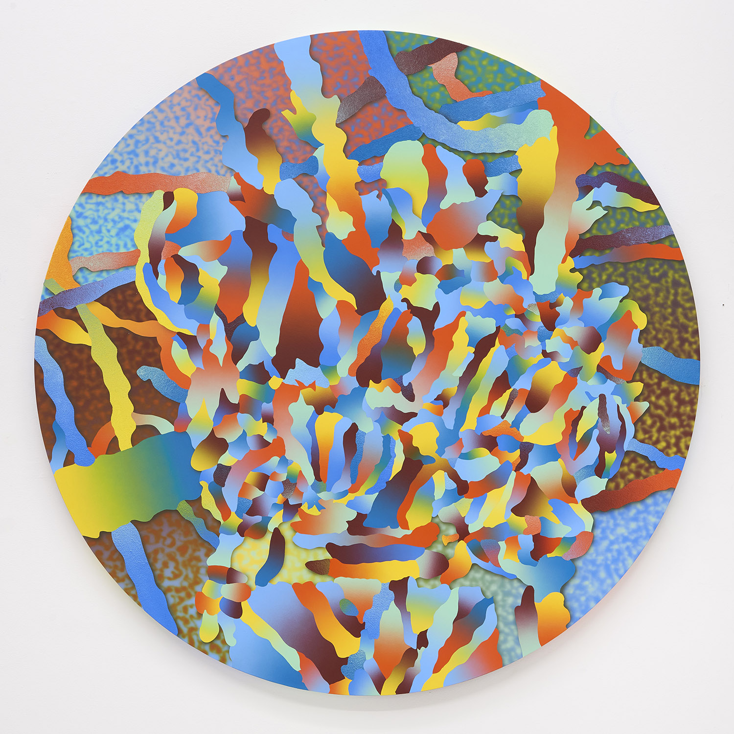 Ranging in size—and shape—from the petite to the immersive, these textured airbrush paintings continue to explore her world of gradient-crazed semi-abstraction. Originating as sketches in clay (yes, you read that right) the shapes and colors are enlarged onto the canvas into tightly taped-off areas of sprayed paint and sand; rectangle, square and tondo. As you can see above, Blair generates a huge amount of intense visual information, a tangle or thicket of irresolvable action.