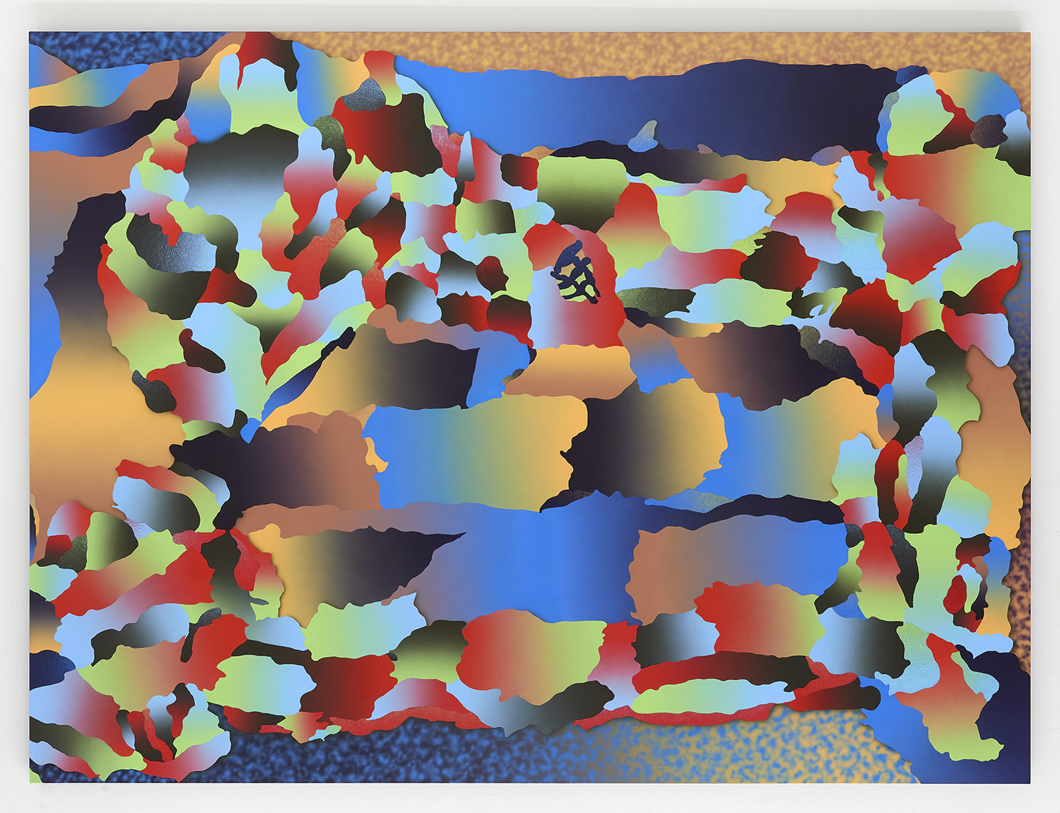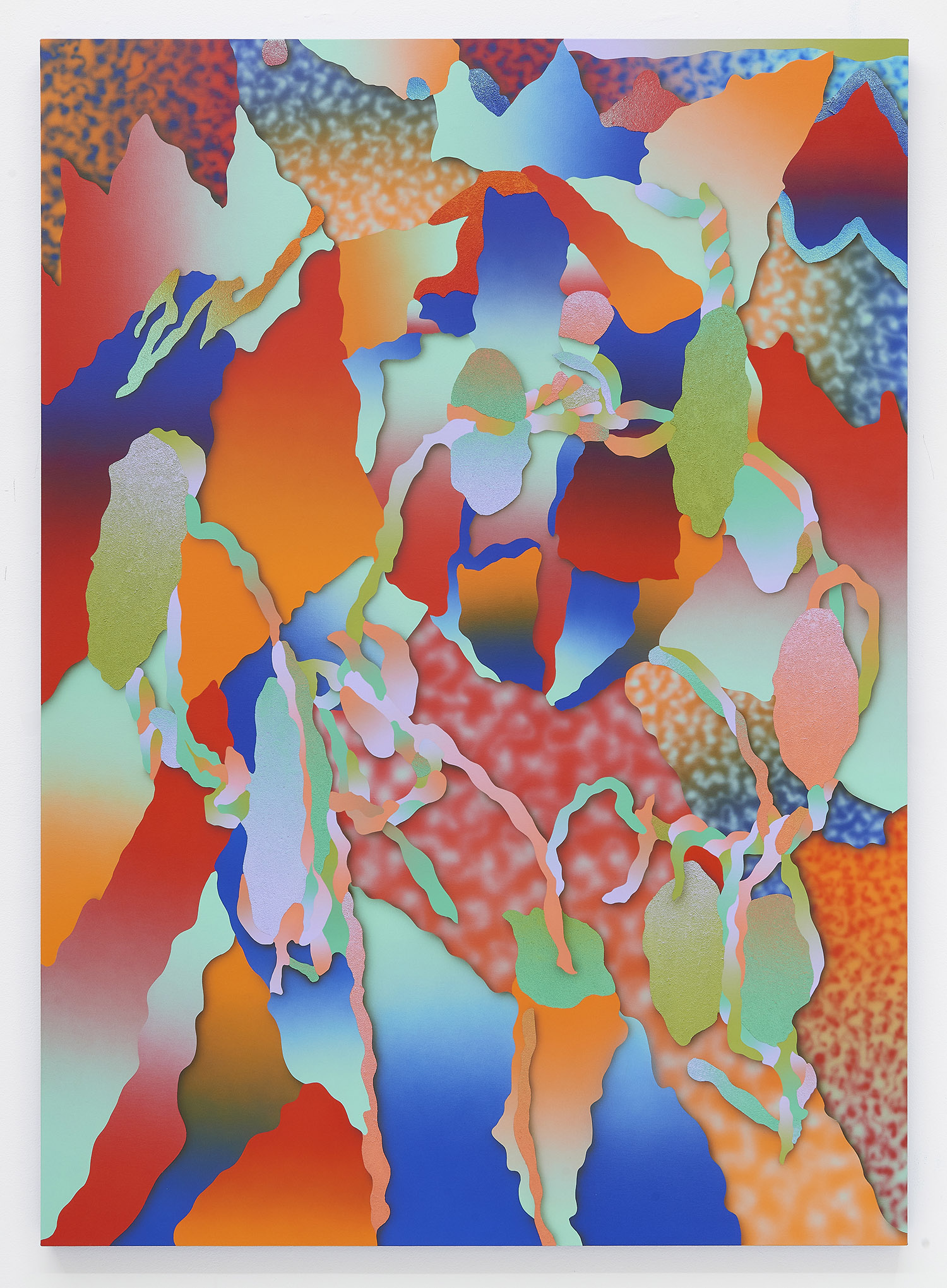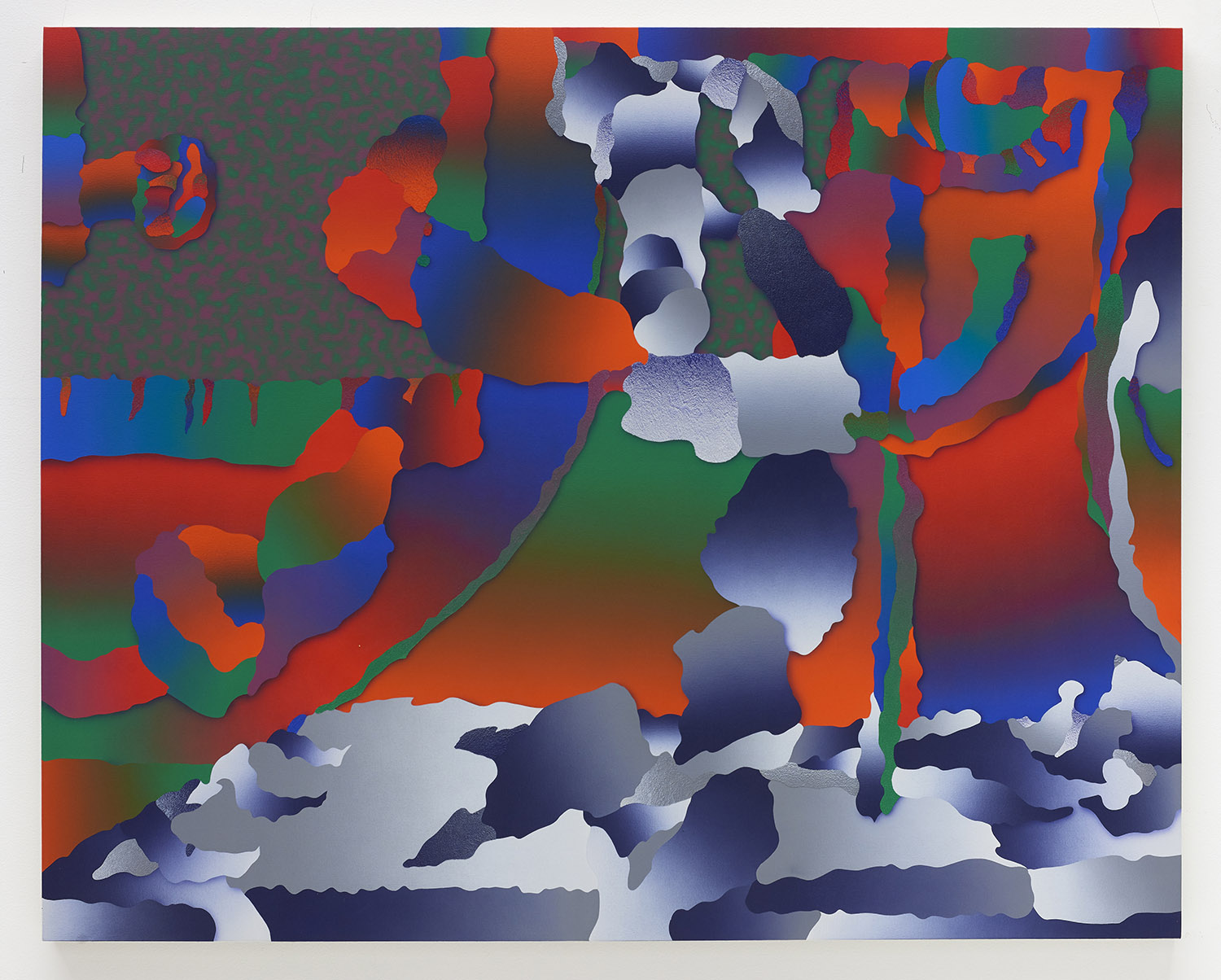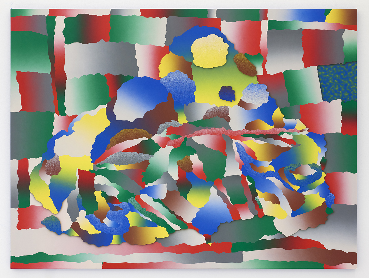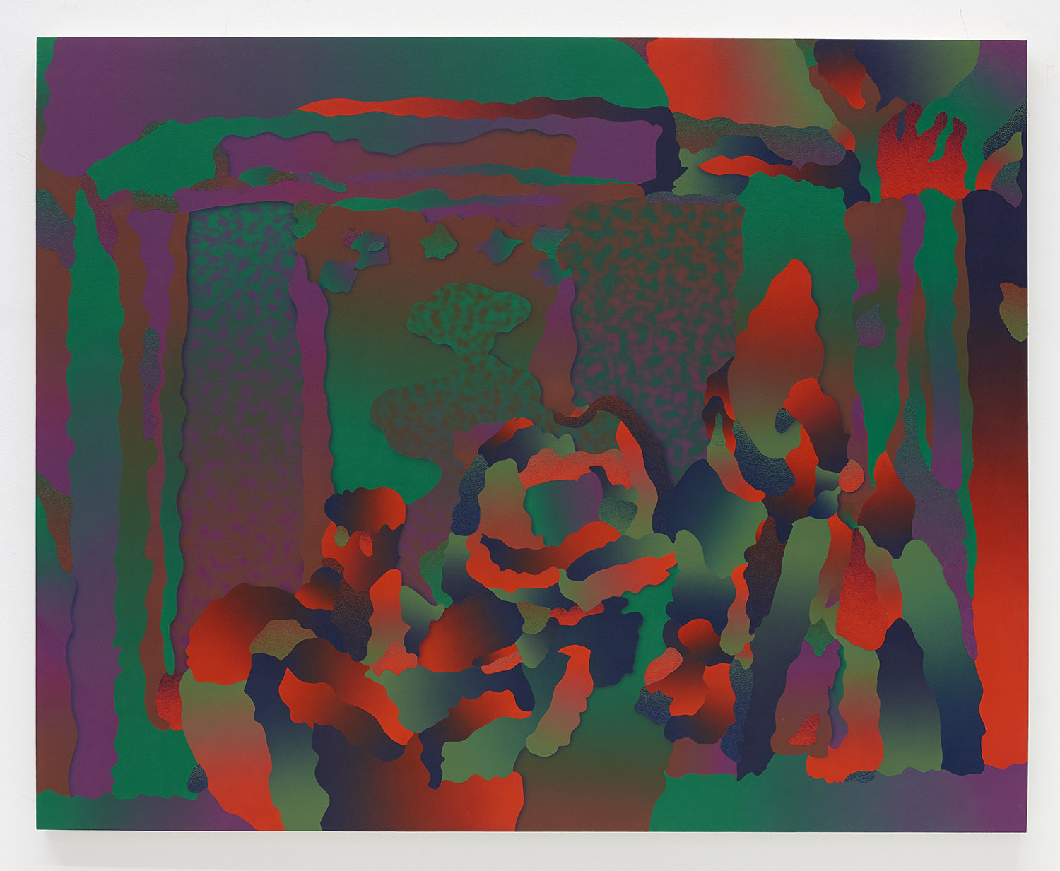 Ranging in size—and shape—from the petite to the immersive, these textured airbrush paintings continue to explore her world of gradient-crazed semi-abstraction. Originating as sketches in clay (yes, you read that right) the shapes and colors are enlarged onto the canvas into tightly taped-off areas of sprayed paint and sand; rectangle, square and tondo. As you can see above, Blair generates a huge amount of intense visual information, a tangle or thicket of irresolvable action.