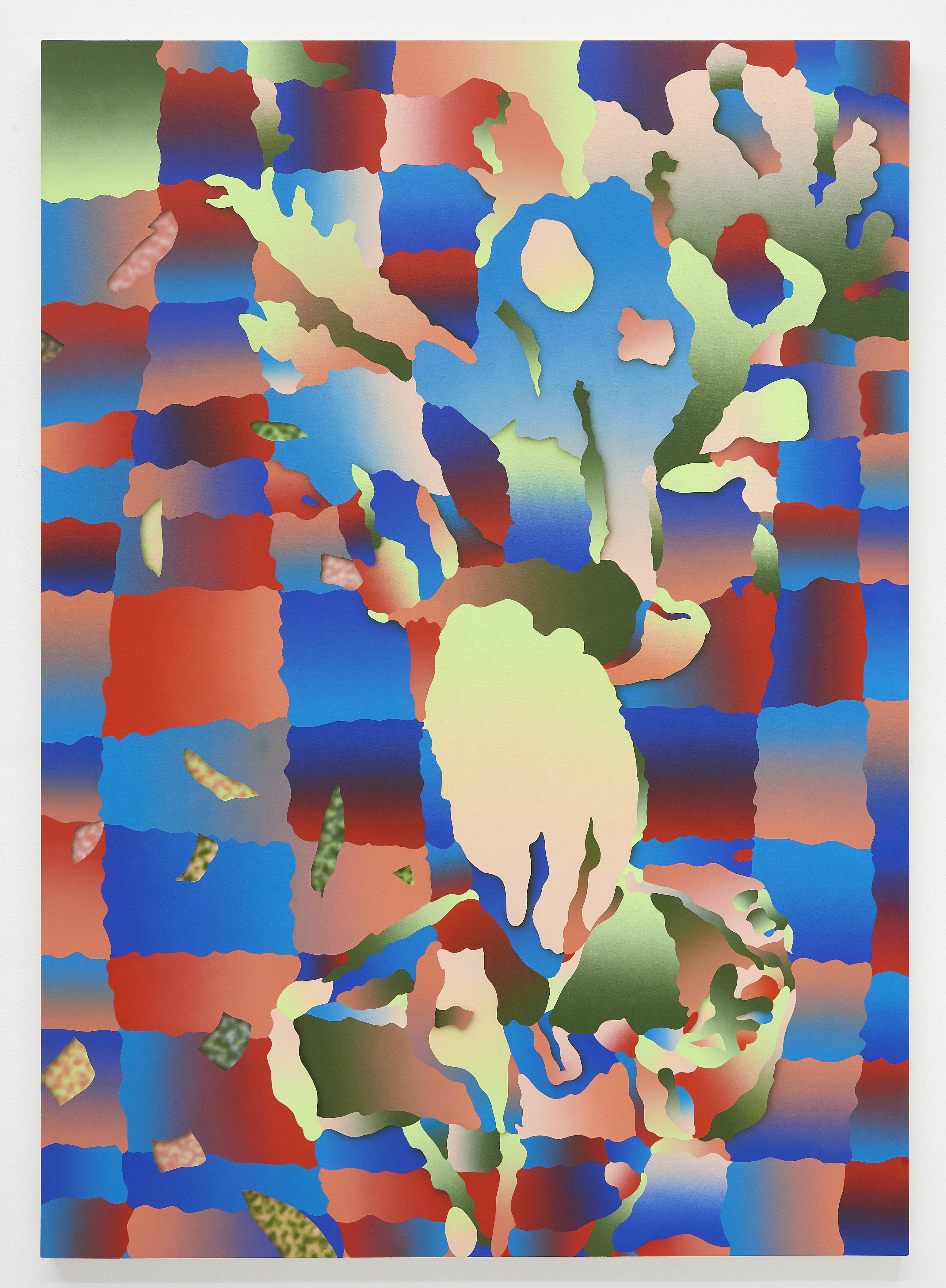 With backgrounds like TV static and foregrounds of tasty sand bits, these paintings have a three-dimensional quality of form and color with volume but seemingly no mass. The hovering gradients have a screen-like quality of course but the shapes feel like torn and collaged bits, or yes, lumpy claymation forms. While her last show drew on Youtube tutorials, Craigstlist “free stuff” and screenshots from amateur claymation, this show is less about random internet junk and more purposefully “molded” through preparatory clay sketches. The titles as well are no longer spam word jazz but now are rambling sequential excerpts from a fictional autobiographical tell-all outside a Closeout Heaven.