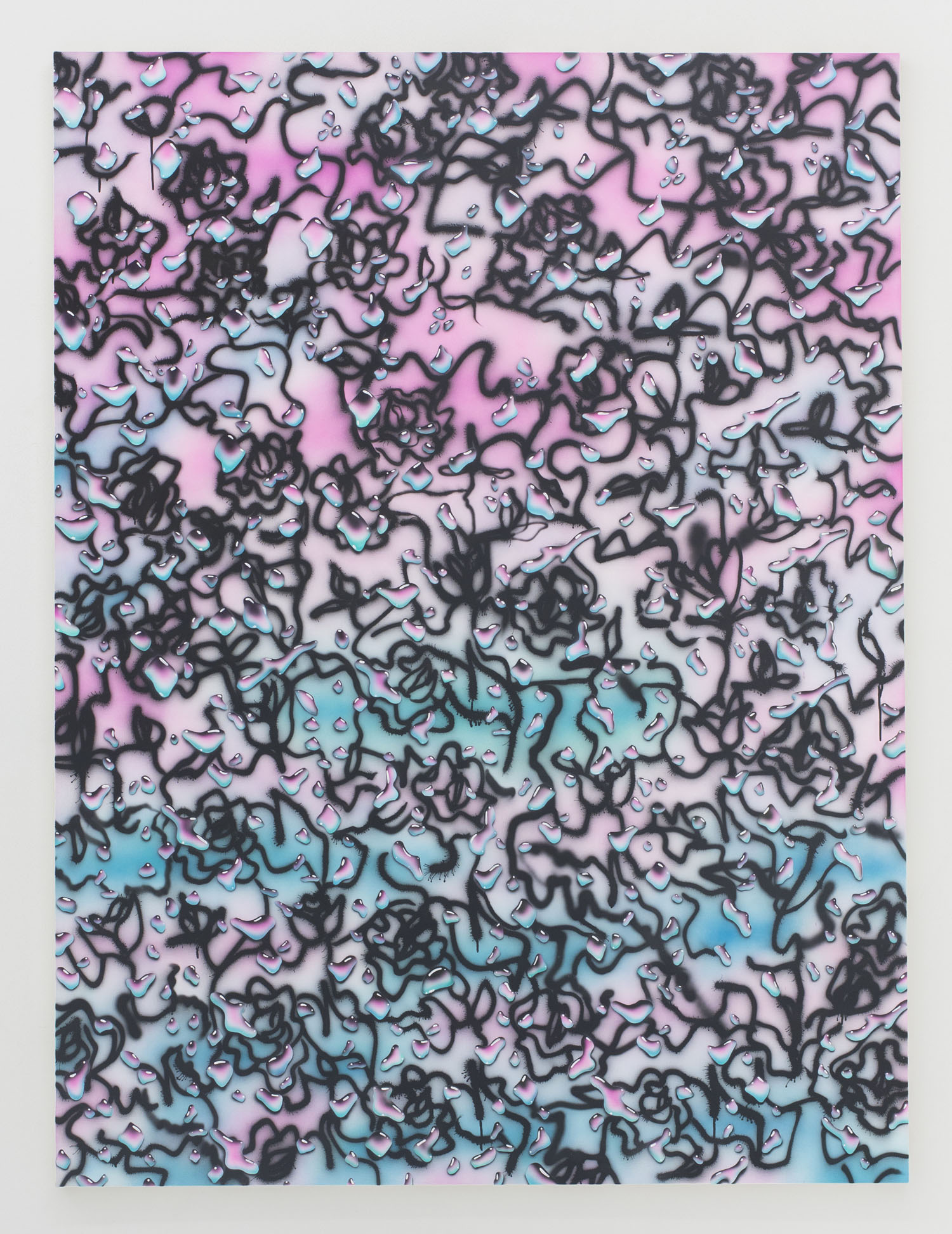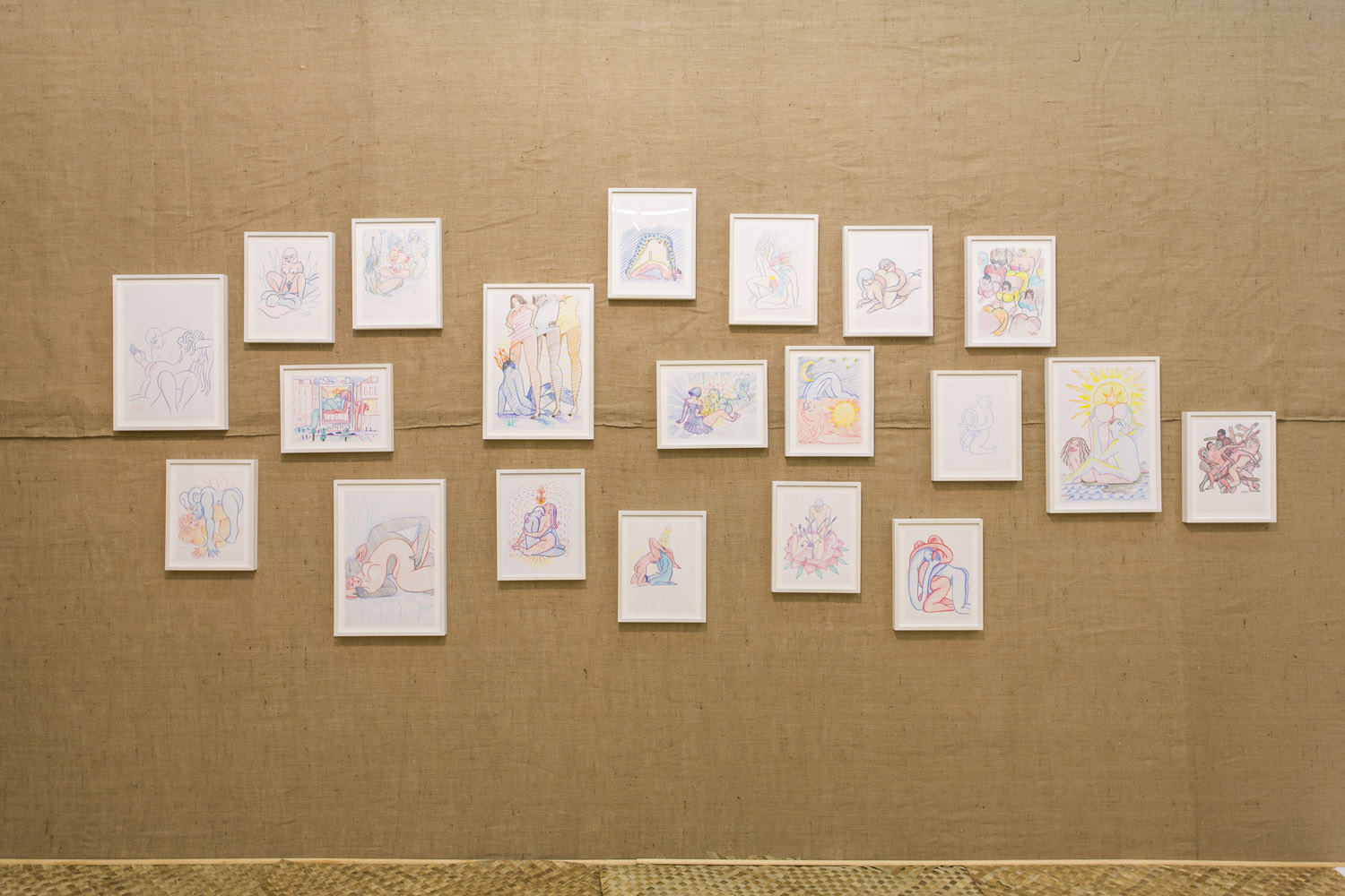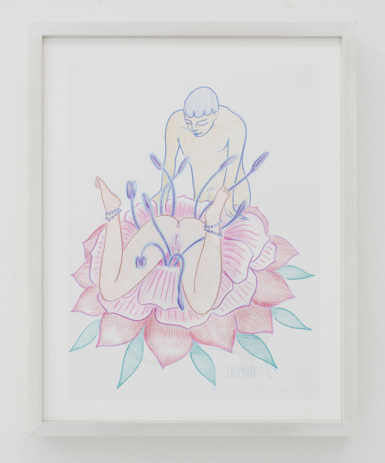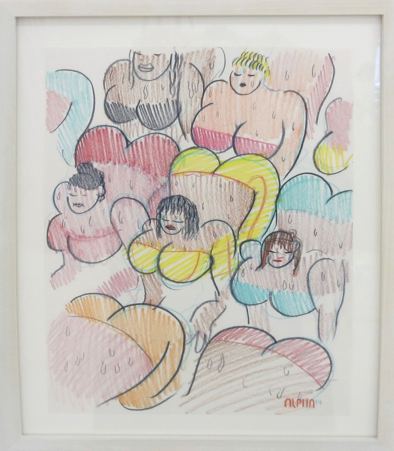 One strong and visceral theme in the show is the infusion of libidinal energy in the artworks, from the wet ‘n’ wild orgasmic Little Mermaid painting by Michael Dotson even to the smattering of hot droplets across Brian Willmont’s composition. The drawings by Alphachanneling certainly hit this nail on the head with lovely and spiritual renderings of couples and groups fooling around. These colored pencil people, sketched in simple arcs of pinks and blues, are their own sweet sex garden unto themselves.