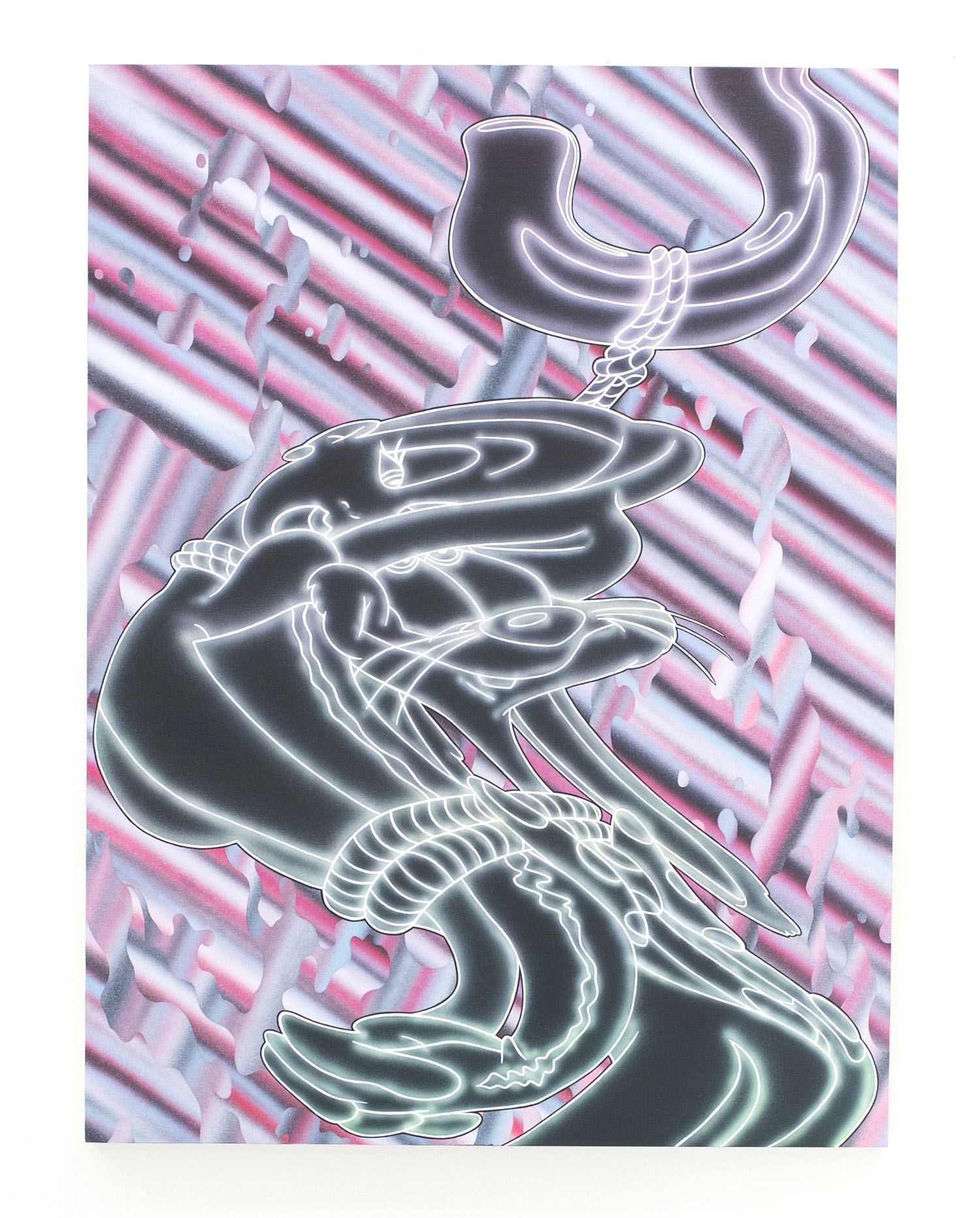 From the aggressively painted and colored “masks” by Ryan Schneider to the delicately lined dream-like paintings on pink panel by Lola Montes Schnabel, the techniques in the show vary, but the confidently illogical use of color continues through the group. A canary yellow cat on a hot pink nude in Todd James’ painting strongly resonates with Matisse’s contours of flat color and makes a specific nod, perhaps, with its bright red background. Josh Reames’ “bad internet” painting of slick airbrushed edges and drop shadows feature pungently indigo lemons and black palm trees. Perhaps furthest “out there” in the realm of bizarro color is Ryan Michael Ford who offers us bright red skies and lakes of lava, aliens and plushies, plus “bubble humpers,” whatever those are, pictured above.