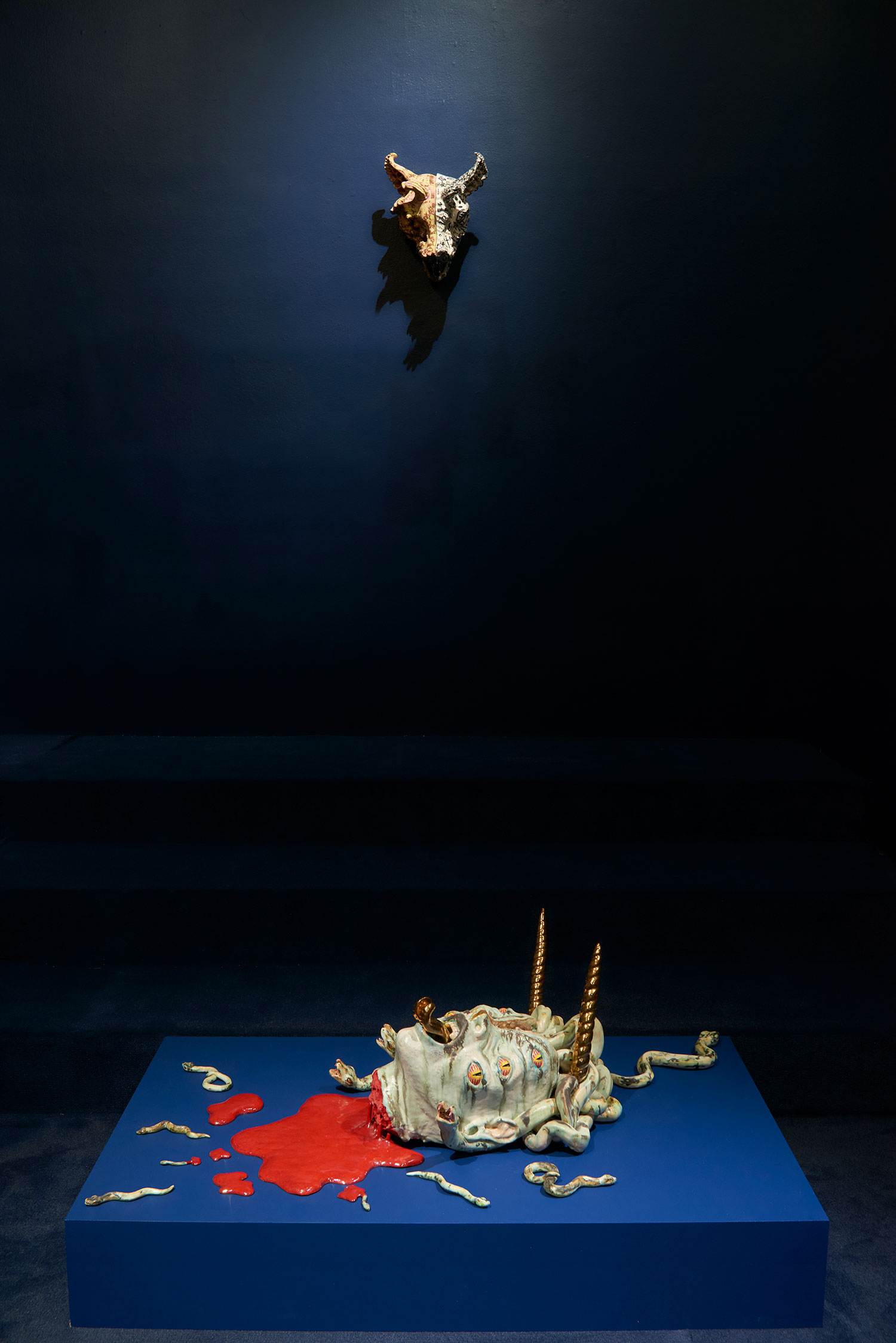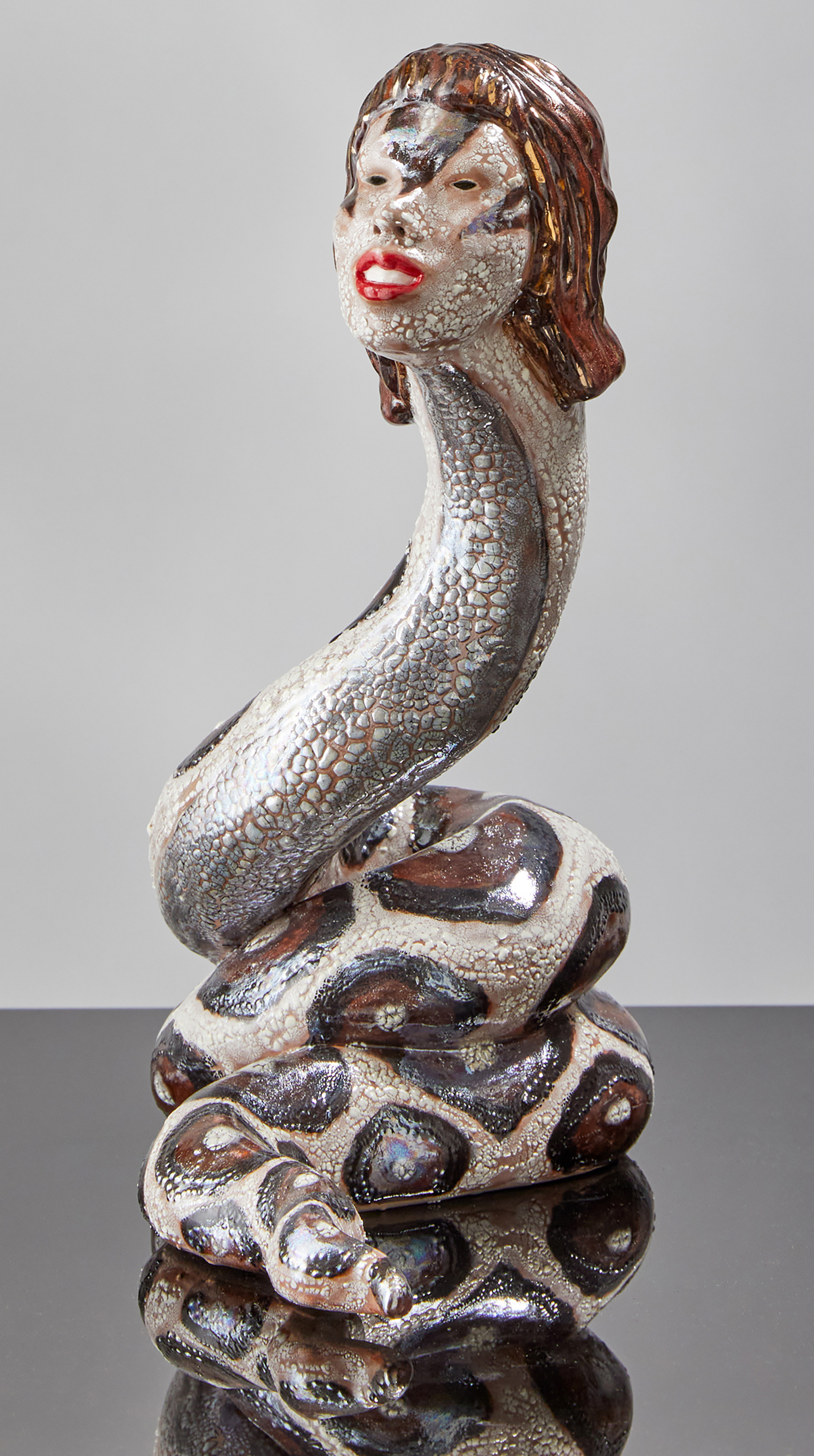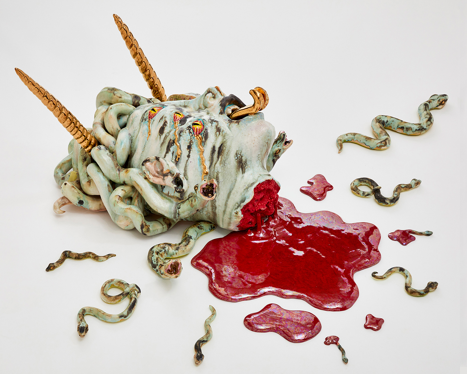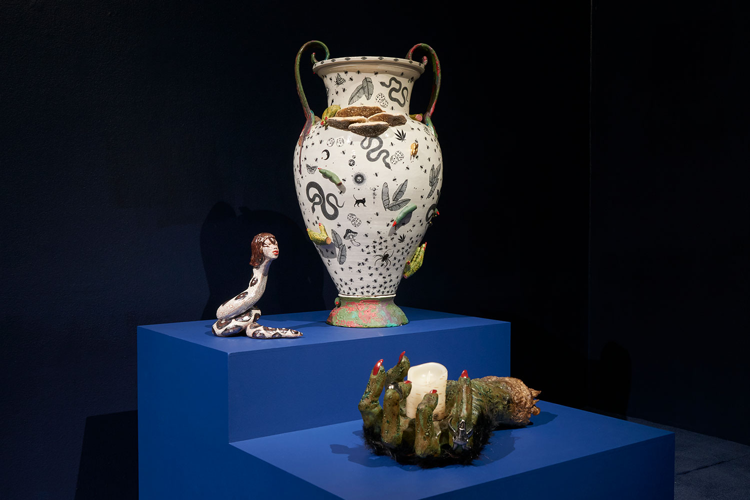 Ceramics is one of the most ancient industries going back thousands of years just as the objects themselves last for thousands of years. Jackson’s command of the medium and the conversation her work has with its long lineage, techniques and uses, parallels the concepts she is highlighting in the exhibition with the ceramic process itself. Transformation and alchemy are inherent in her process, as she starts with malleable material that then hardens and finally becomes impervious with the firing process and the powerful change agent of heat. The way Jackson uses glaze is also unique as she fires each piece between four and nine times, at varying temperatures, to build up the surface. Last, Jackson incorporates ceramics’ long history with storytelling, making the exhibition layered and powerful. Each character or object tells a monstrous tale infused with a sacred narrative. This play is set within the divine side of life, igniting the power of imagination and vision, and commenting on a society hijacked by the abstracting, rationalizing, and controlling ego. Jackson’s work reminds us of the observation of visual artist, author, art critic Suzi Gablick “…without the magical sense of perception, we do not live in a magical world.” These varied mythological creatures of sorcery, destruction and resurrection seem slightly terrifying but commandingly necessary, and ask the audience to hold space with them between worlds, a luscious and complex topography of the spirit.