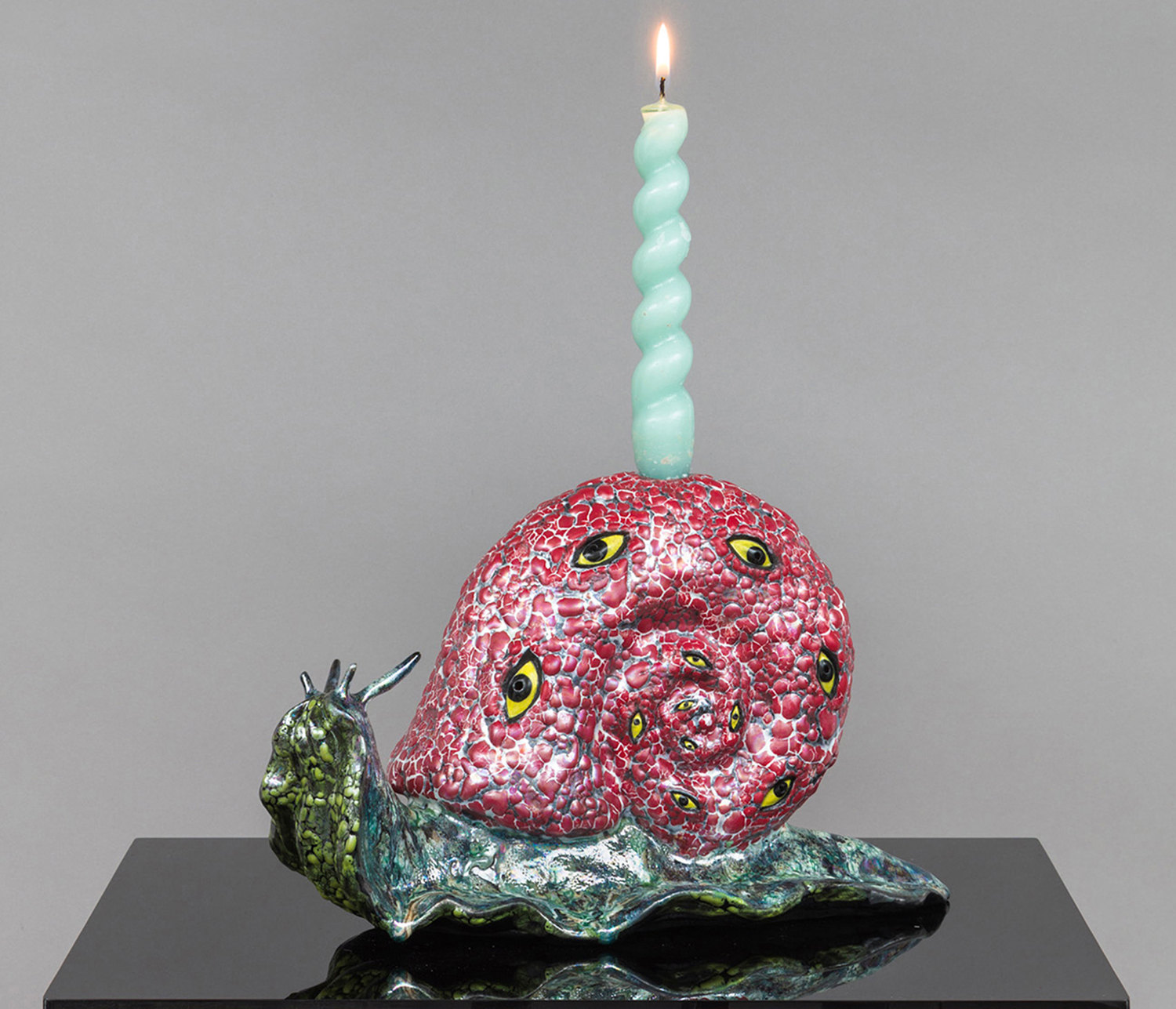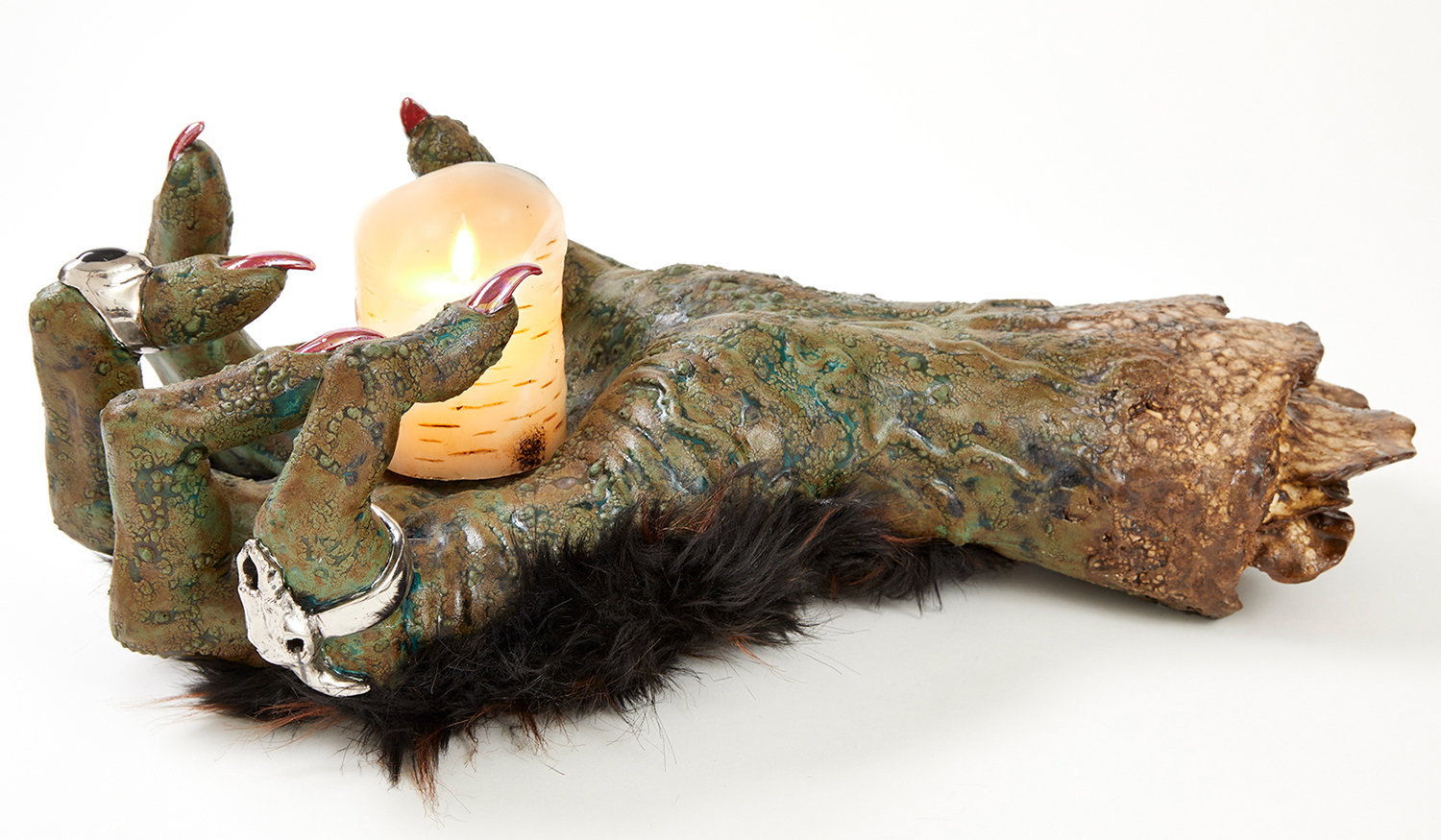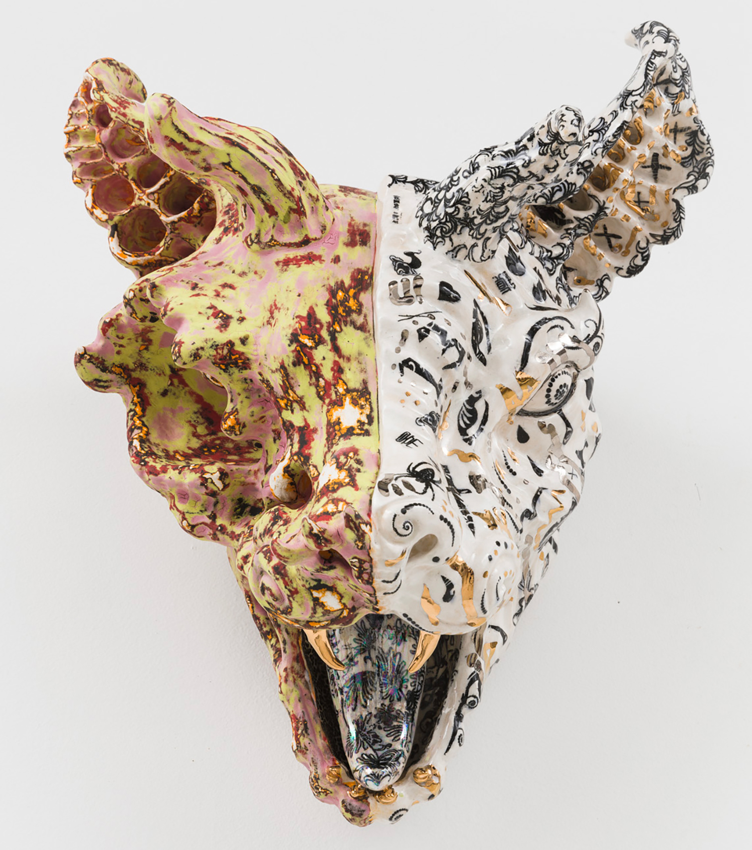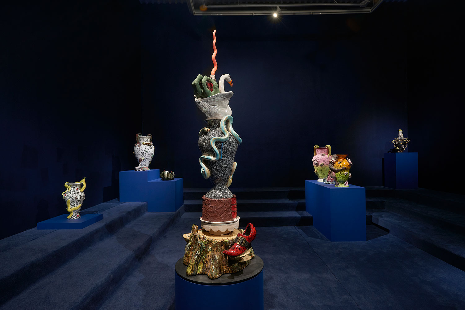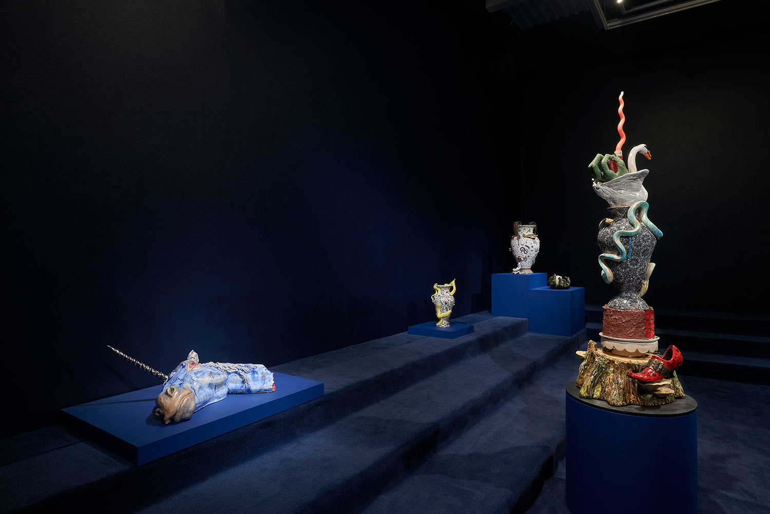 Ceramics is one of the most ancient industries going back thousands of years just as the objects themselves last for thousands of years. Jackson’s command of the medium and the conversation her work has with its long lineage, techniques and uses, parallels the concepts she is highlighting in the exhibition with the ceramic process itself. Transformation and alchemy are inherent in her process, as she starts with malleable material that then hardens and finally becomes impervious with the firing process and the powerful change agent of heat. The way Jackson uses glaze is also unique as she fires each piece between four and nine times, at varying temperatures, to build up the surface. Last, Jackson incorporates ceramics’ long history with storytelling, making the exhibition layered and powerful. Each character or object tells a monstrous tale infused with a sacred narrative. This play is set within the divine side of life, igniting the power of imagination and vision, and commenting on a society hijacked by the abstracting, rationalizing, and controlling ego. Jackson’s work reminds us of the observation of visual artist, author, art critic Suzi Gablick “…without the magical sense of perception, we do not live in a magical world.” These varied mythological creatures of sorcery, destruction and resurrection seem slightly terrifying but commandingly necessary, and ask the audience to hold space with them between worlds, a luscious and complex topography of the spirit.