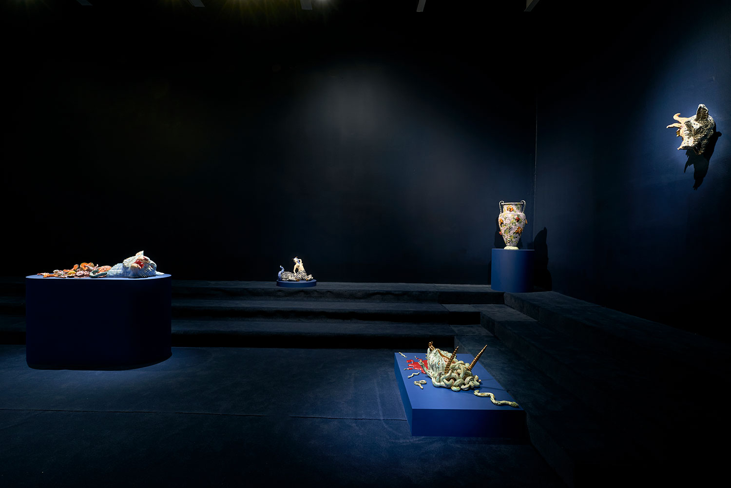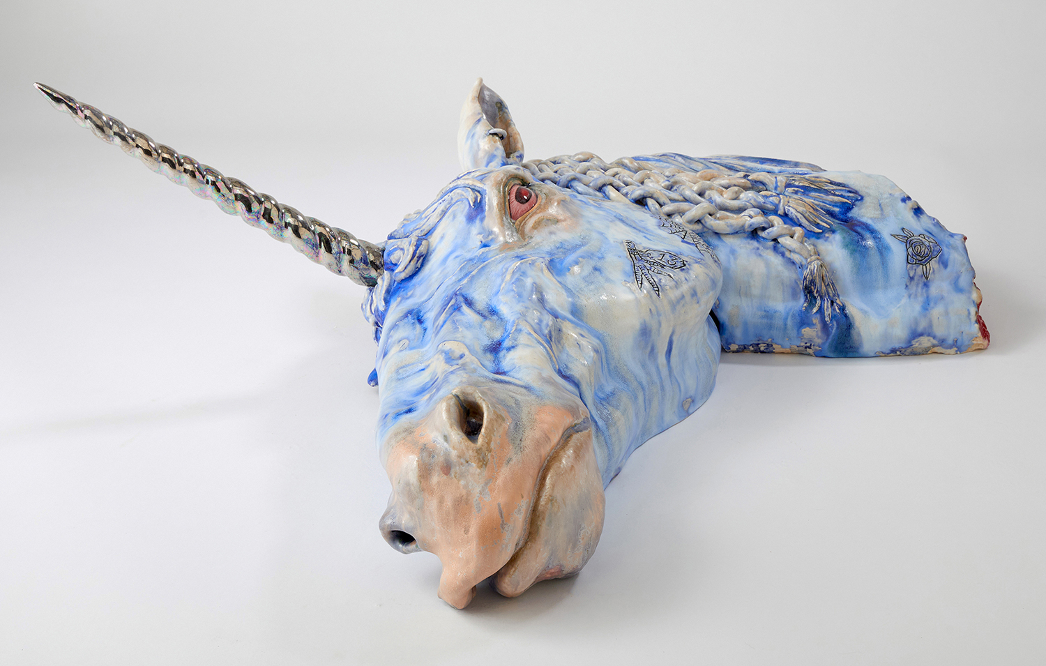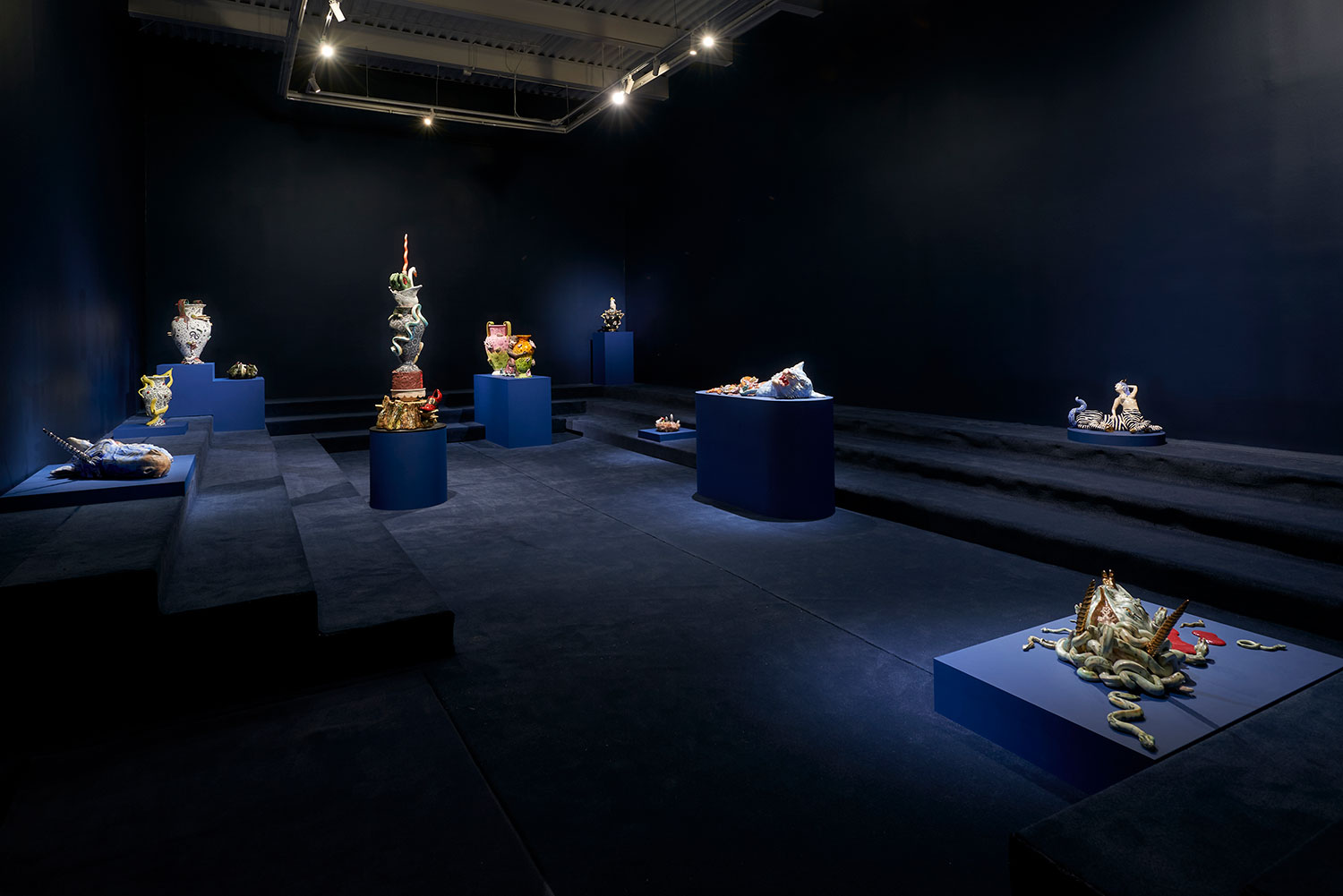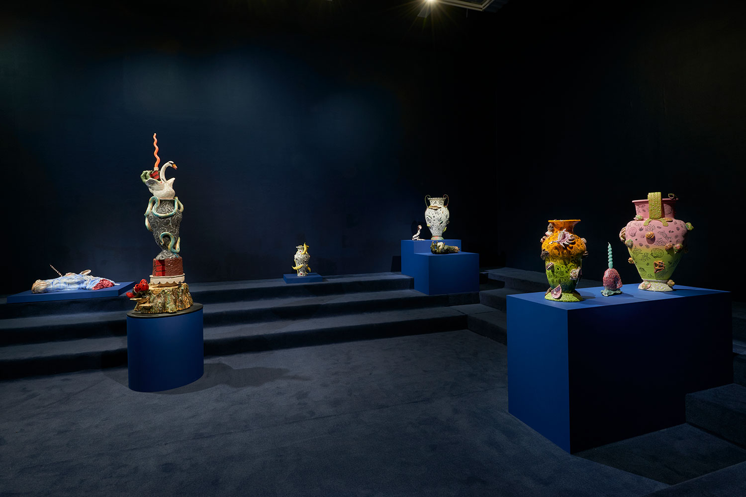 Ceramics is one of the most ancient industries going back thousands of years just as the objects themselves last for thousands of years. Jackson’s command of the medium and the conversation her work has with its long lineage, techniques and uses, parallels the concepts she is highlighting in the exhibition with the ceramic process itself. Transformation and alchemy are inherent in her process, as she starts with malleable material that then hardens and finally becomes impervious with the firing process and the powerful change agent of heat. The way Jackson uses glaze is also unique as she fires each piece between four and nine times, at varying temperatures, to build up the surface. Last, Jackson incorporates ceramics’ long history with storytelling, making the exhibition layered and powerful. Each character or object tells a monstrous tale infused with a sacred narrative. This play is set within the divine side of life, igniting the power of imagination and vision, and commenting on a society hijacked by the abstracting, rationalizing, and controlling ego. Jackson’s work reminds us of the observation of visual artist, author, art critic Suzi Gablick “…without the magical sense of perception, we do not live in a magical world.” These varied mythological creatures of sorcery, destruction and resurrection seem slightly terrifying but commandingly necessary, and ask the audience to hold space with them between worlds, a luscious and complex topography of the spirit.