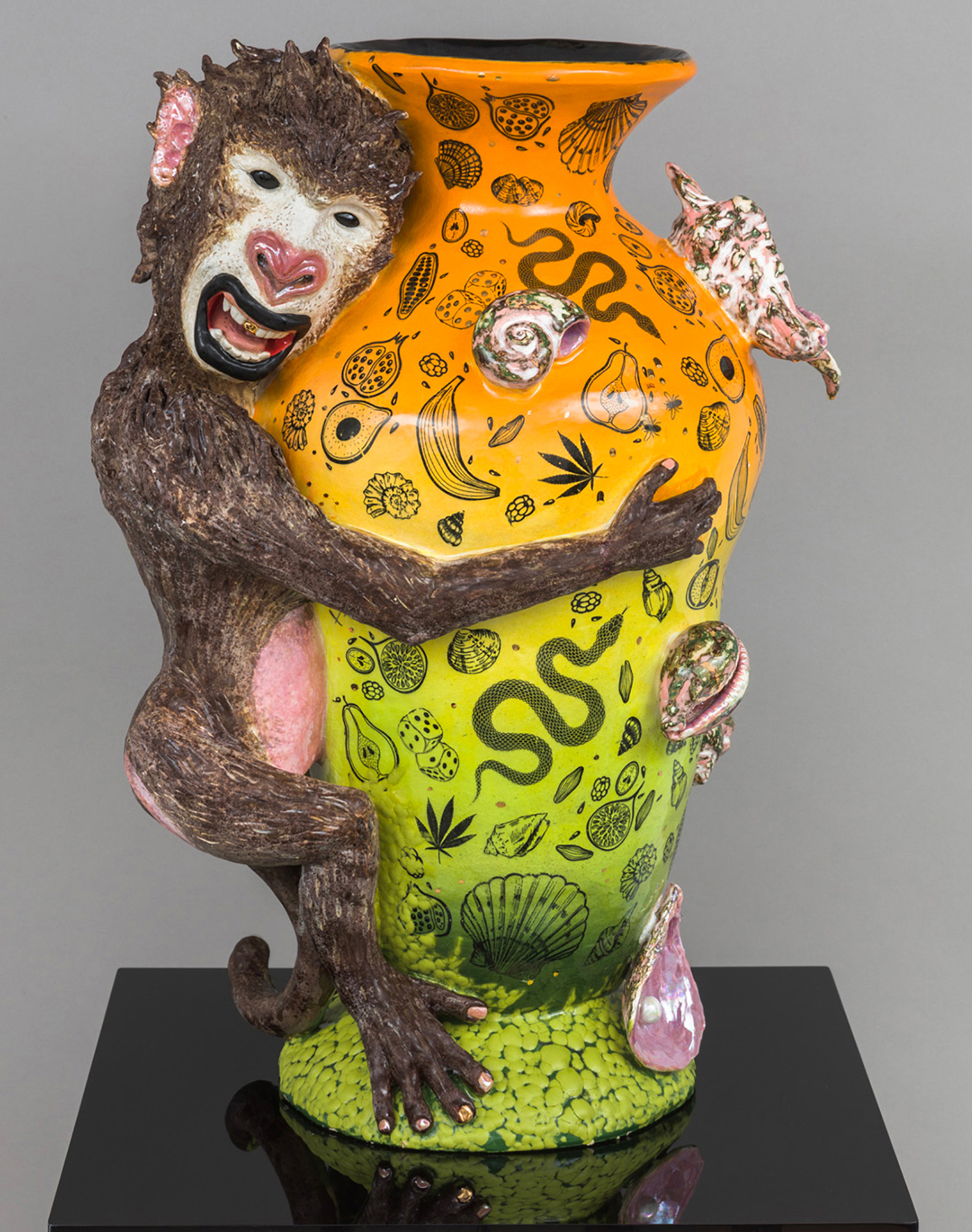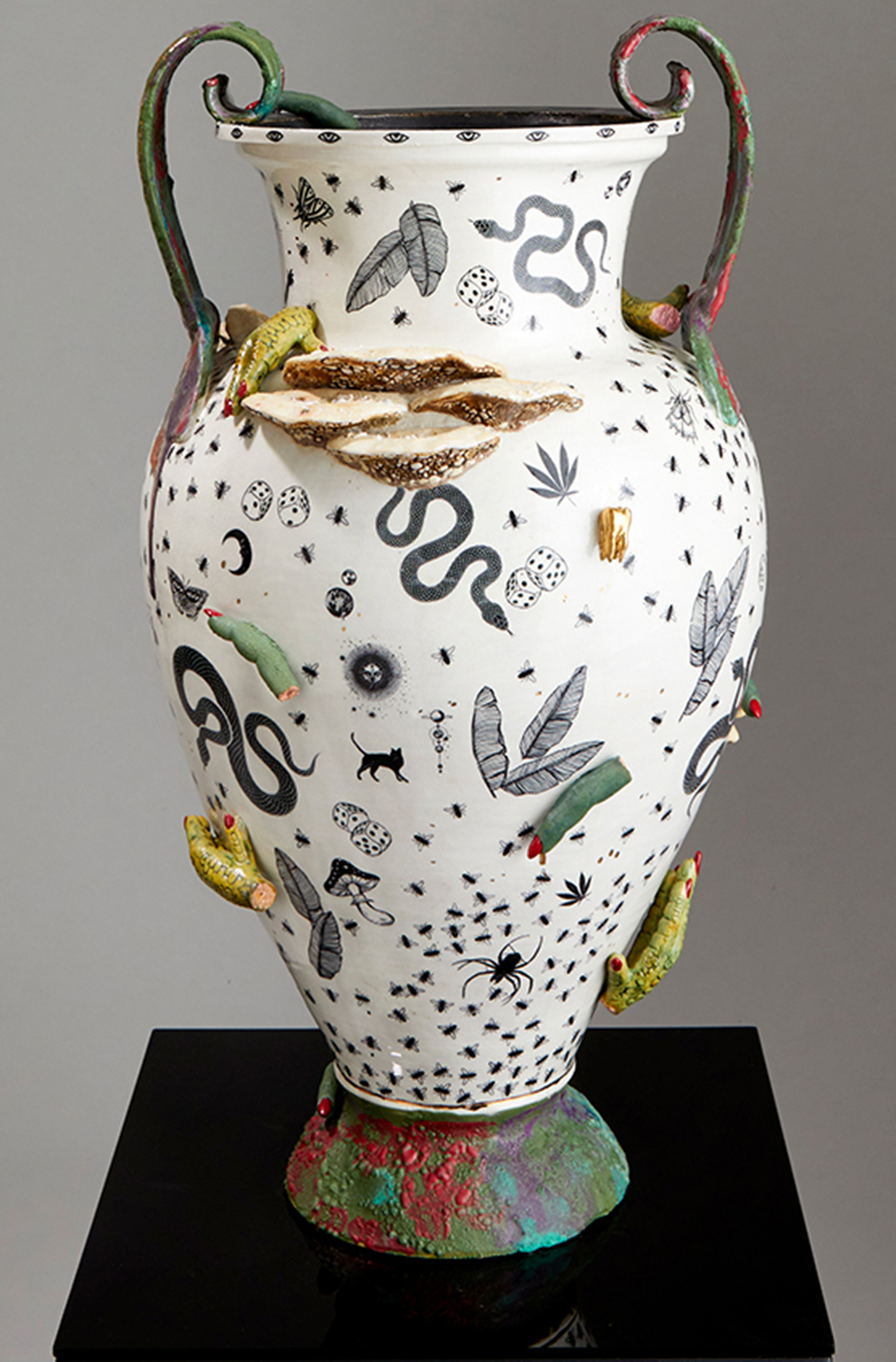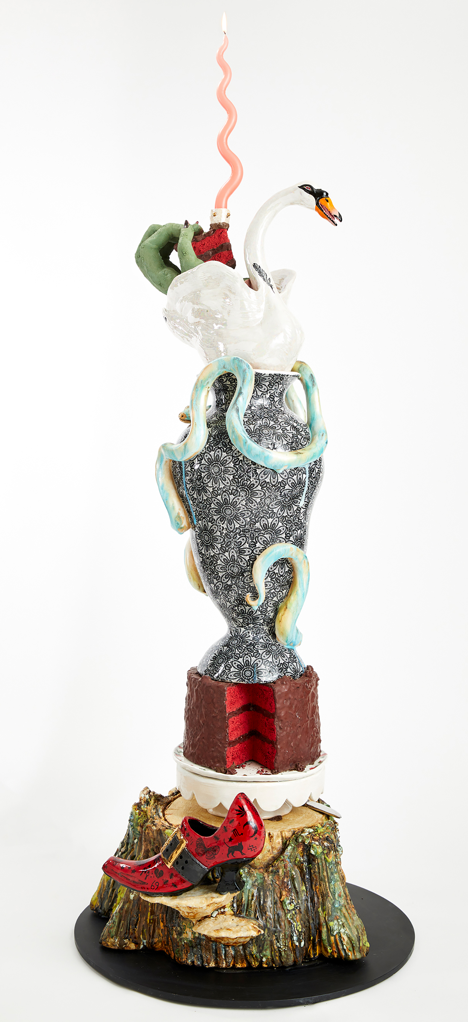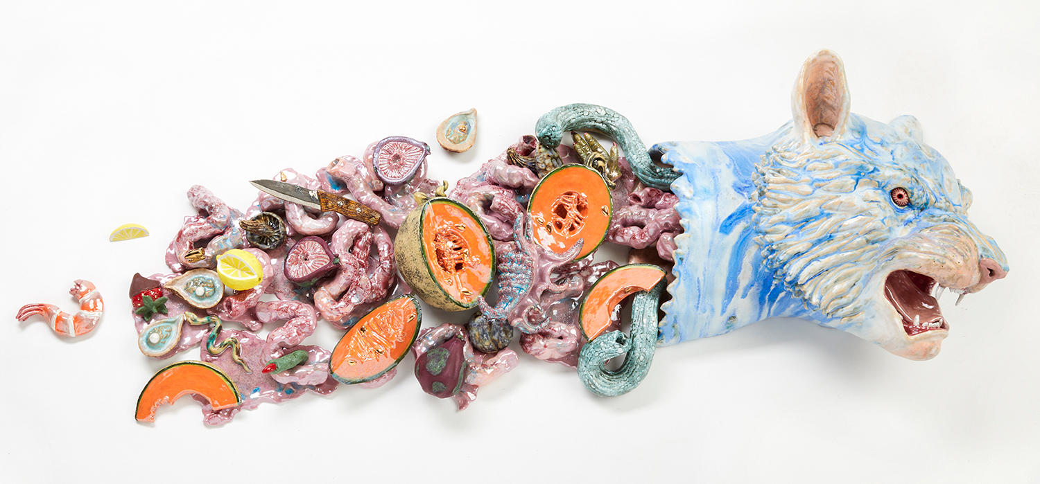 The title prepares us for entry; a pop cultural nod to a lyric from Nirvana’s “In Bloom,” followed by a polite description indicating, in this case, that we will both laugh and weep. Jackson uses the classical form of the stoic amphora vase and applies her contemporary riotous spin, adorning and therefore animating the sculptures with surprises such as ceramic sea shells, chicken feet, and shelf fungus. Her provocative decapitated head sculptures include a medusa, a unicorn and a severed tiger head morphing into a cornucopia. Stand alone characters include a snake lady, a zebra centaur, and new iterations of her signature beastly paws offering tempting, albeit possibly dangerous, treats such as strawberries freshly dipped in chocolate. All of the work brings to mind the powerful words of poet Carmen Giménez Smith in her poem Fragments From the Confessions, “Decoupage the jar with mouths, cut from Cosmo, mister death, fill it with our minstrel blood, or the placenta from our collective lacunae, grow lascivious magnolias in it, heavy lipped and lush with pollen, the jar houses my illusions, of eating men like hairballs.”