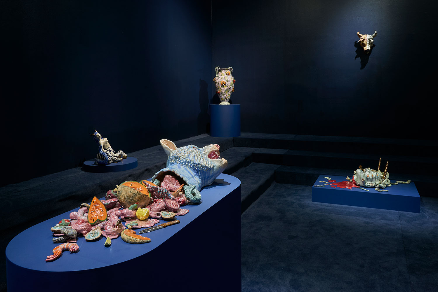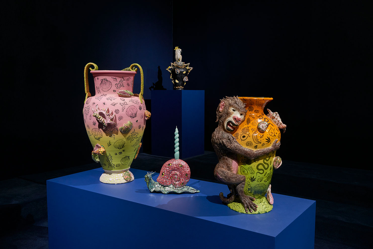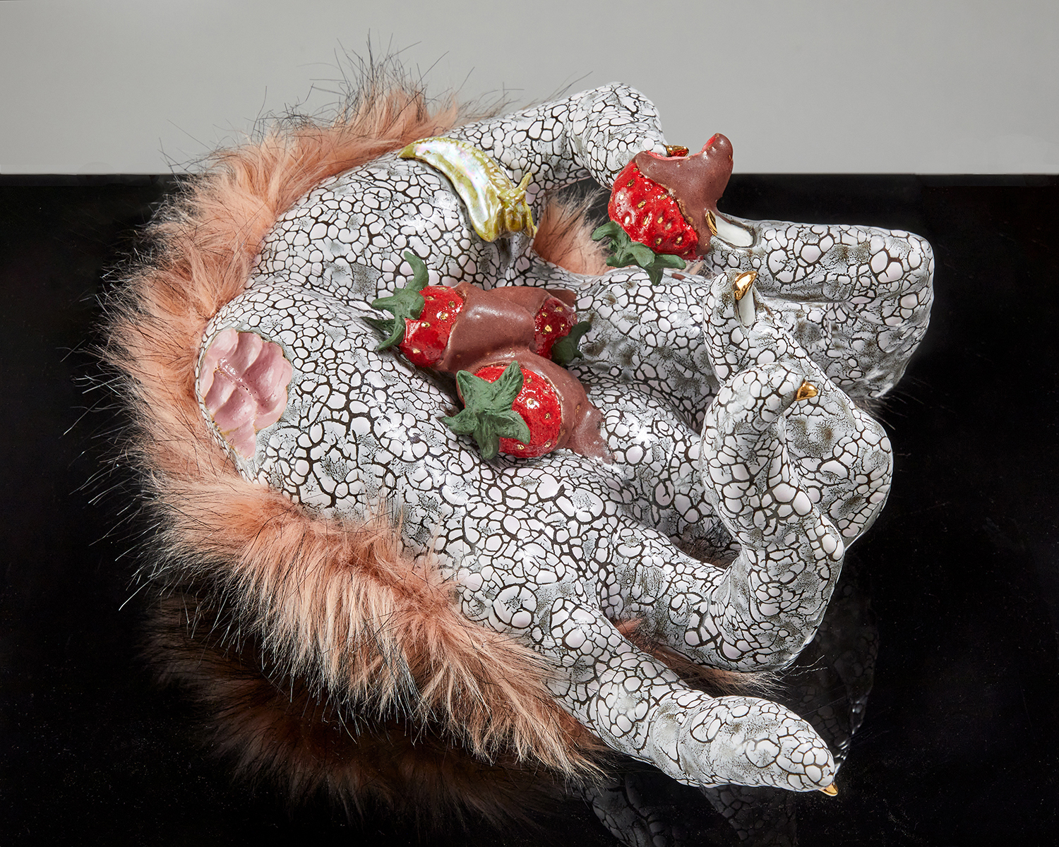 The title prepares us for entry; a pop cultural nod to a lyric from Nirvana’s “In Bloom,” followed by a polite description indicating, in this case, that we will both laugh and weep. Jackson uses the classical form of the stoic amphora vase and applies her contemporary riotous spin, adorning and therefore animating the sculptures with surprises such as ceramic sea shells, chicken feet, and shelf fungus. Her provocative decapitated head sculptures include a medusa, a unicorn and a severed tiger head morphing into a cornucopia. Stand alone characters include a snake lady, a zebra centaur, and new iterations of her signature beastly paws offering tempting, albeit possibly dangerous, treats such as strawberries freshly dipped in chocolate. All of the work brings to mind the powerful words of poet Carmen Giménez Smith in her poem Fragments From the Confessions, “Decoupage the jar with mouths, cut from Cosmo, mister death, fill it with our minstrel blood, or the placenta from our collective lacunae, grow lascivious magnolias in it, heavy lipped and lush with pollen, the jar houses my illusions, of eating men like hairballs.”