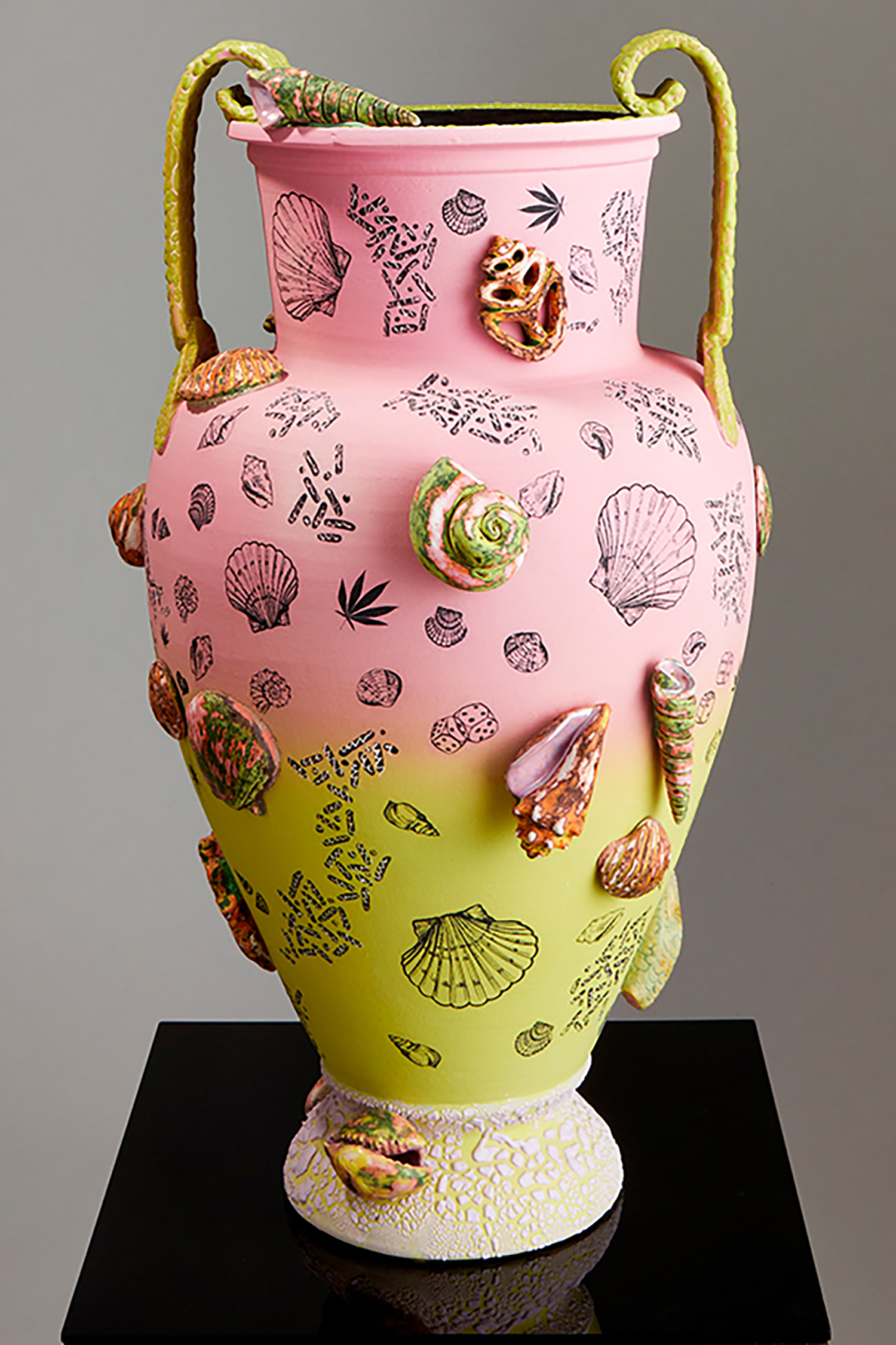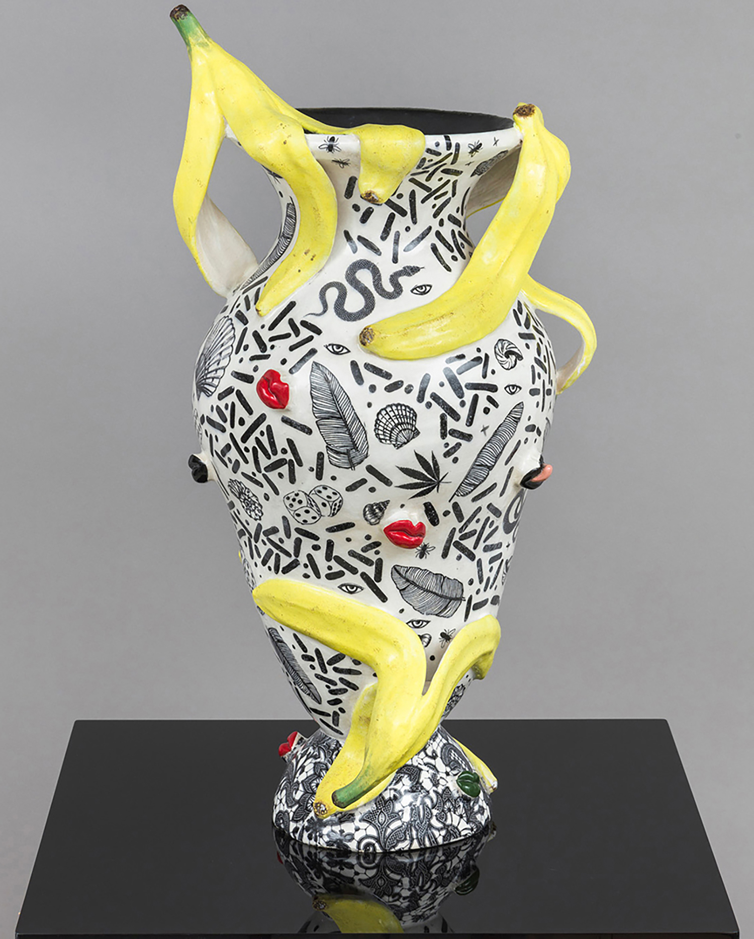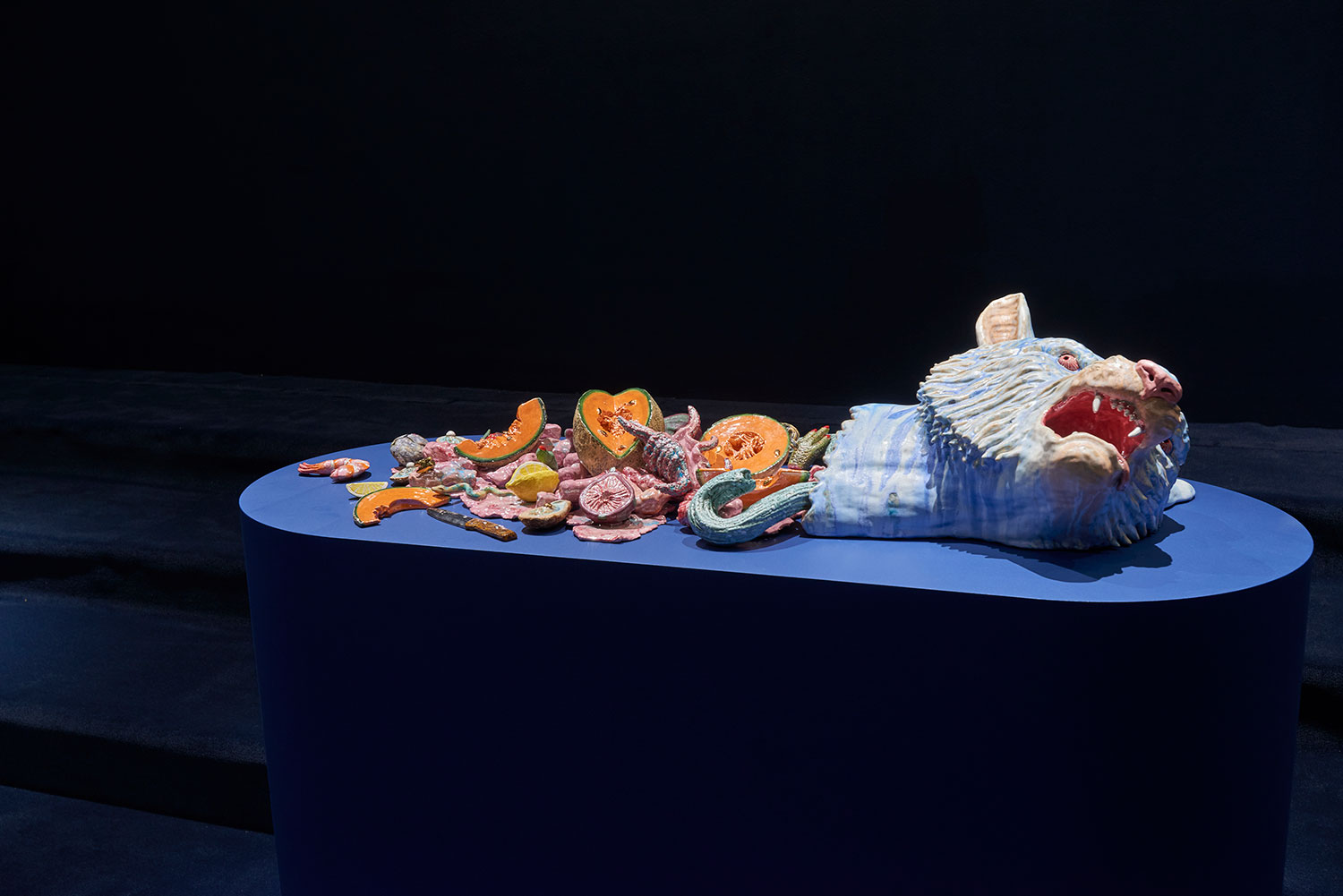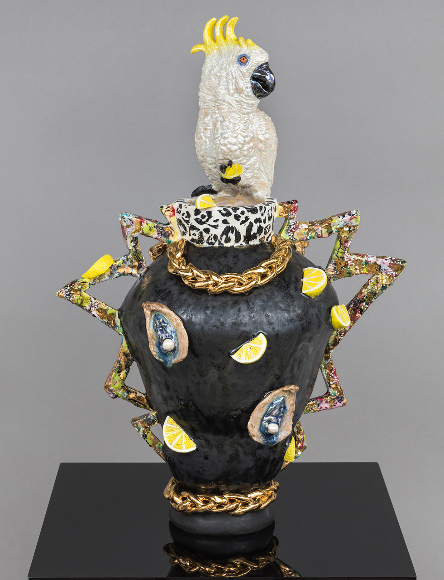 The title prepares us for entry; a pop cultural nod to a lyric from Nirvana’s “In Bloom,” followed by a polite description indicating, in this case, that we will both laugh and weep. Jackson uses the classical form of the stoic amphora vase and applies her contemporary riotous spin, adorning and therefore animating the sculptures with surprises such as ceramic sea shells, chicken feet, and shelf fungus. Her provocative decapitated head sculptures include a medusa, a unicorn and a severed tiger head morphing into a cornucopia. Stand alone characters include a snake lady, a zebra centaur, and new iterations of her signature beastly paws offering tempting, albeit possibly dangerous, treats such as strawberries freshly dipped in chocolate. All of the work brings to mind the powerful words of poet Carmen Giménez Smith in her poem Fragments From the Confessions, “Decoupage the jar with mouths, cut from Cosmo, mister death, fill it with our minstrel blood, or the placenta from our collective lacunae, grow lascivious magnolias in it, heavy lipped and lush with pollen, the jar houses my illusions, of eating men like hairballs.”