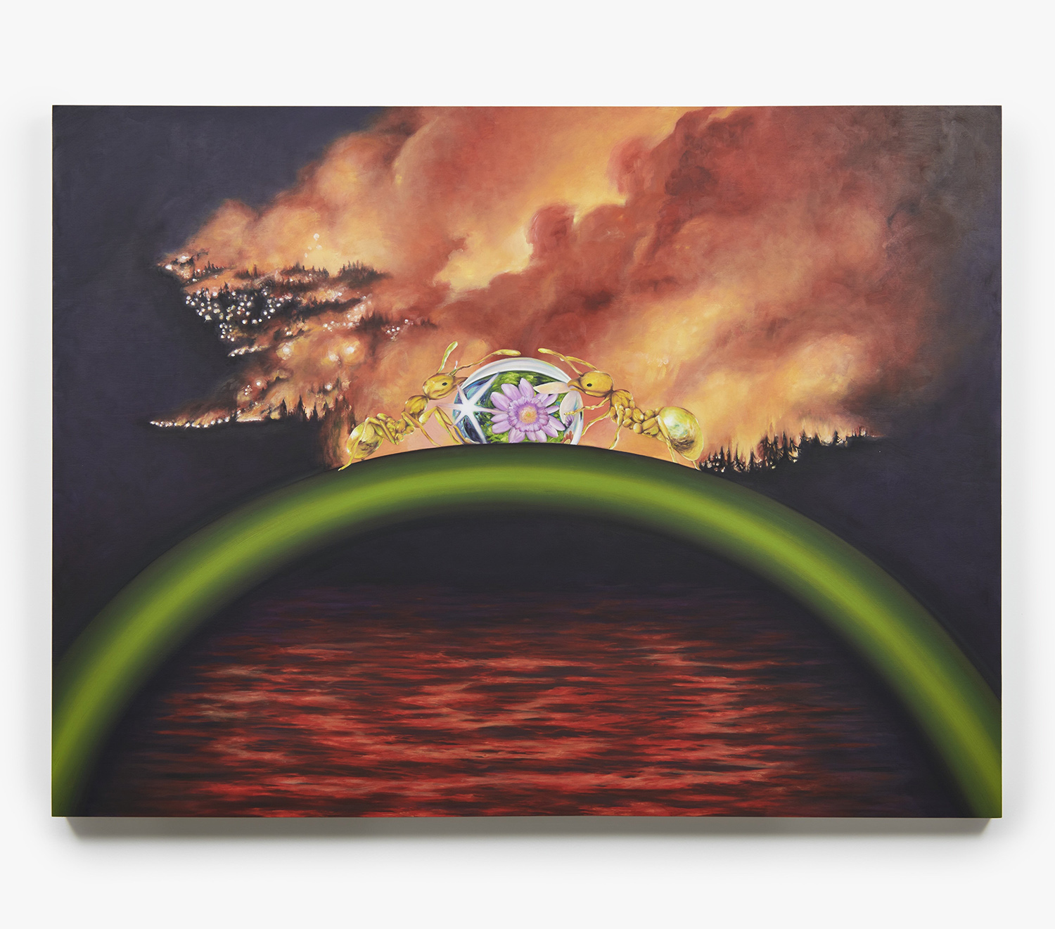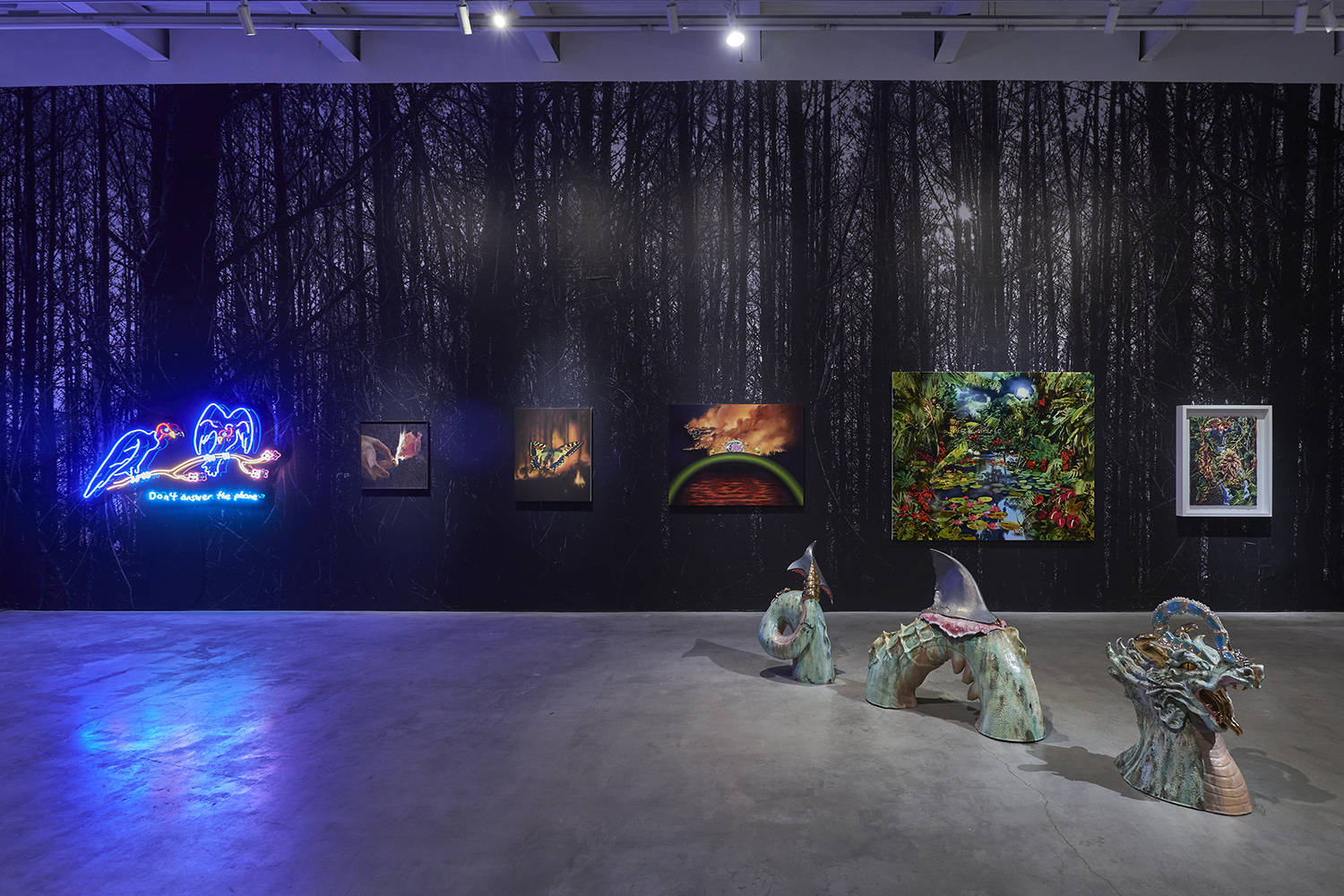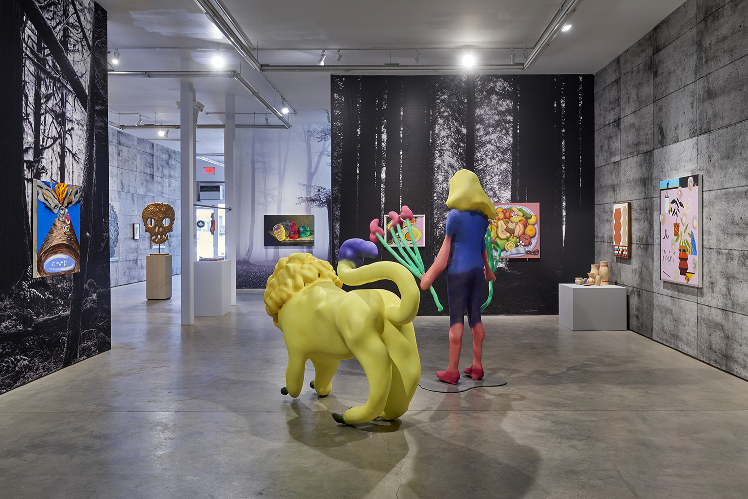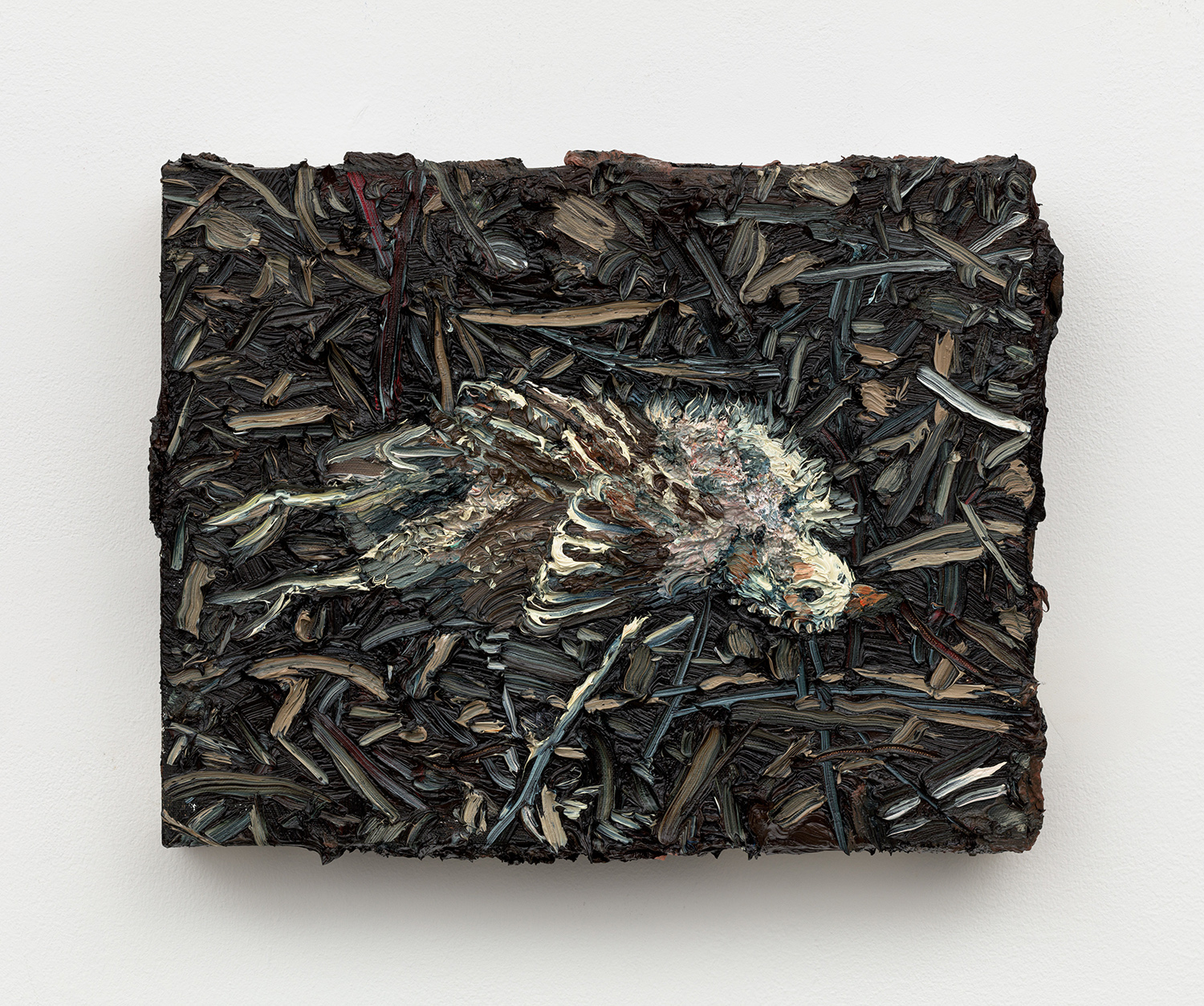 Responding to the climate crisis in disparate ways, the artists in Nature Morte depict disease, death and dark nature—the animals are taxidermied and the fruits inedible. From a delicate dead sparrow by Allison Schulnik to a gigantic bronze CGI lion by Austin Lee; a forest fire by Aaron Elvis Jupin to a highway overpass by Adam de Boer; even the lively-looking works have a whiff of death to them, like Rosson Crow’s vibrant jungle laced with tar pits.