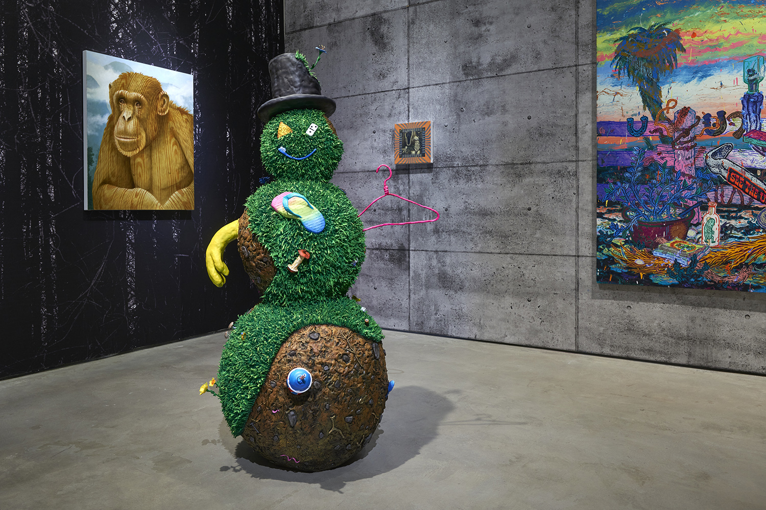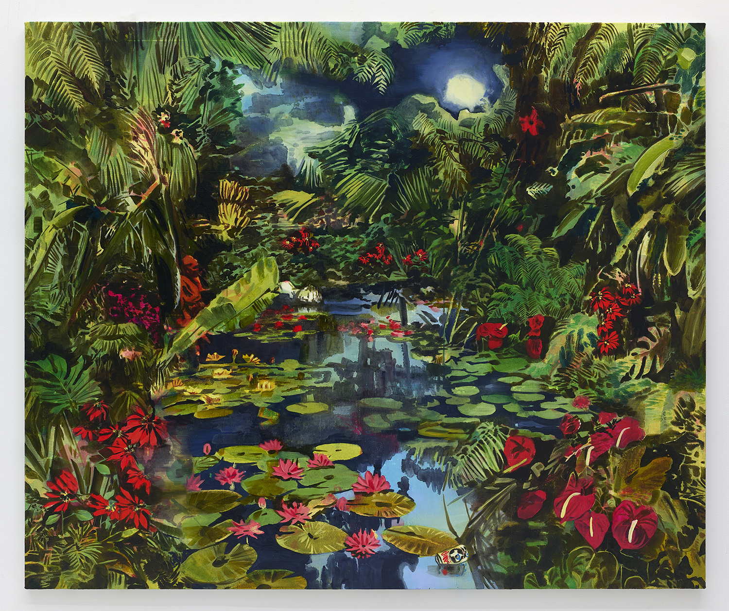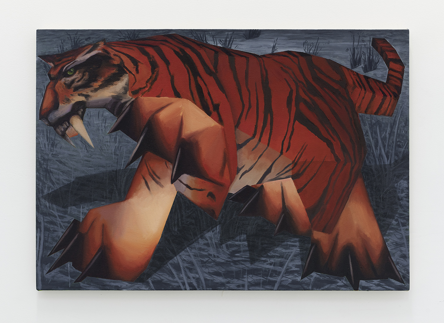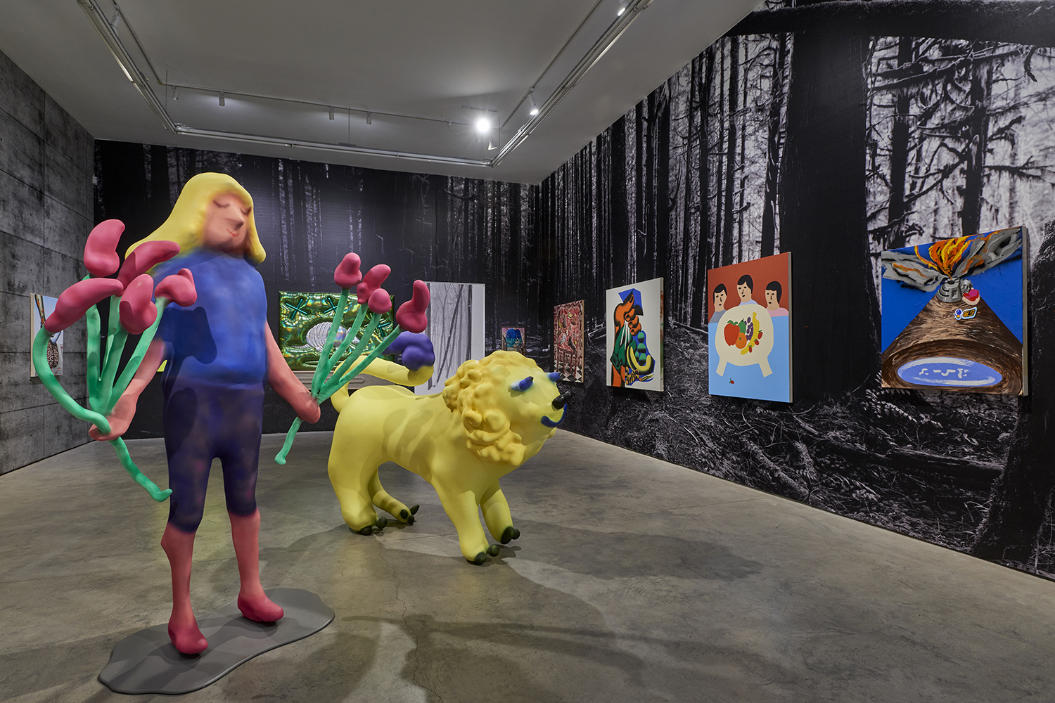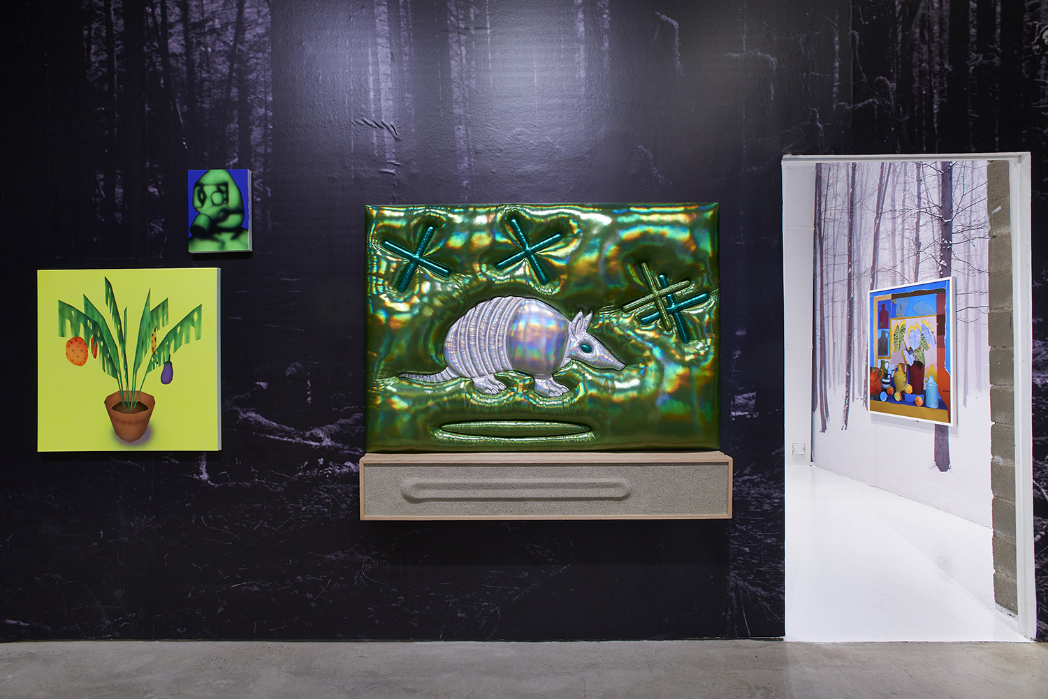 Responding to the climate crisis in disparate ways, the artists in Nature Morte depict disease, death and dark nature—the animals are taxidermied and the fruits inedible. From a delicate dead sparrow by Allison Schulnik to a gigantic bronze CGI lion by Austin Lee; a forest fire by Aaron Elvis Jupin to a highway overpass by Adam de Boer; even the lively-looking works have a whiff of death to them, like Rosson Crow’s vibrant jungle laced with tar pits.