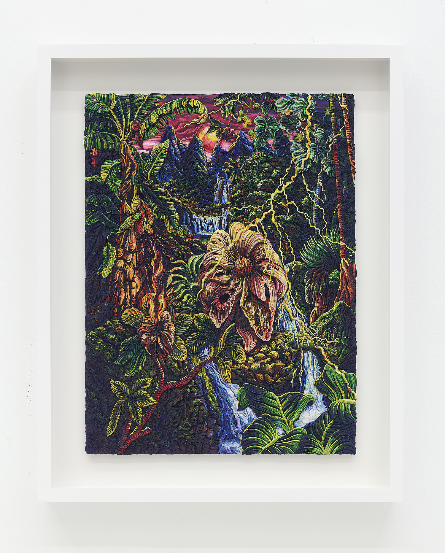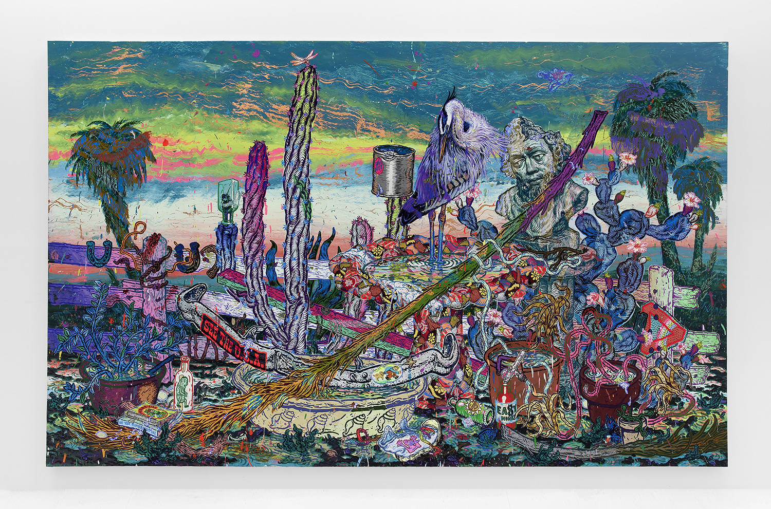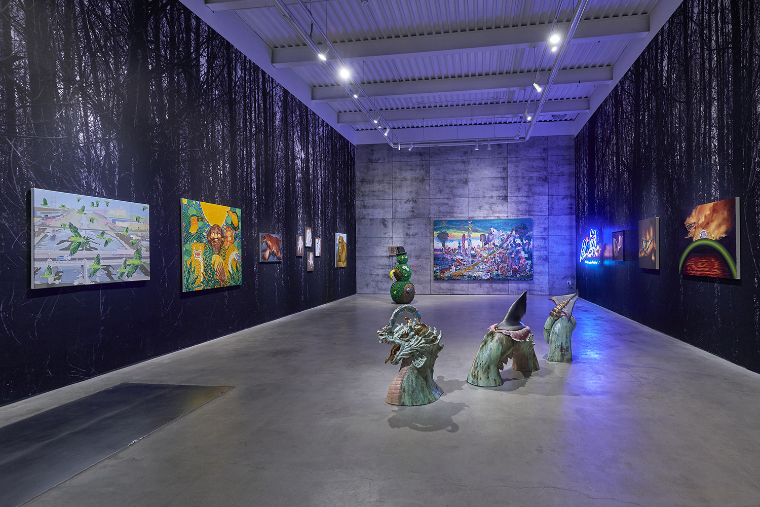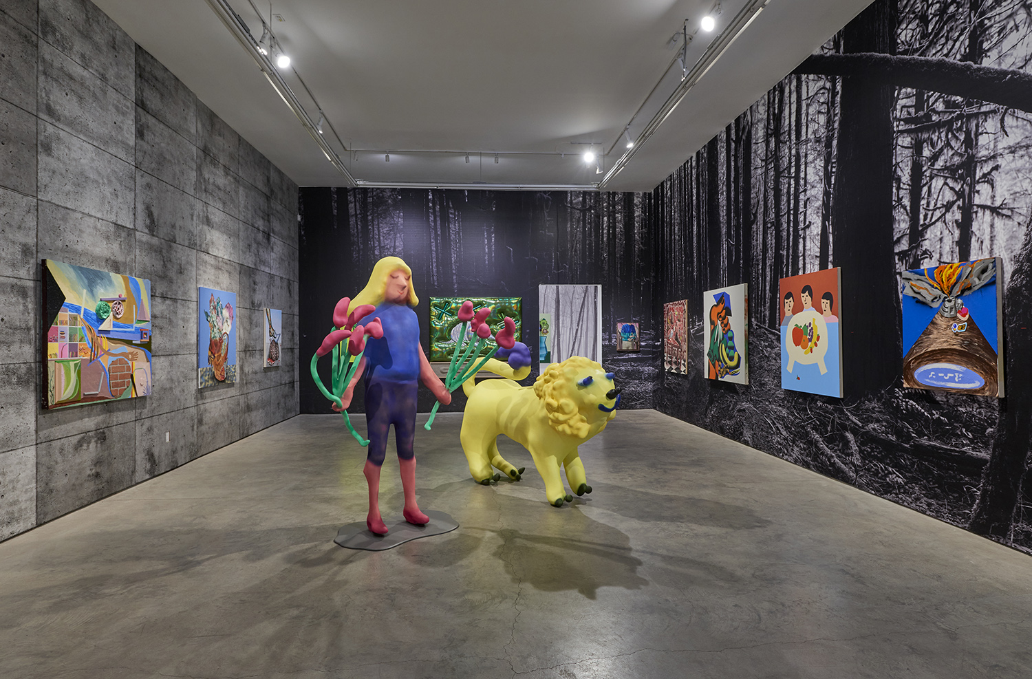 Responding to the climate crisis in disparate ways, the artists in Nature Morte depict disease, death and dark nature—the animals are taxidermied and the fruits inedible. From a delicate dead sparrow by Allison Schulnik to a gigantic bronze CGI lion by Austin Lee; a forest fire by Aaron Elvis Jupin to a highway overpass by Adam de Boer; even the lively-looking works have a whiff of death to them, like Rosson Crow’s vibrant jungle laced with tar pits.