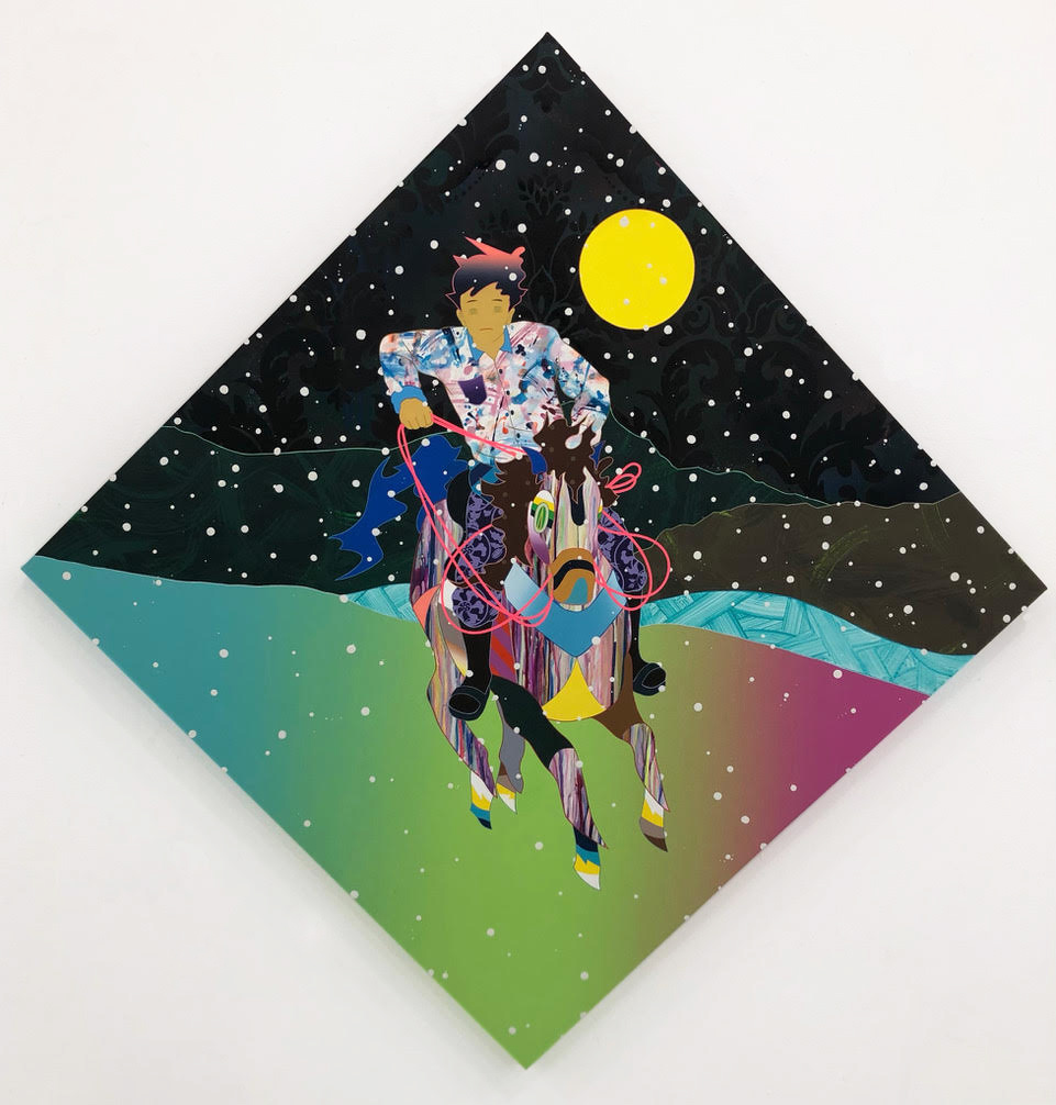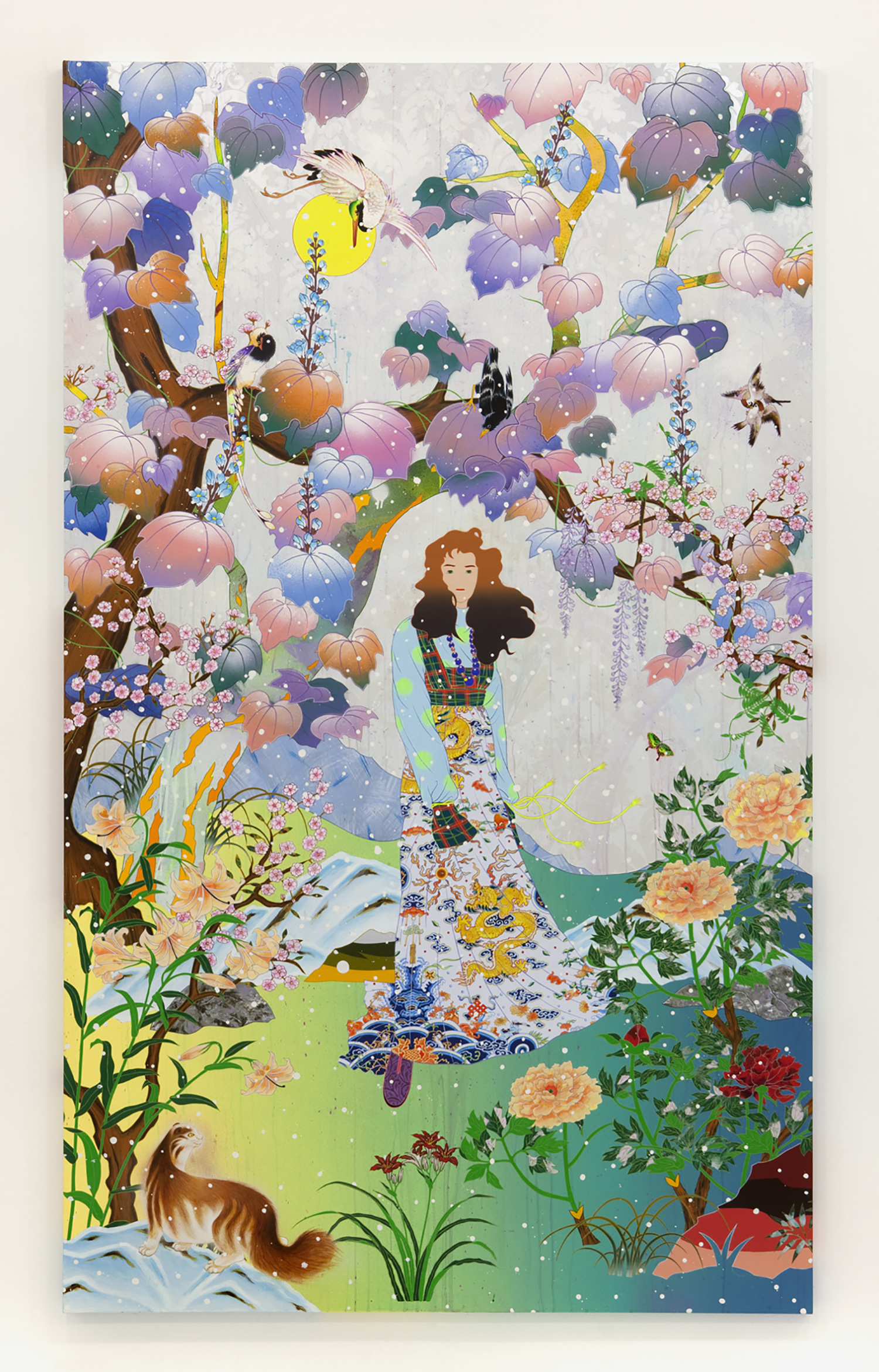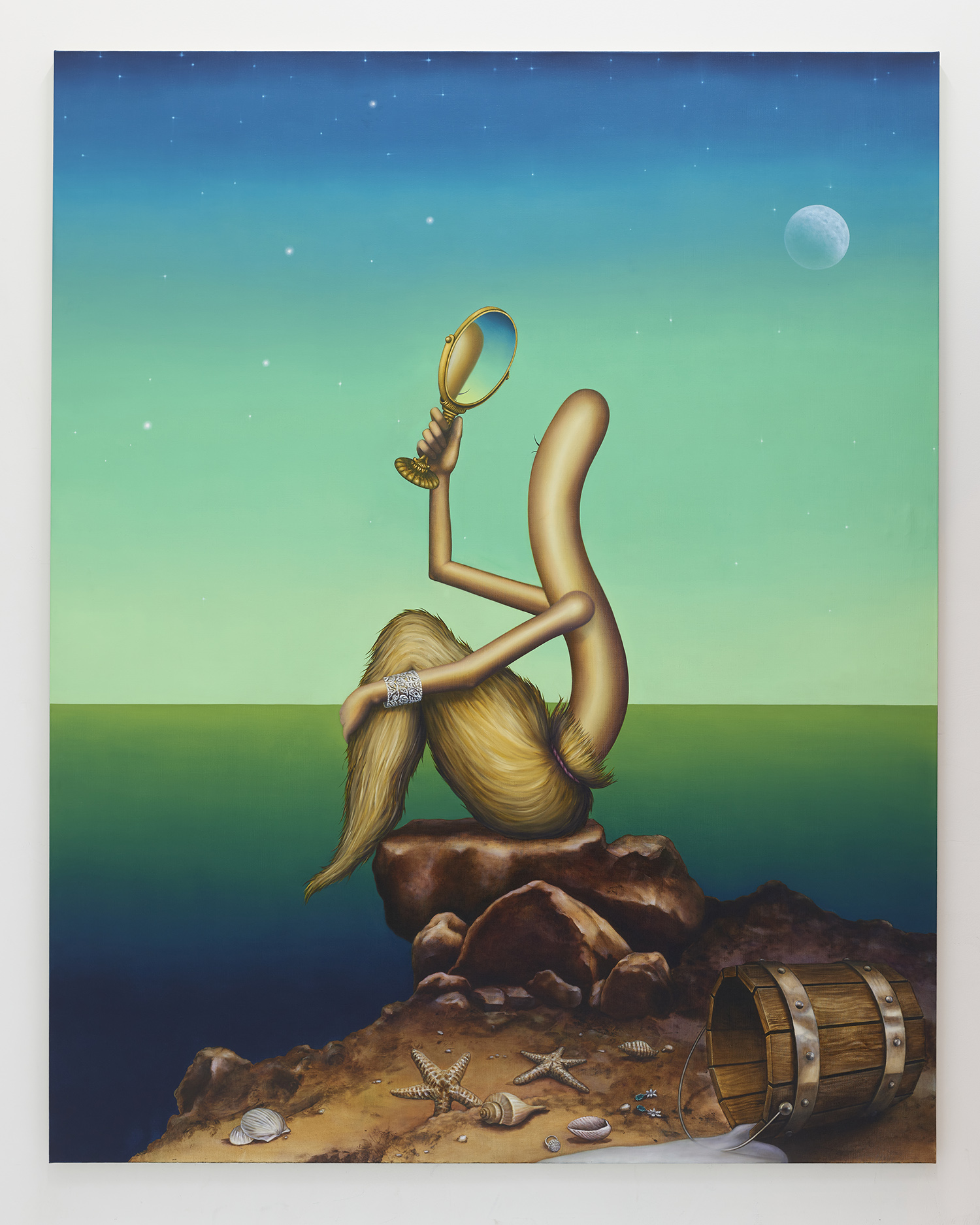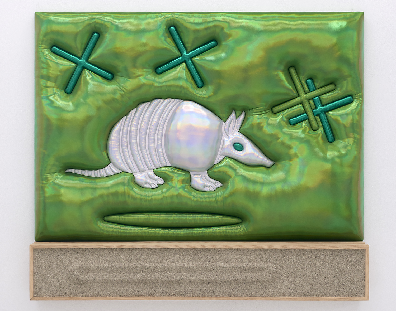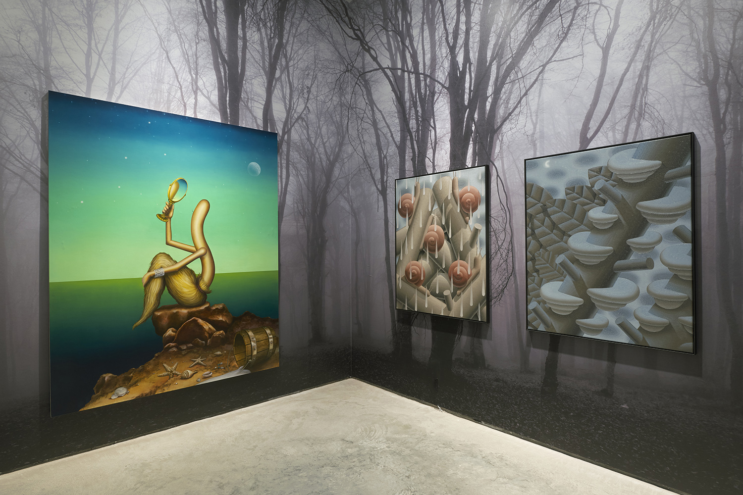 Responding to the climate crisis in disparate ways, the artists in Nature Morte depict disease, death and dark nature—the animals are taxidermied and the fruits inedible. From a delicate dead sparrow by Allison Schulnik to a gigantic bronze CGI lion by Austin Lee; a forest fire by Aaron Elvis Jupin to a highway overpass by Adam de Boer; even the lively-looking works have a whiff of death to them, like Rosson Crow’s vibrant jungle laced with tar pits.