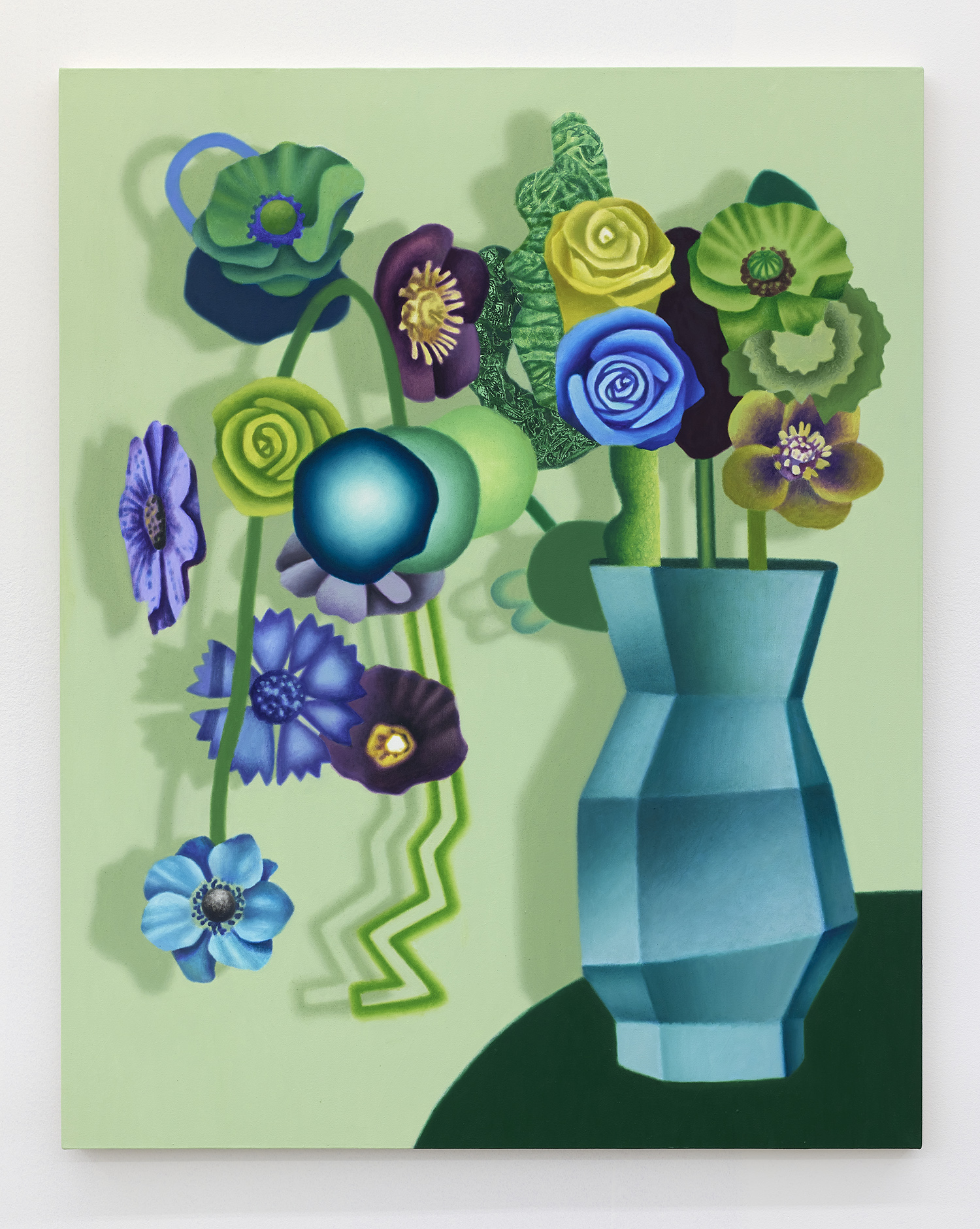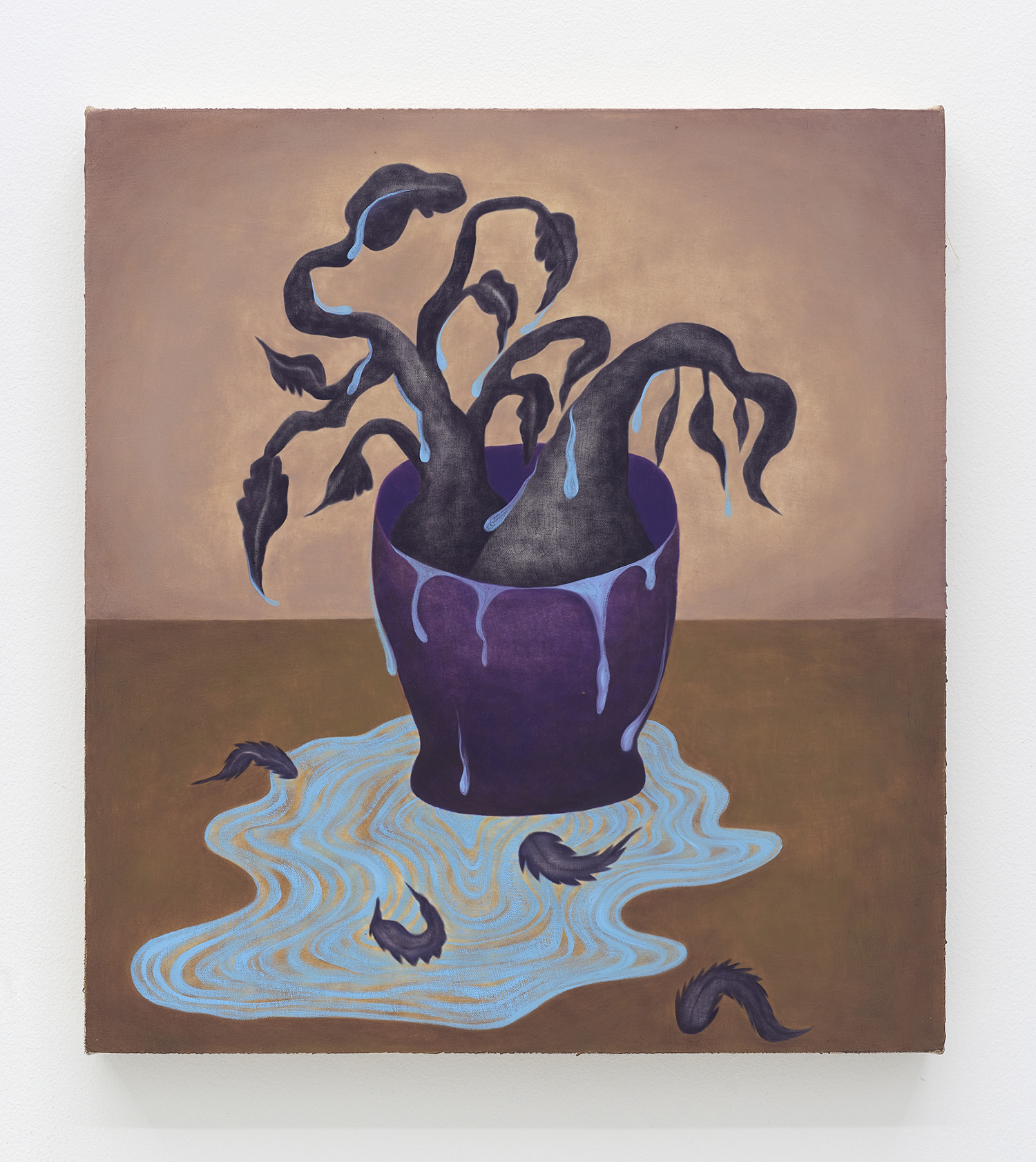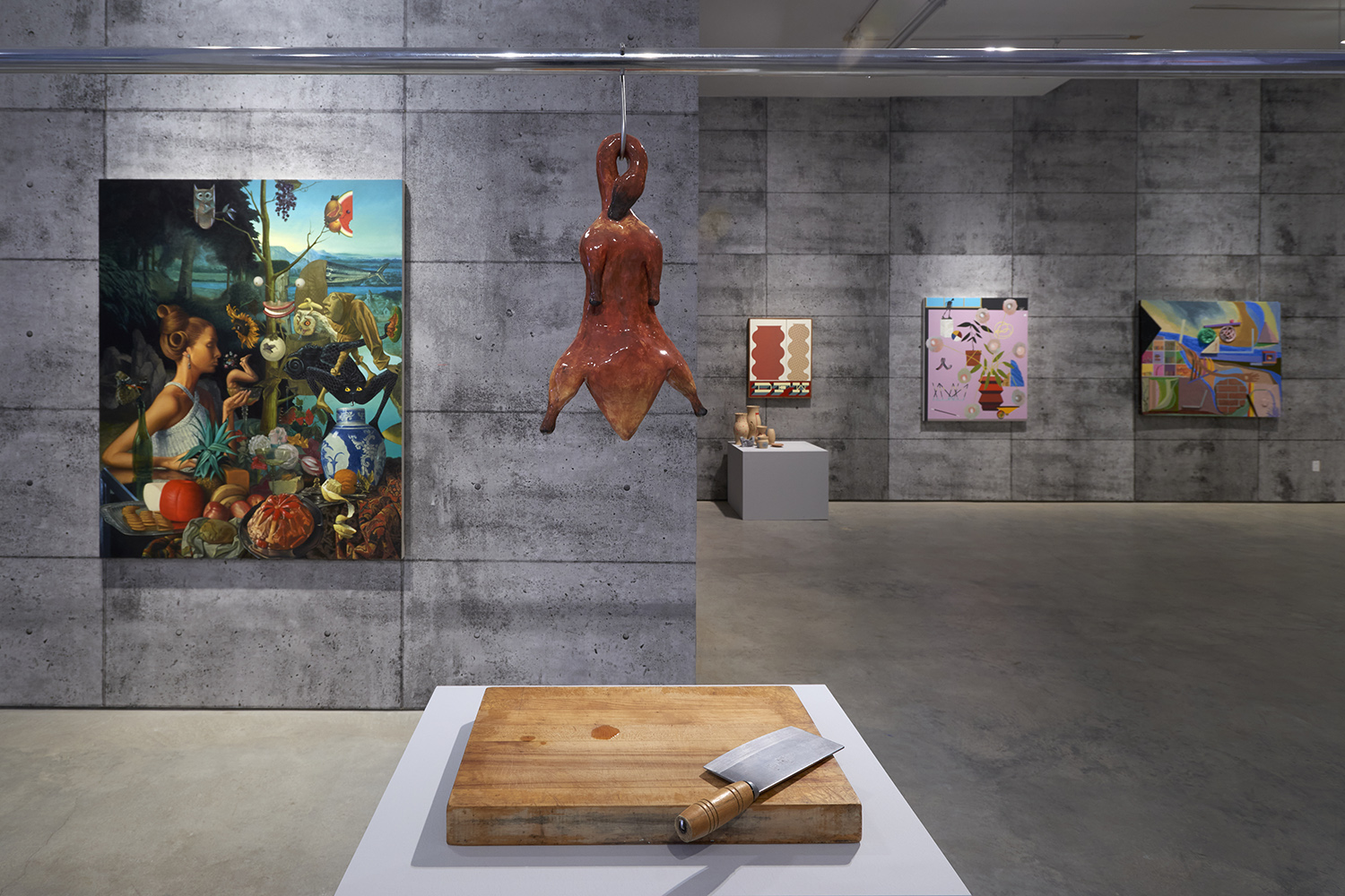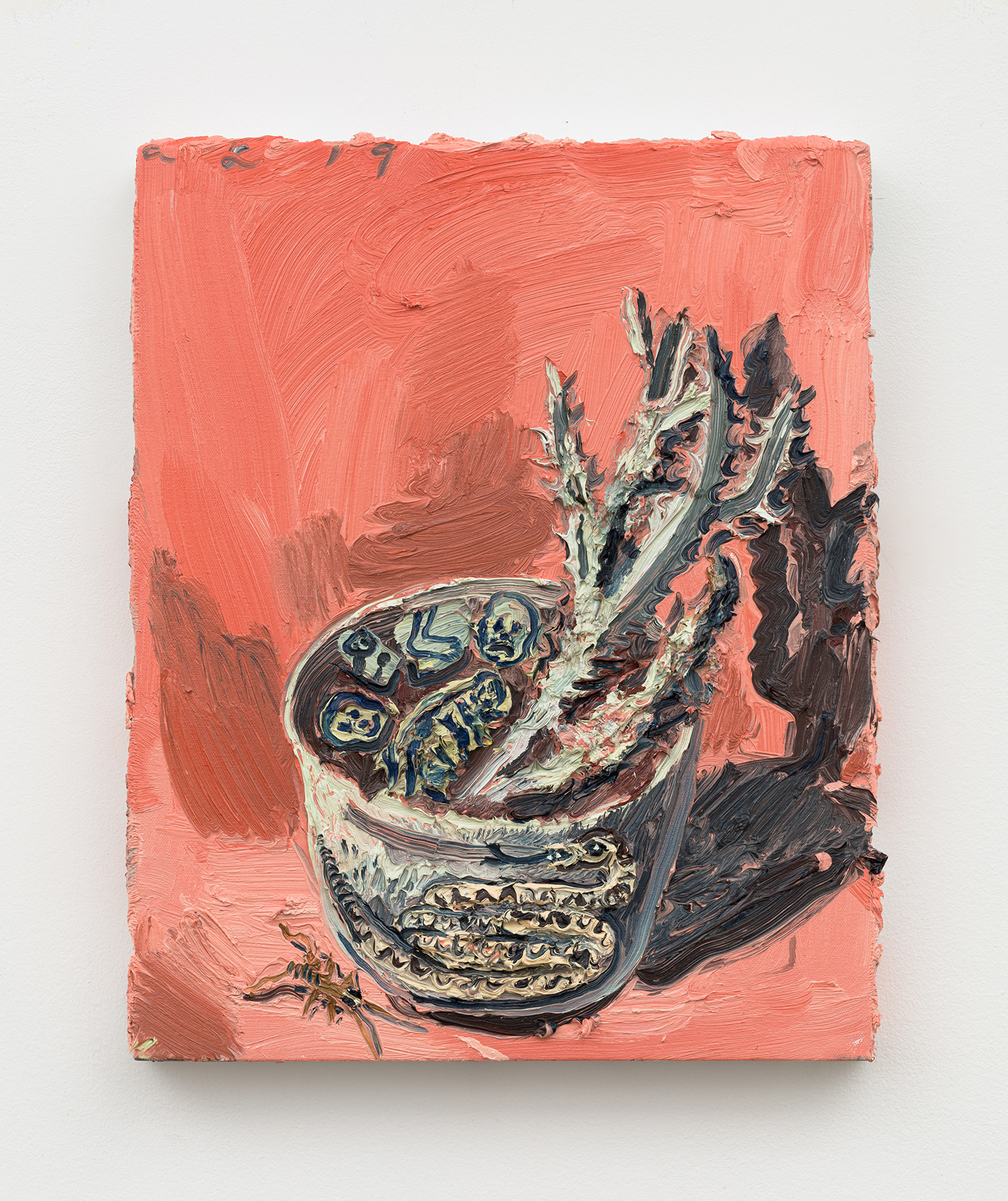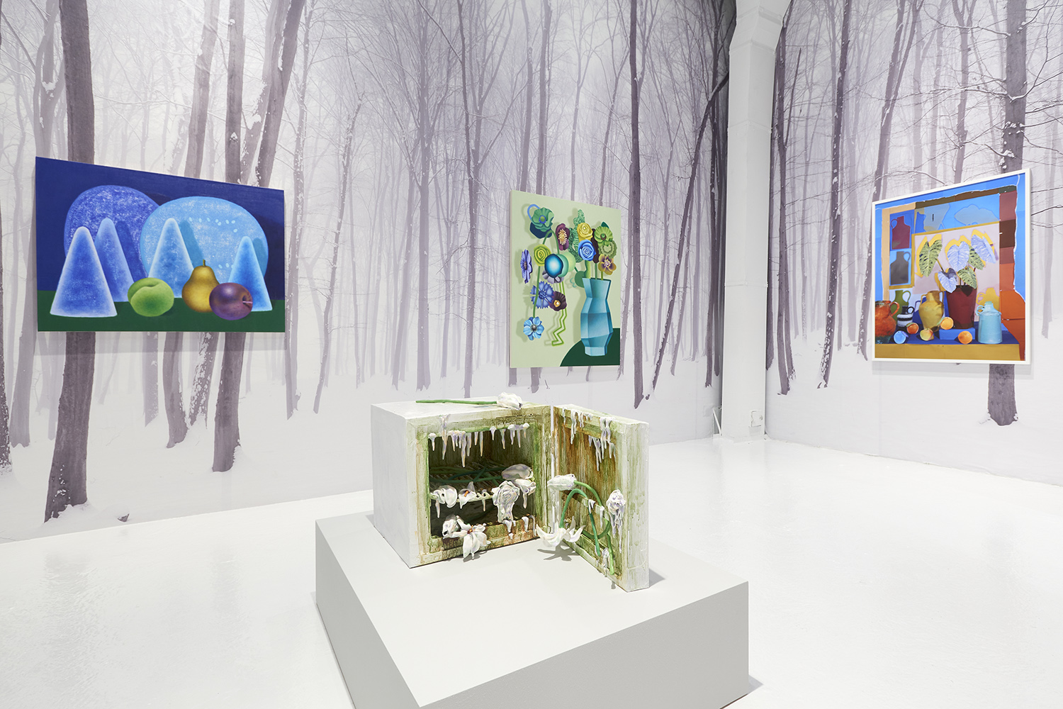 Mainly comprising still life works, the exhibition chooses the French appellation for the pictorial genre to foreground literal “dead nature”, tracing themes of the global environmental crisis with subject matter ranging from turgid bouquets (Ivan Seal) and Holbein-inspired skulls (Robert Lazzarini) to a roasted duck on a hook (Stephanie H. Shih) and a melting garbage snowman (Theo A. Rosenblum and Chelsea Seltzer).