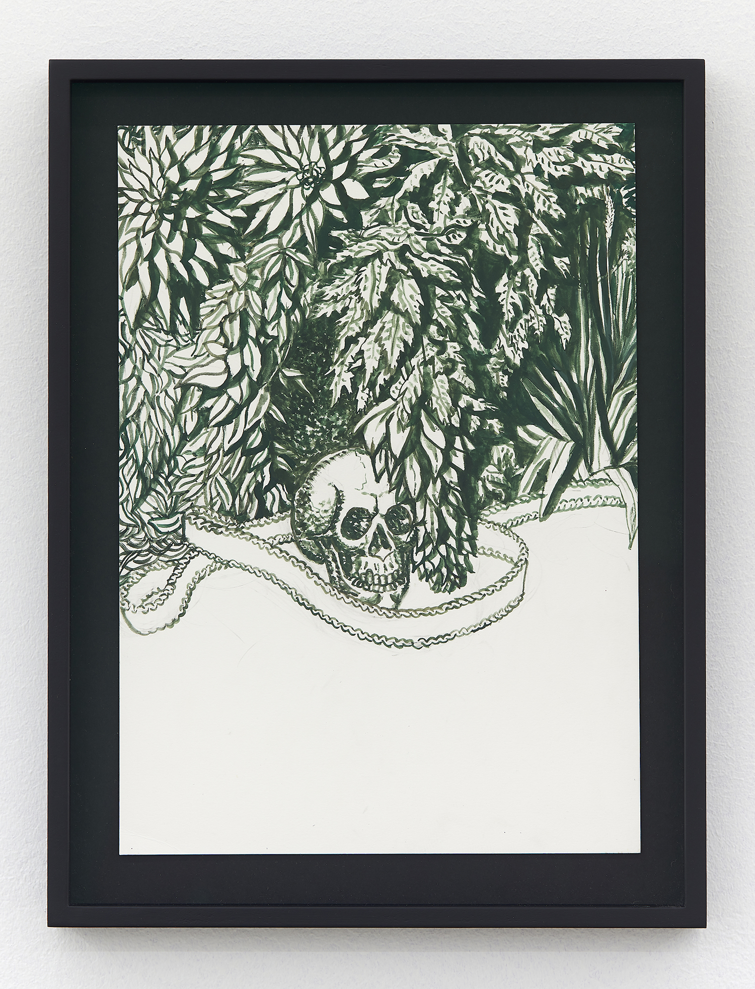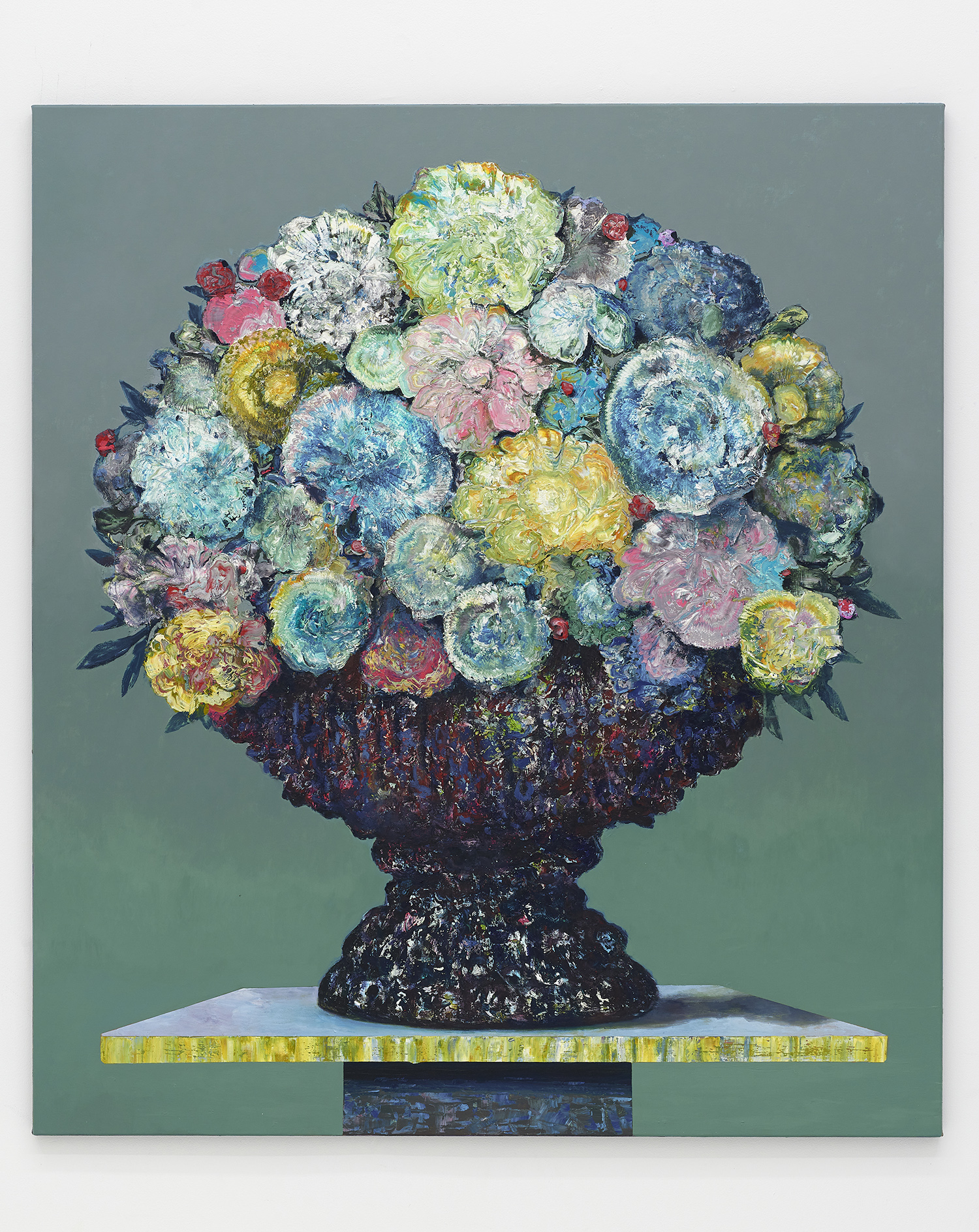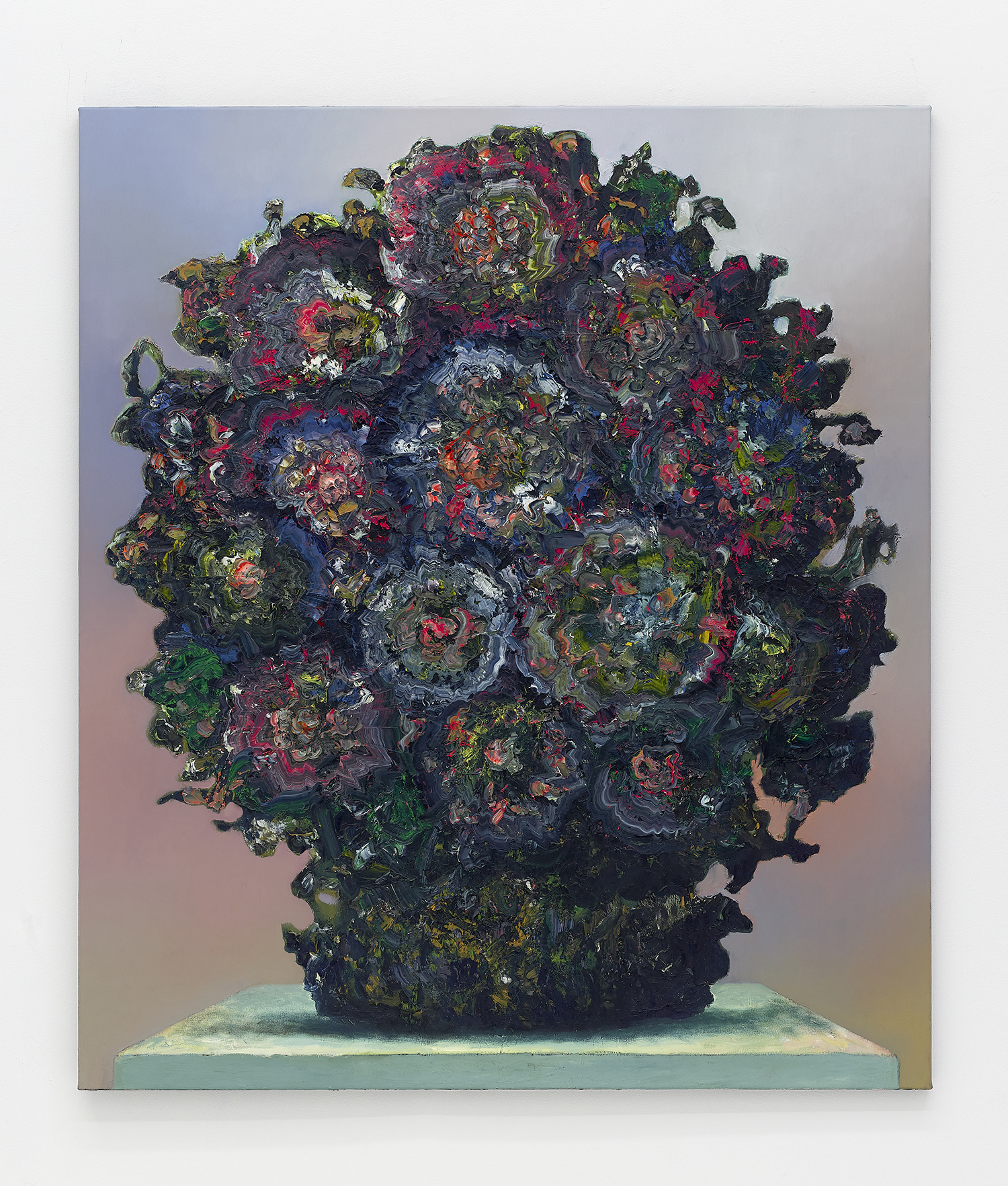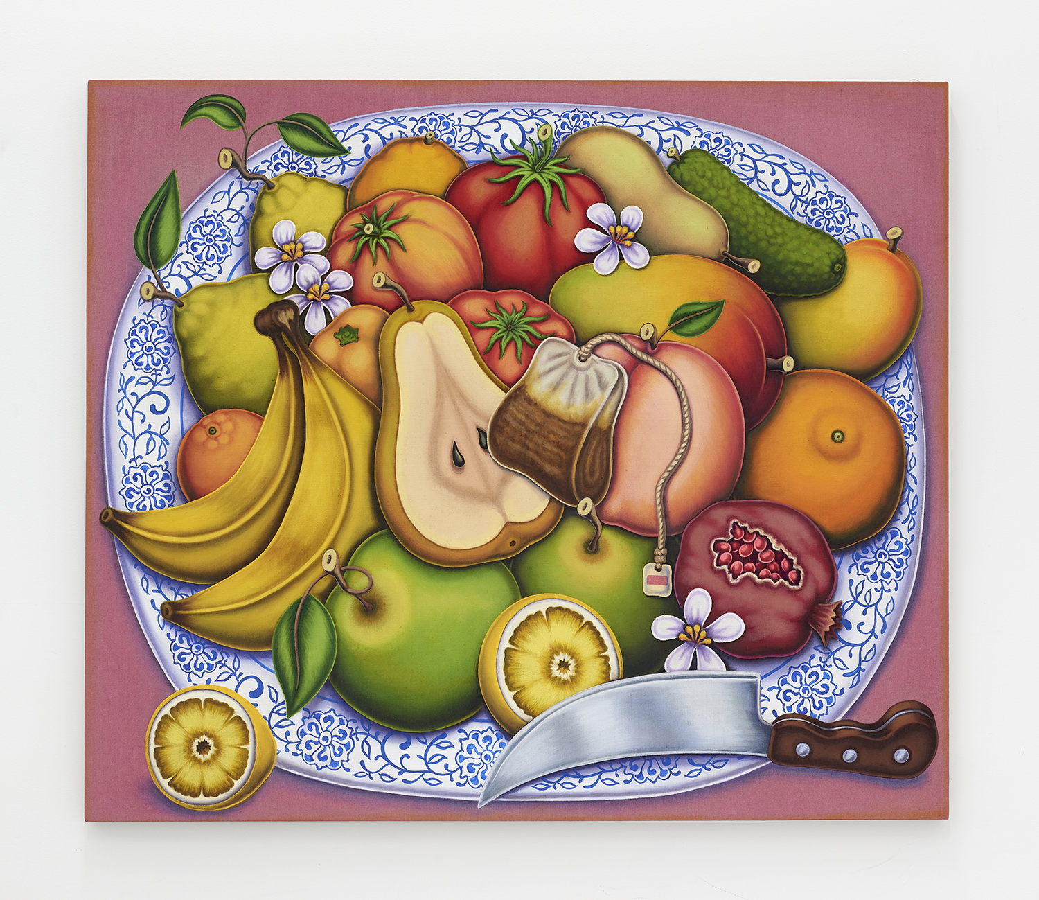Mainly comprising still life works, the exhibition chooses the French appellation for the pictorial genre to foreground literal “dead nature”, tracing themes of the global environmental crisis with subject matter ranging from turgid bouquets (Ivan Seal) and Holbein-inspired skulls (Robert Lazzarini) to a roasted duck on a hook (Stephanie H. Shih) and a melting garbage snowman (Theo A. Rosenblum and Chelsea Seltzer).