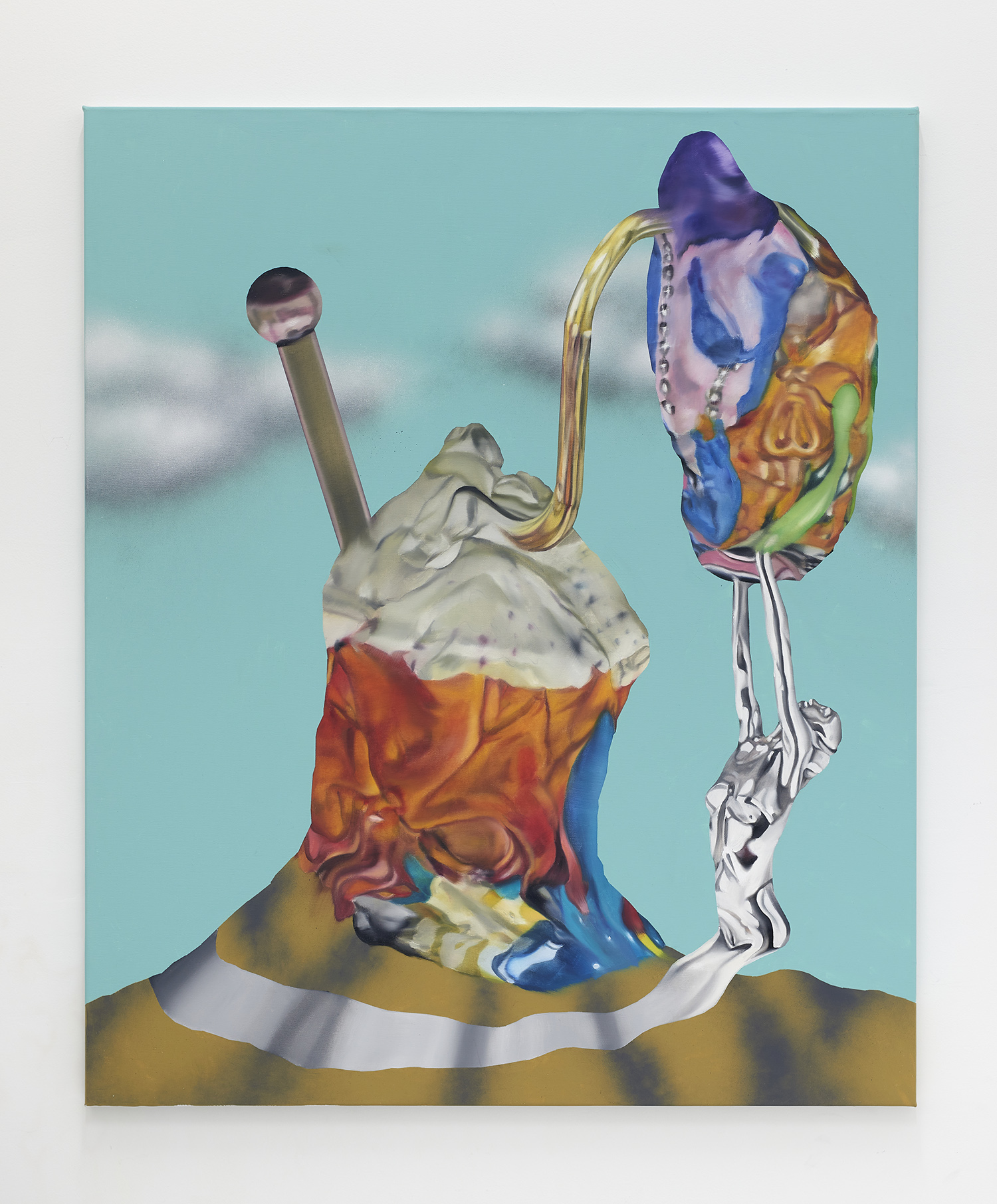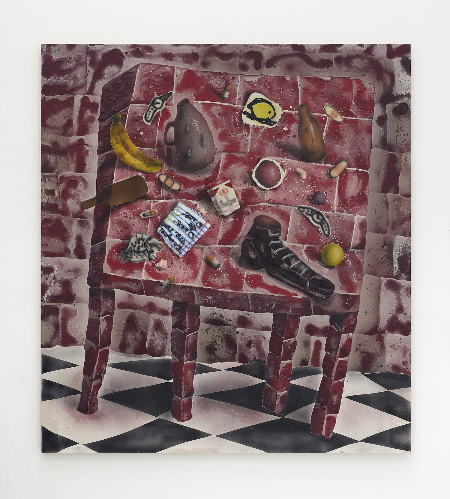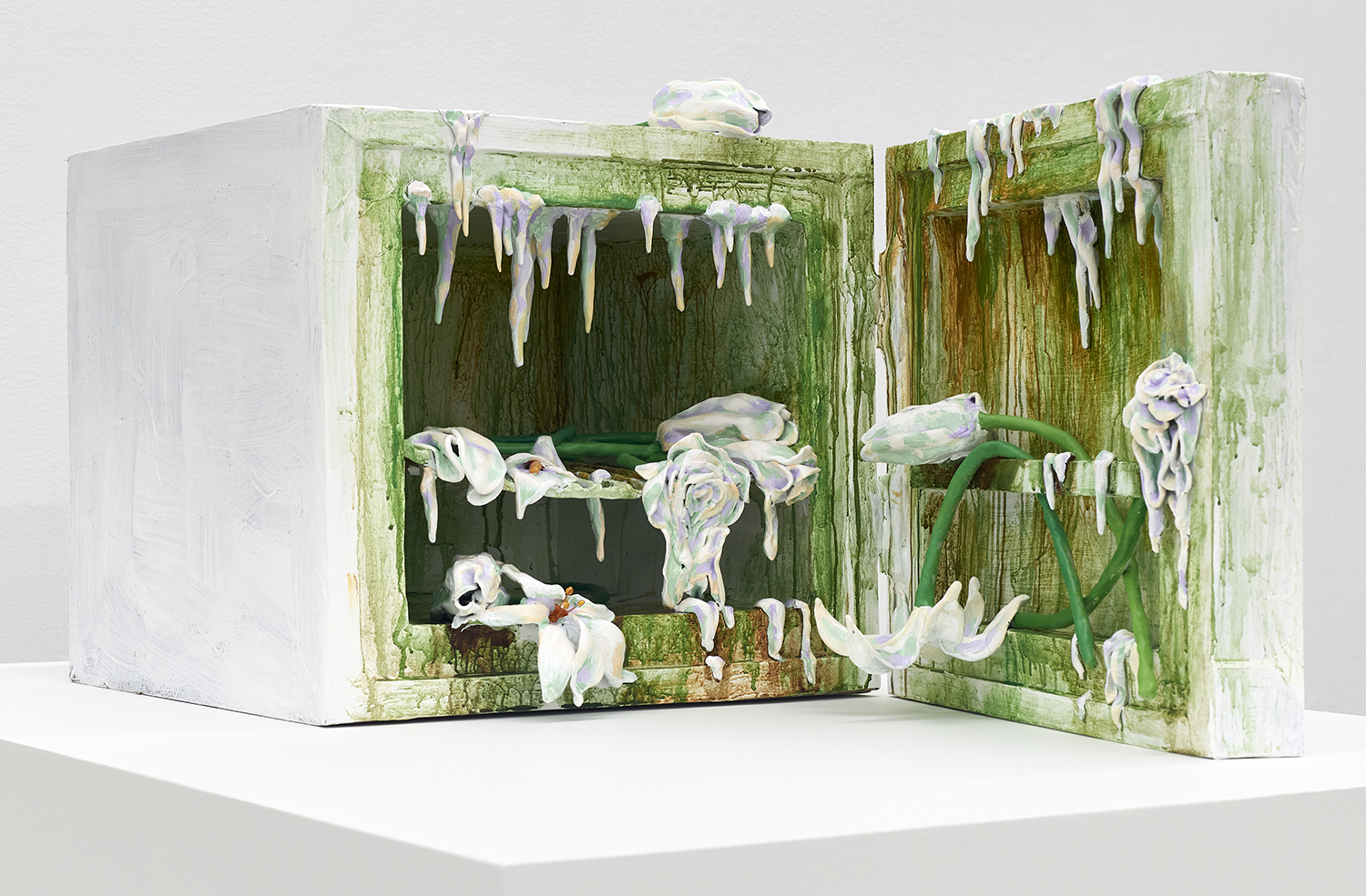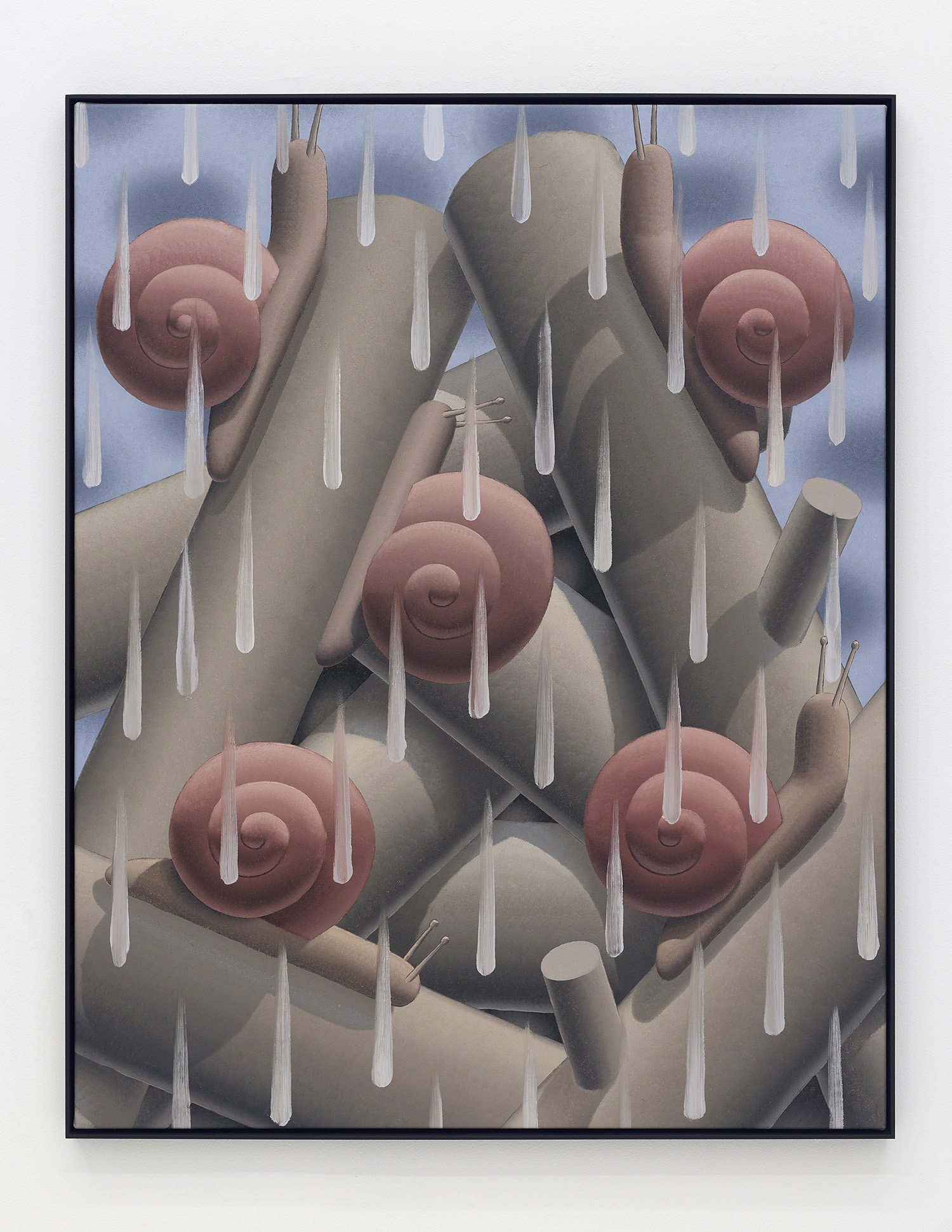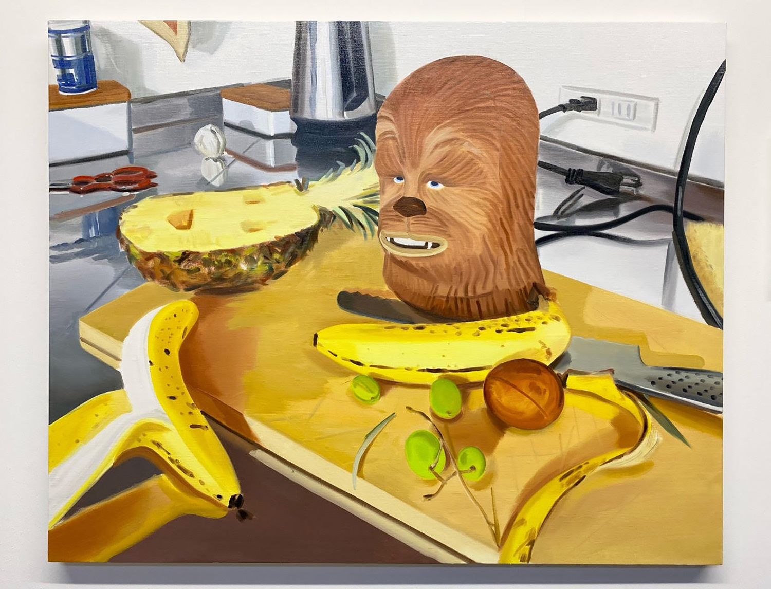 Mainly comprising still life works, the exhibition chooses the French appellation for the pictorial genre to foreground literal “dead nature”, tracing themes of the global environmental crisis with subject matter ranging from turgid bouquets (Ivan Seal) and Holbein-inspired skulls (Robert Lazzarini) to a roasted duck on a hook (Stephanie H. Shih) and a melting garbage snowman (Theo A. Rosenblum and Chelsea Seltzer).