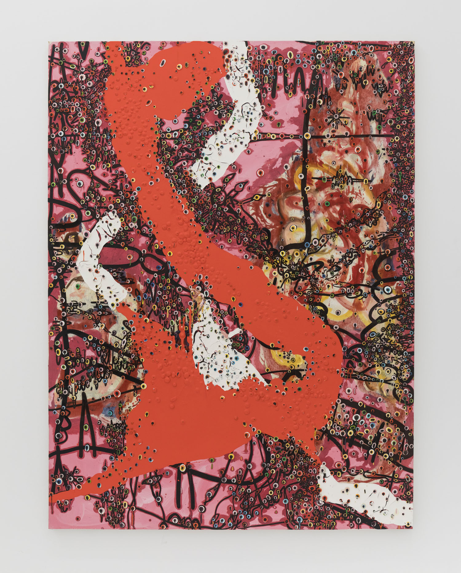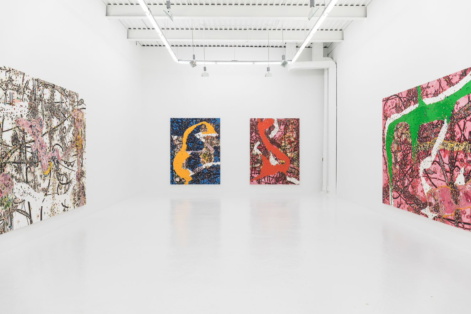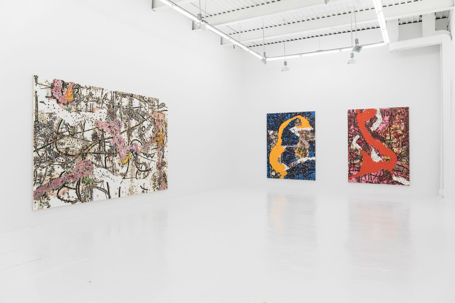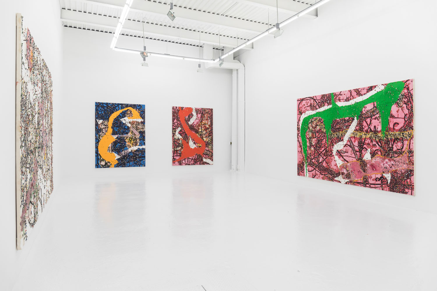 Since debuting his large-scale works in 2012, the artist has moved away from the stark black and white palette to integrate further hues and compositional complications. In 2014 he debuted a series of red-splashed canvasses at Casa del Popolo, artist Julian Schnabel’s dark wood-paneled ground floor gallery space. Here his signature protrusions of paint were both engulfed by and peeped out from the sloshing red flows across the surface in grand and dramatic fashion.