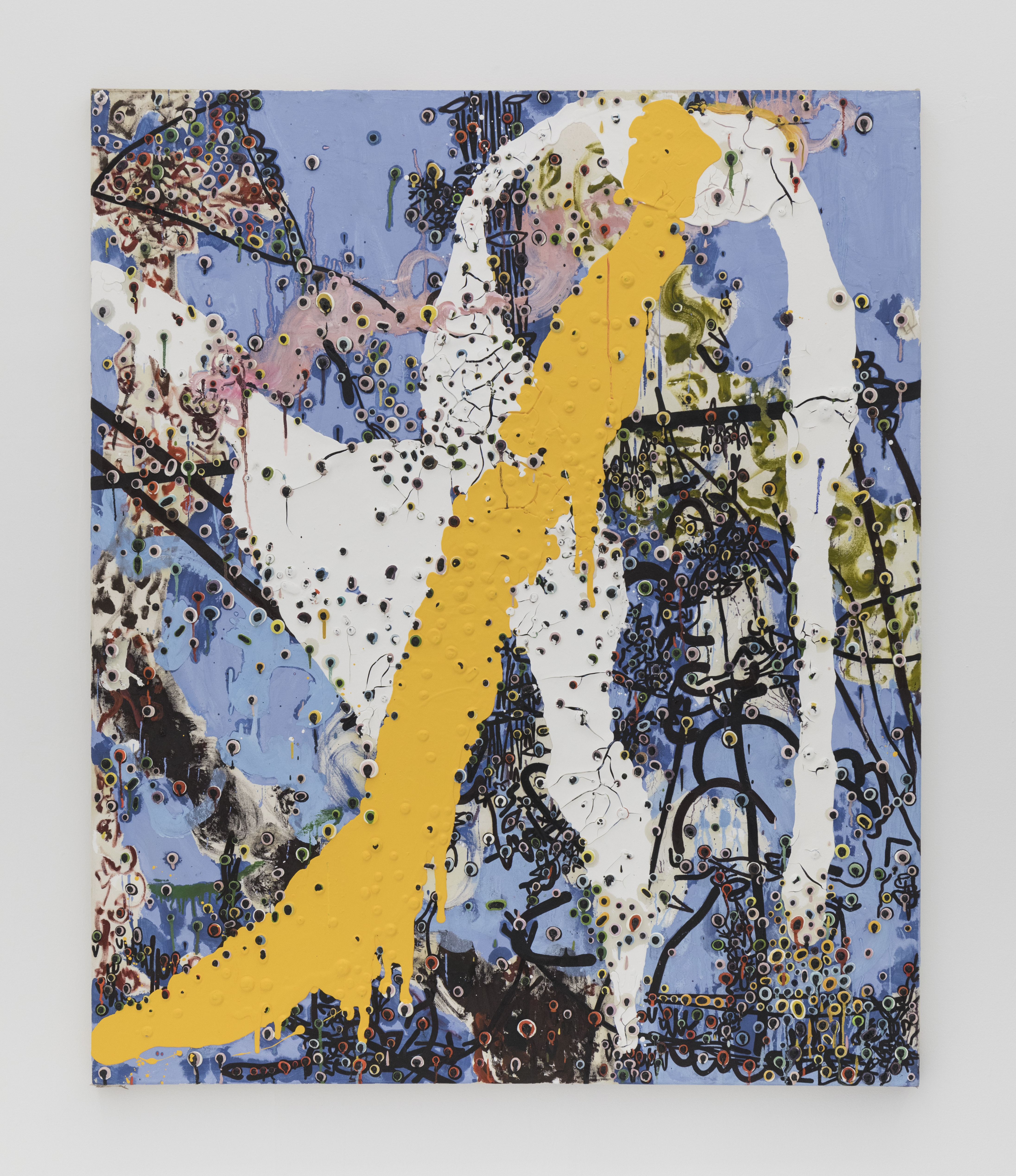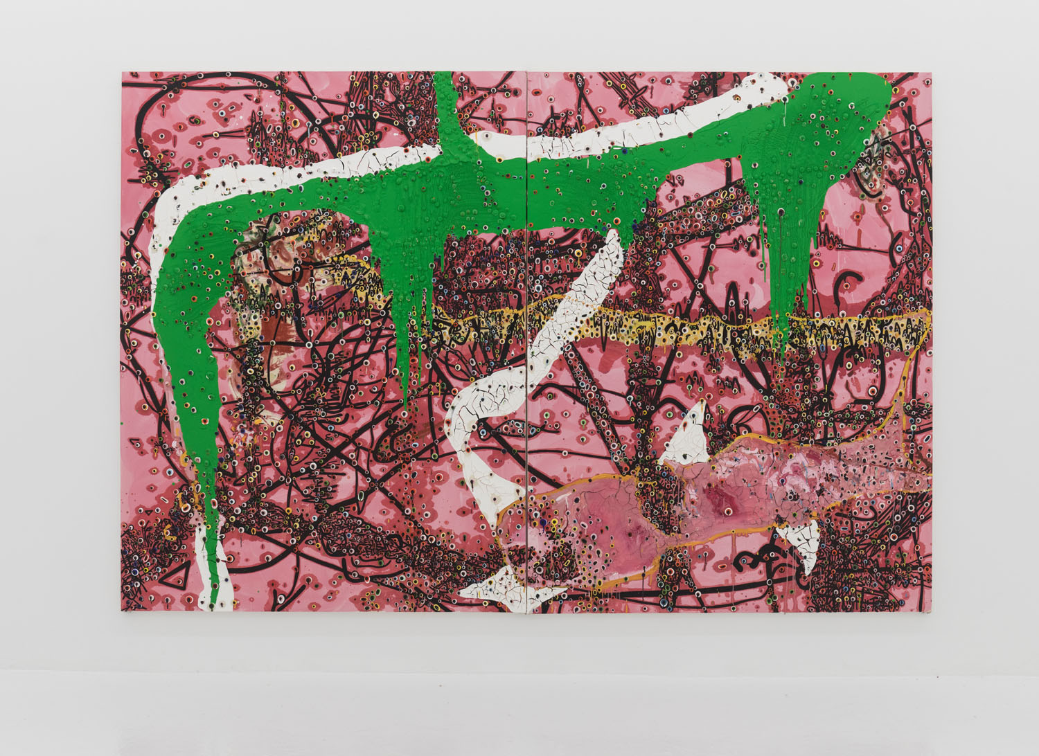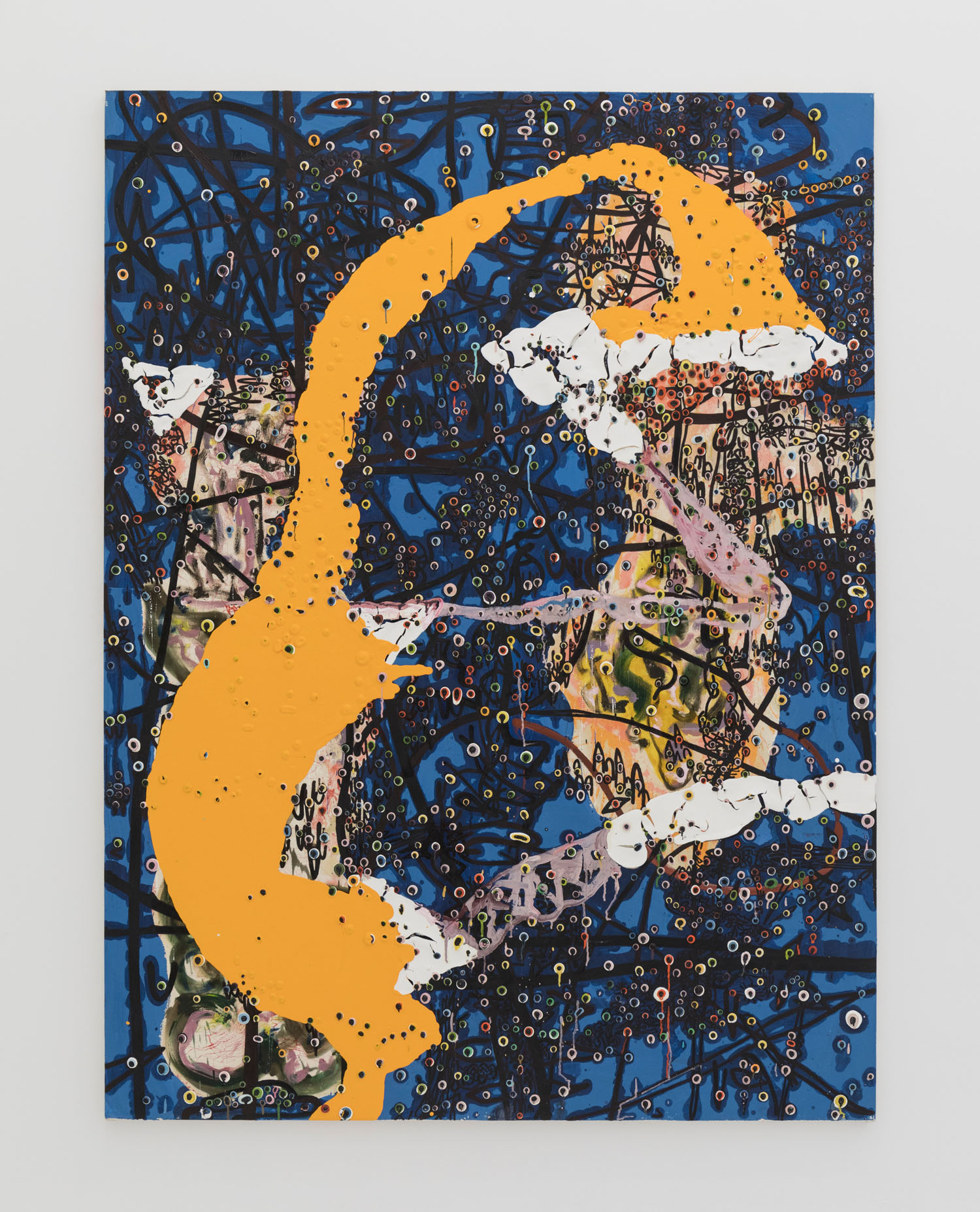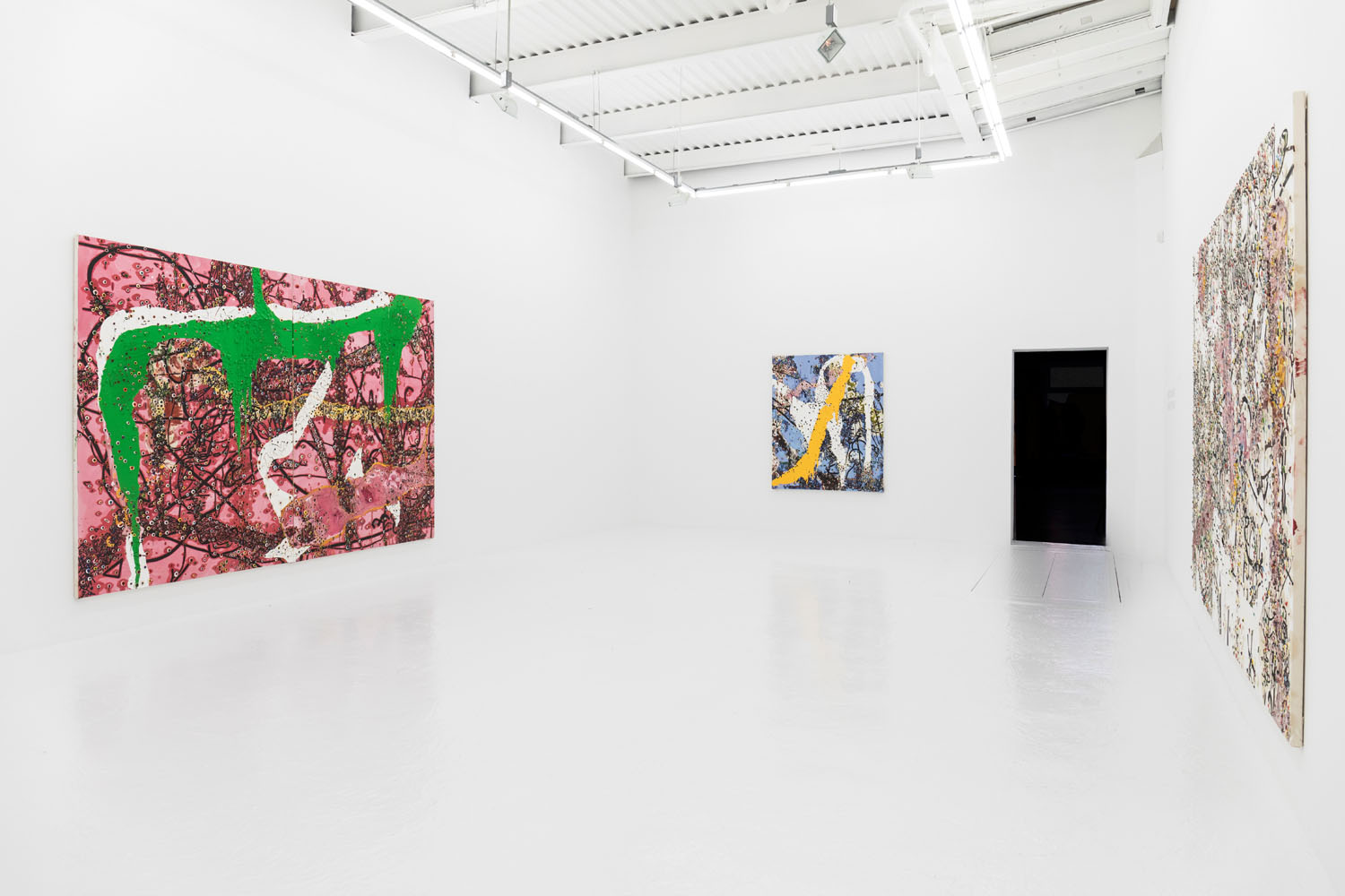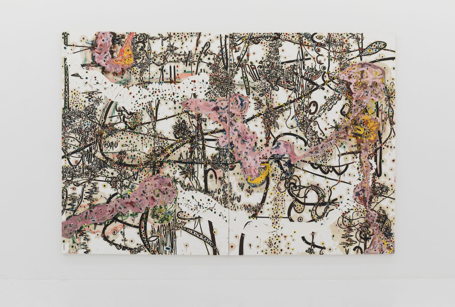 Since debuting his large-scale works in 2012, the artist has moved away from the stark black and white palette to integrate further hues and compositional complications. In 2014 he debuted a series of red-splashed canvasses at Casa del Popolo, artist Julian Schnabel’s dark wood-paneled ground floor gallery space. Here his signature protrusions of paint were both engulfed by and peeped out from the sloshing red flows across the surface in grand and dramatic fashion.