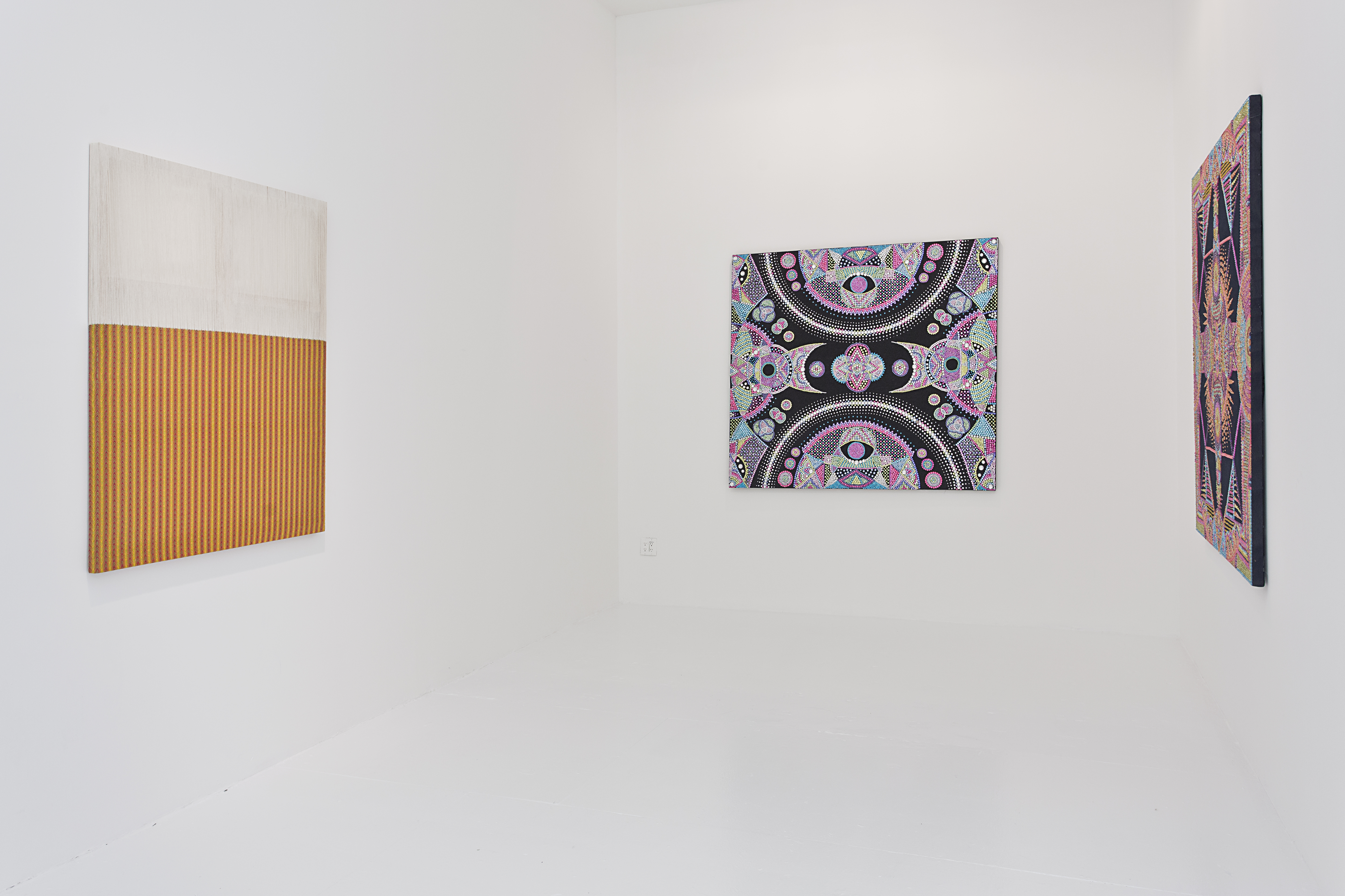 In fact all the works here tempt us to approach them and read them as paintings, but all somehow confound us. Bob Eikelboom composes his painting with magnets, Evie Falci with rhinestones, Gabriel Pionkowski woven with painted threads. Nick Theobald’s luminous compositions are created by wax and Will Stewart’s with glue. Juni Figueroa arranges clothes in a white window blind system to create a very memorable send up of “high art,” specifically abstract painting, with this “tropical readymade.”