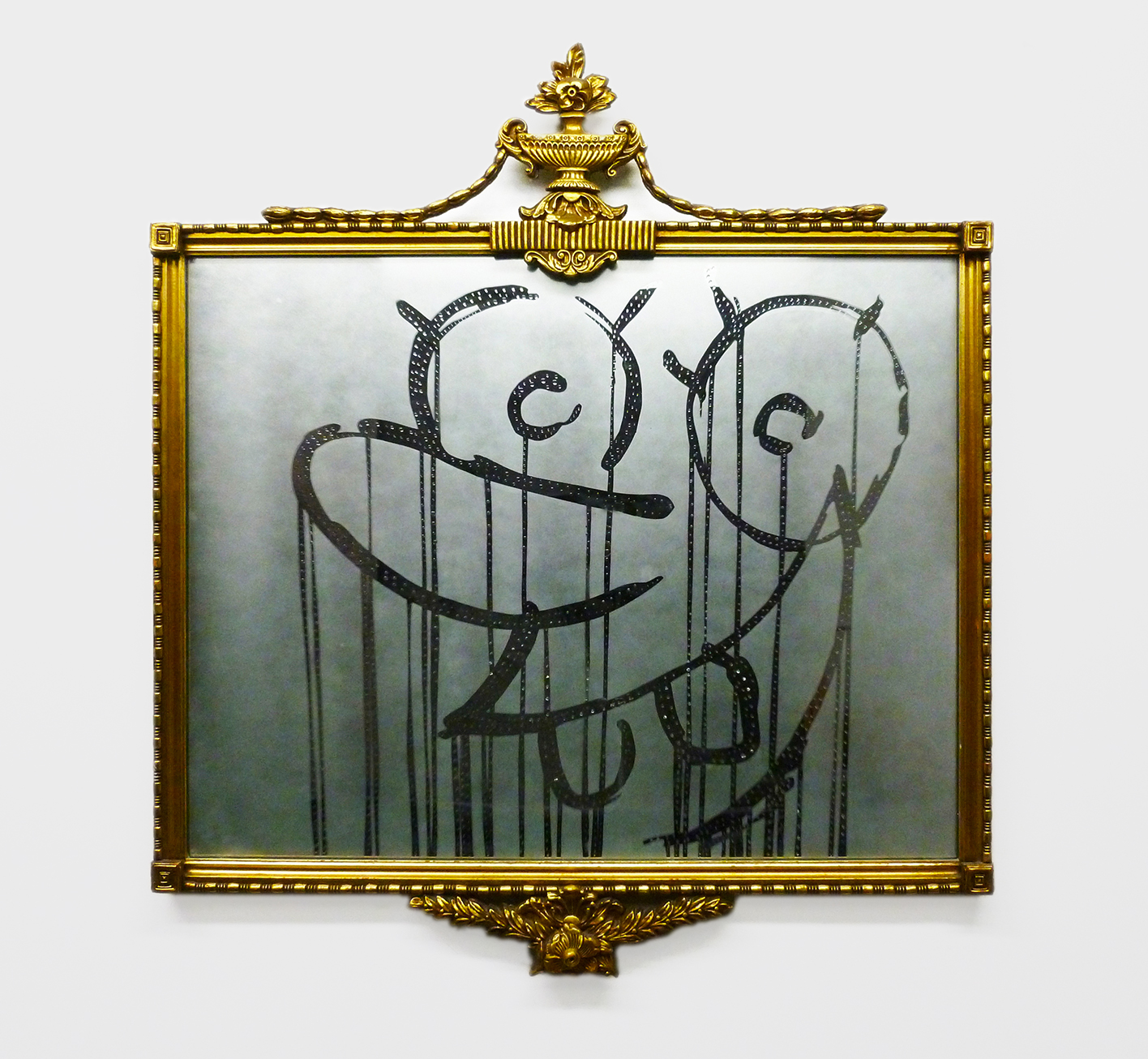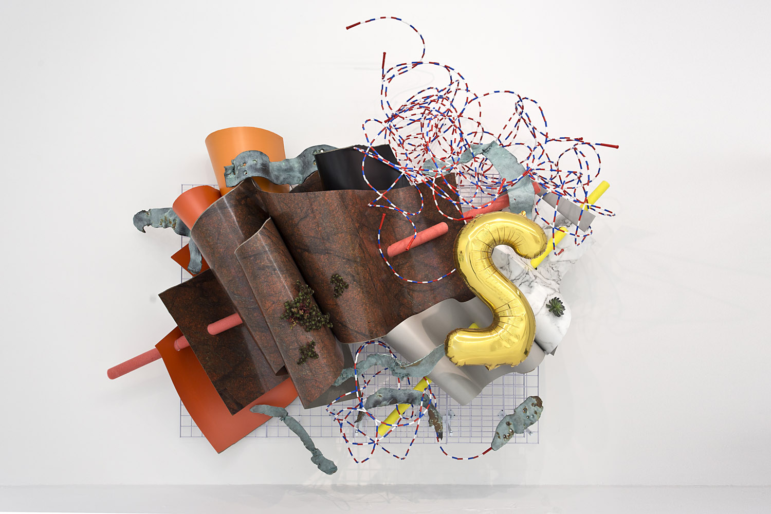 Adam Parker Smith, in two unavoidable pieces, weaves the tackiest and fakest materials (and handmade imitations thereof) through a retail-looking metal rack armature hung on the wall. The positioning of these materials amidst and throughout the armature creates depth but also color, energy and motion; content, narrative, all the things we bring as viewers to a traditional painting, but here in an ersatz way.